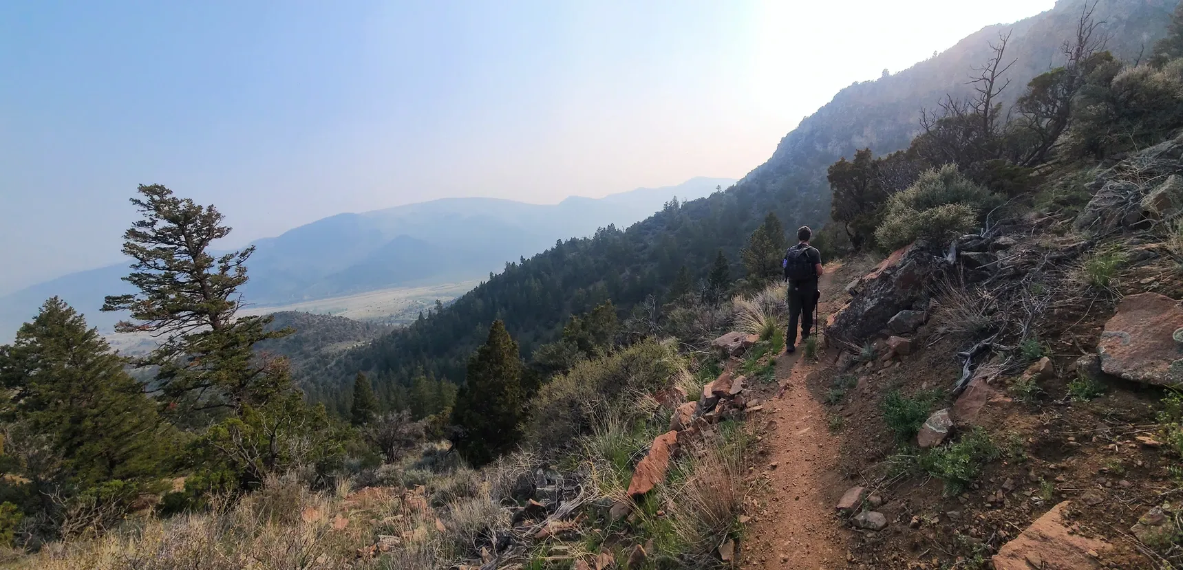 Once back in the daylight, Bill let us into the booth, now closed for the day, to grab our stuff, and we spent a few minutes chatting with him about his life before he became a guide. A consummate outdoorsman, he found his way into retirement by volunteering at Rocky Mountain National Park, and then later working two days a week offering tours here at the caverns. We grabbed our gear and said bye to Bill and all the other rangers and workers who were closing the gate to the visitor center lot, and we made our way over to the East Side Trailhead, which would bring us to the juncture with our primary trail down, the Middle View Trail. This trail took us along a ridge and gave us outstanding views of the mountains as well as the campground. We got to see Buggy from above, sitting happily in his luxurious, grassy campsite. On the last leg of our hike, we took the other end of the Danmore Gypsum Mine Trail, which brought us back to the campground.
