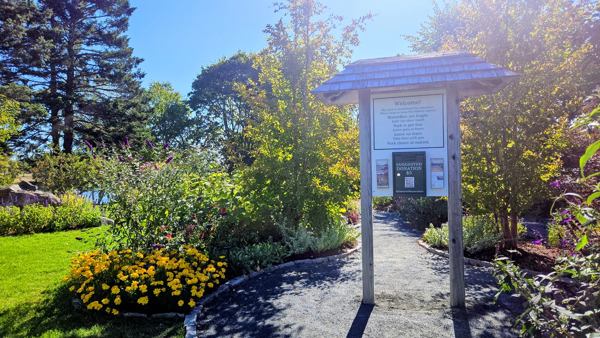 I mentioned in the last post that we were 12 minutes from Bass Harbor Head Lighthouse, which is technically a national park site. Same with Echo Lake Beach, which we actually had walking access to from our campground, but it was much quicker and easier to drive up the street. Aside from the NPS-owned sites, Southwest Harbor has lots of little gems. One morning before we met up with our friends, Anthony and I ventured down to Milagro Coffee Bar for breakfast and coffee, which we then took across the street to the Charlotte Rhoades Butterfly Park. The food and coffee were decent, made better by the beautiful scenery of the butterfly garden. We took a stroll among the flowers and had a lovely chat with the docent, Sarah. September is too late in the season to see most of the butterflies, but many of the flowers and herbs were in full bloom. This was a nice, relaxing start to our morning and gave us a glimpse into local culture in Southwest Harbor.