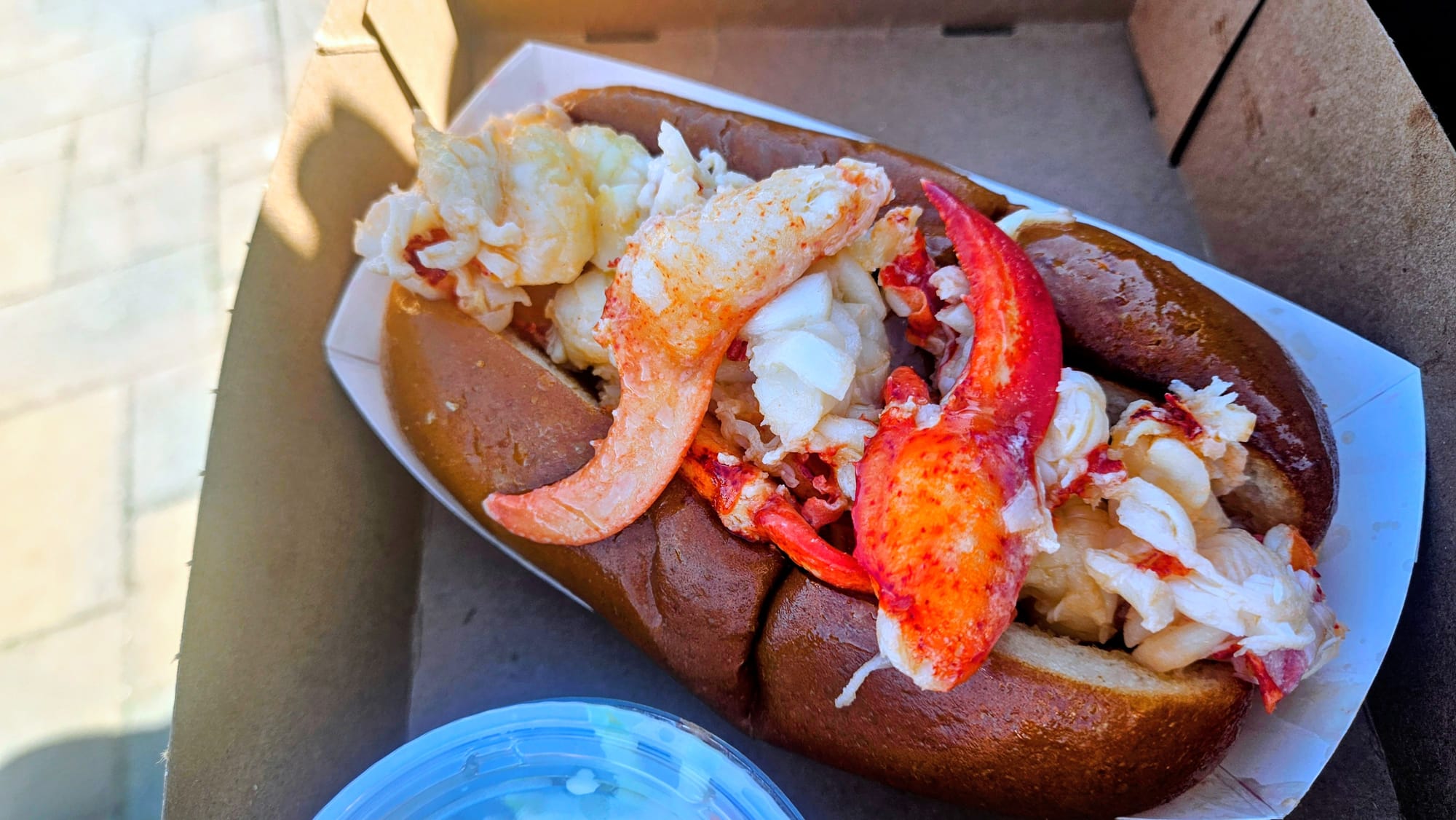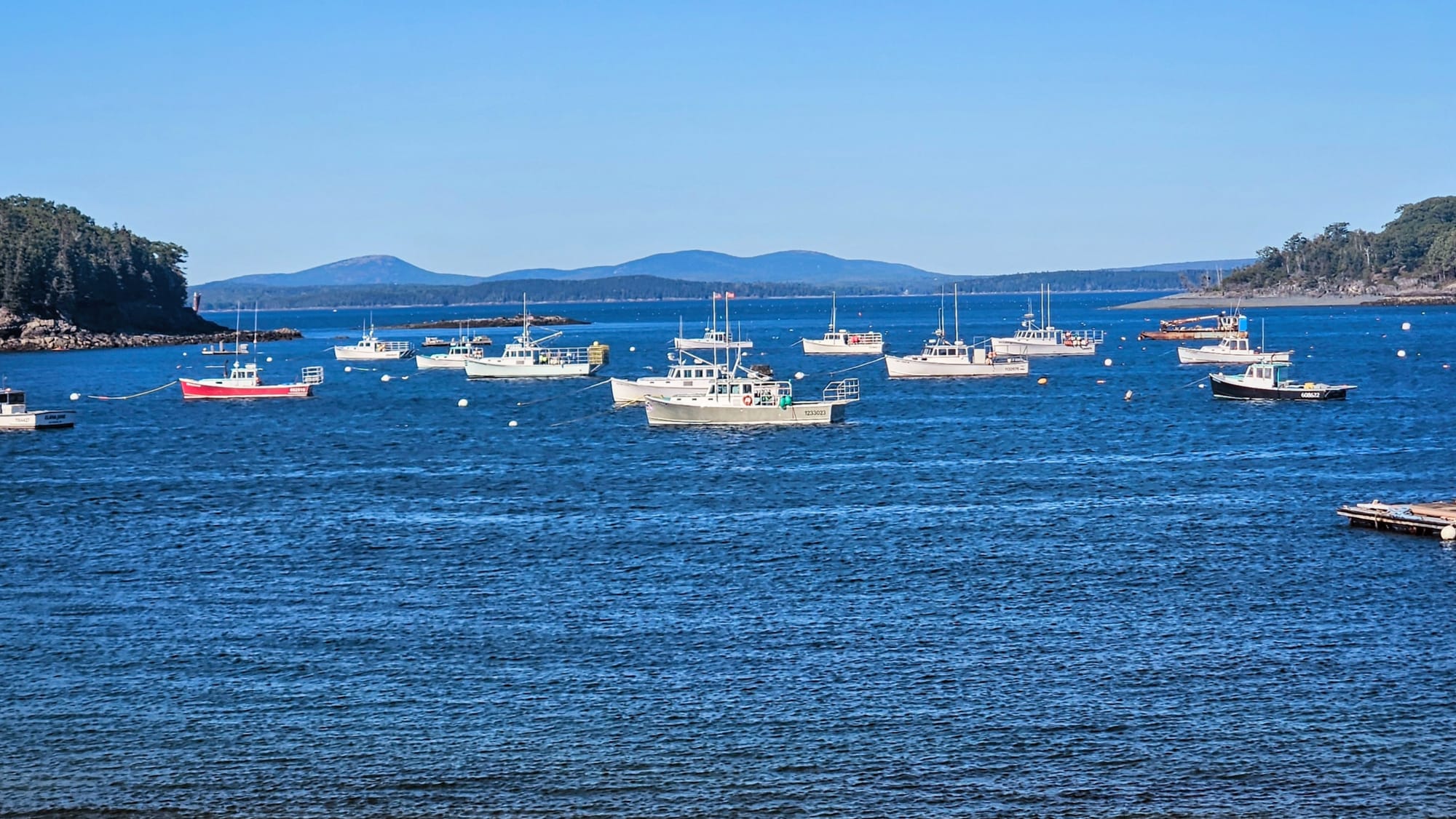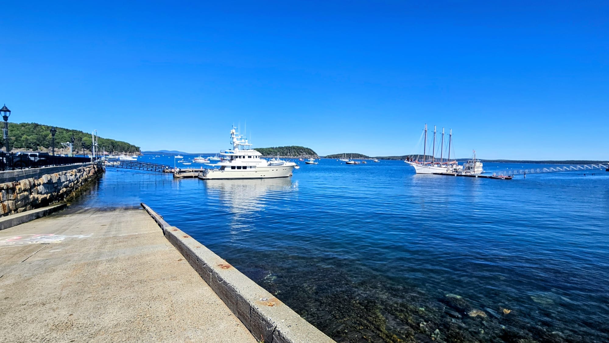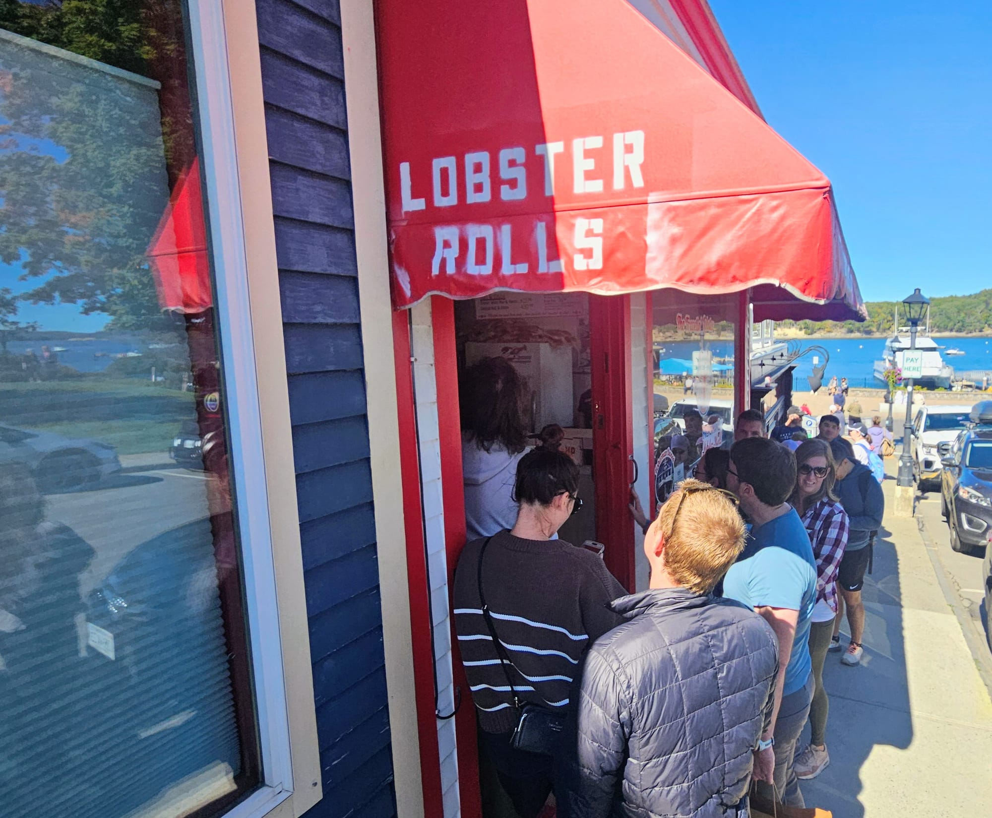Walking from the Village Square, we were greeted by distant views of the blue water of the harbor and marina, and the wafting aromas of butter, seafood, and toast. That can only mean one thing: lobster rolls! Really, can one go to Bar Harbor and not get a lobster roll? I mean, I can, since I don't eat them, but I gladly joined my friends and soaked in the experience vicariously. There is no shortage of places to get lobster rolls in this town, but we settled on The Travelin Lobster, mostly because their menu was more expansive than just lobster. Turns out there are 2 locations, and the Bar Harbor one had a more limited menu, but I was still able to find something to eat. My group said the lobster rolls were good, and the line to order food got pretty long while we were there. Expect to pay premium prices for lobster rolls around here, but it's an experience. The restaurant is just a hole-in-the-wall with a counter and no seating, and so we took our food down to the harbor and ate with water views. After that, we walked up the street to look at the boats.