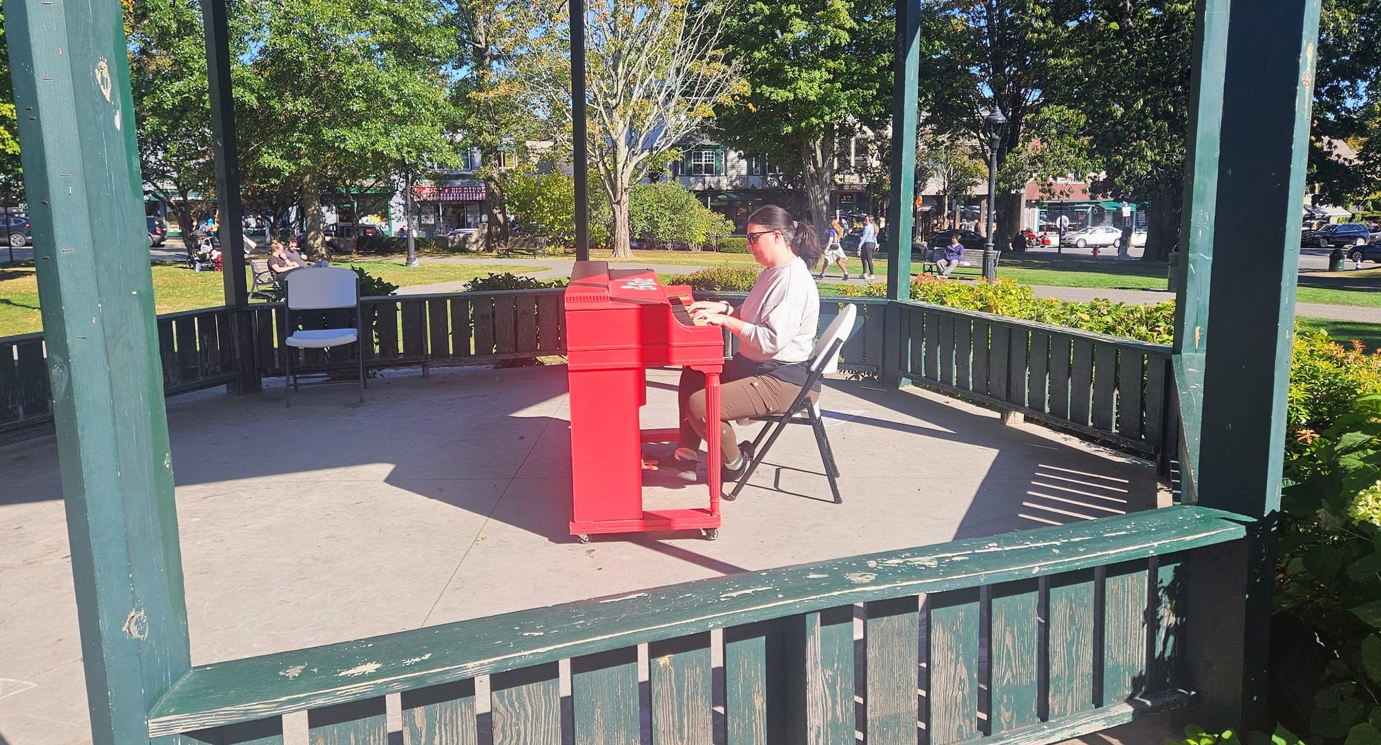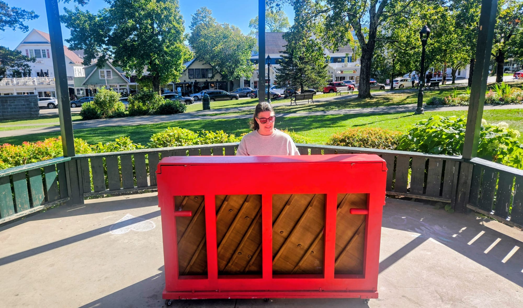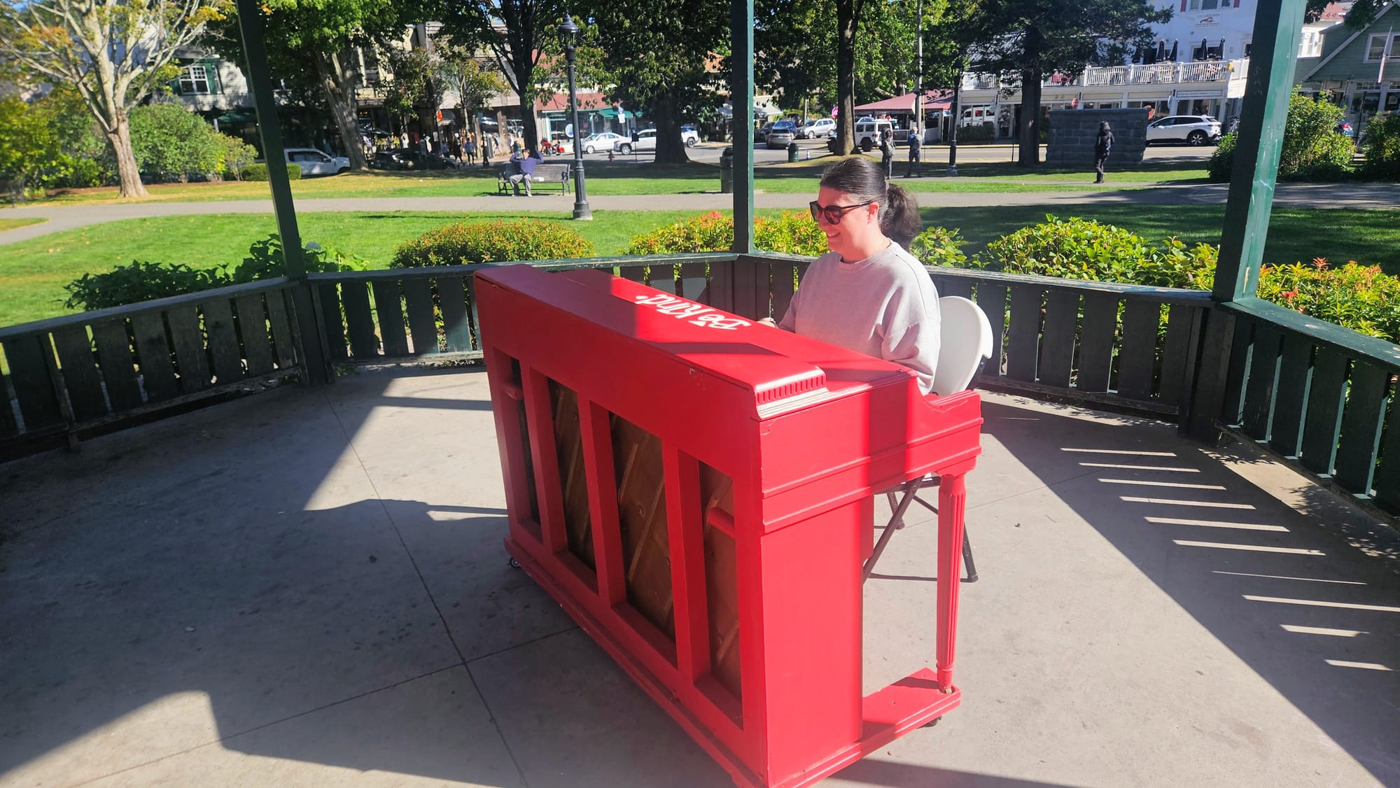 Our friends headed back to the campground with the kiddos, and Anthony and I stuck around for a little while, popping into more shops and taking a look at the trolley tours offered around town. We're putting a trolley tour on our list for next time. Then we hung out in the Village Square while we waited for our shuttle to arrive. The gazebo has a piano open to the public, and I always take advantage when I find one. It's been fun to see the various states of (dis)repair of different pianos that we come across in our travels. This one was in disarray, with out-of-tune notes, coating stripped from the keys, and a far-too-low chair. I did the best I could given the circumstances, but didn't attract a crowd this time. The square was pretty empty at that point. Not every experience can be the San Francisco Botanical Garden, now can it?