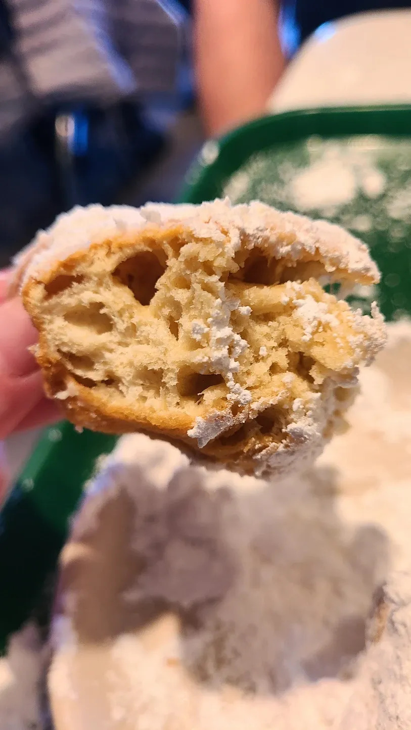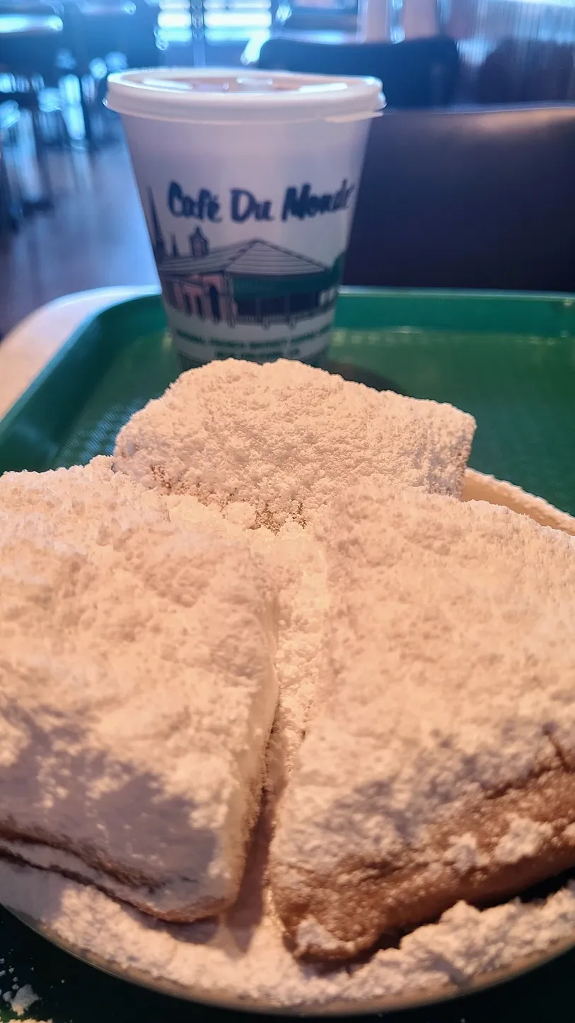After Vue, we spent some time walking around Canal Street and the outlets. We decided to get our beignet fix at the Café du Monde on the Riverwalk instead of waiting until we were at the original location in the French Quarter. Our first New Orleans official beignet experience was interesting. We've had a lot of beignets and similar foods, and they've always been light and fluffy dough. These beignets were quite dense. They were delicious nonetheless, but we were perplexed because we always assumed they were supposed to be like pillows. Was it this location, this particular batch of dough, or are traditional beignets actually less fluffy than we expected? One thing we did expect, though, was the explosive amount of powdered sugar sprinkled on top.