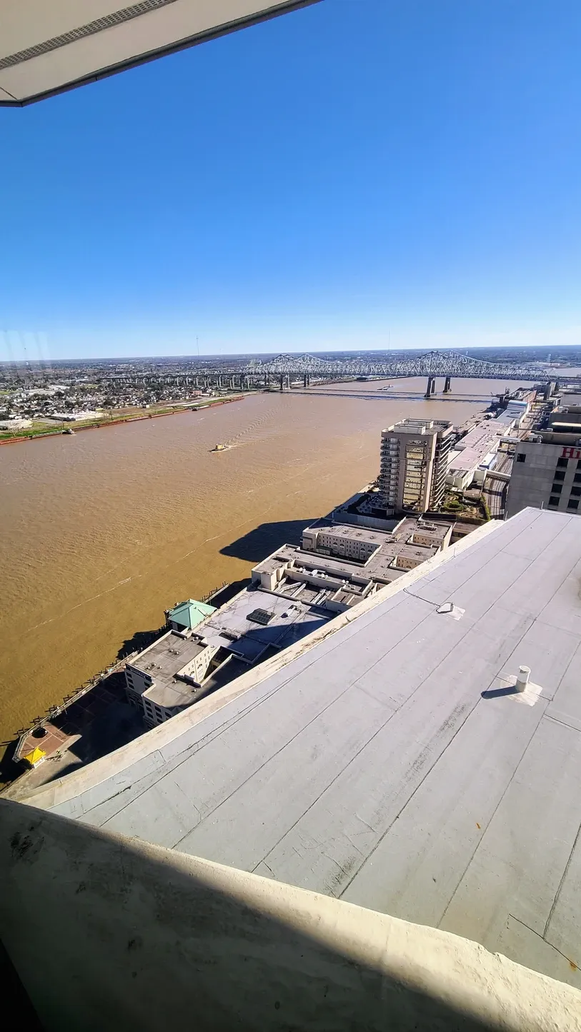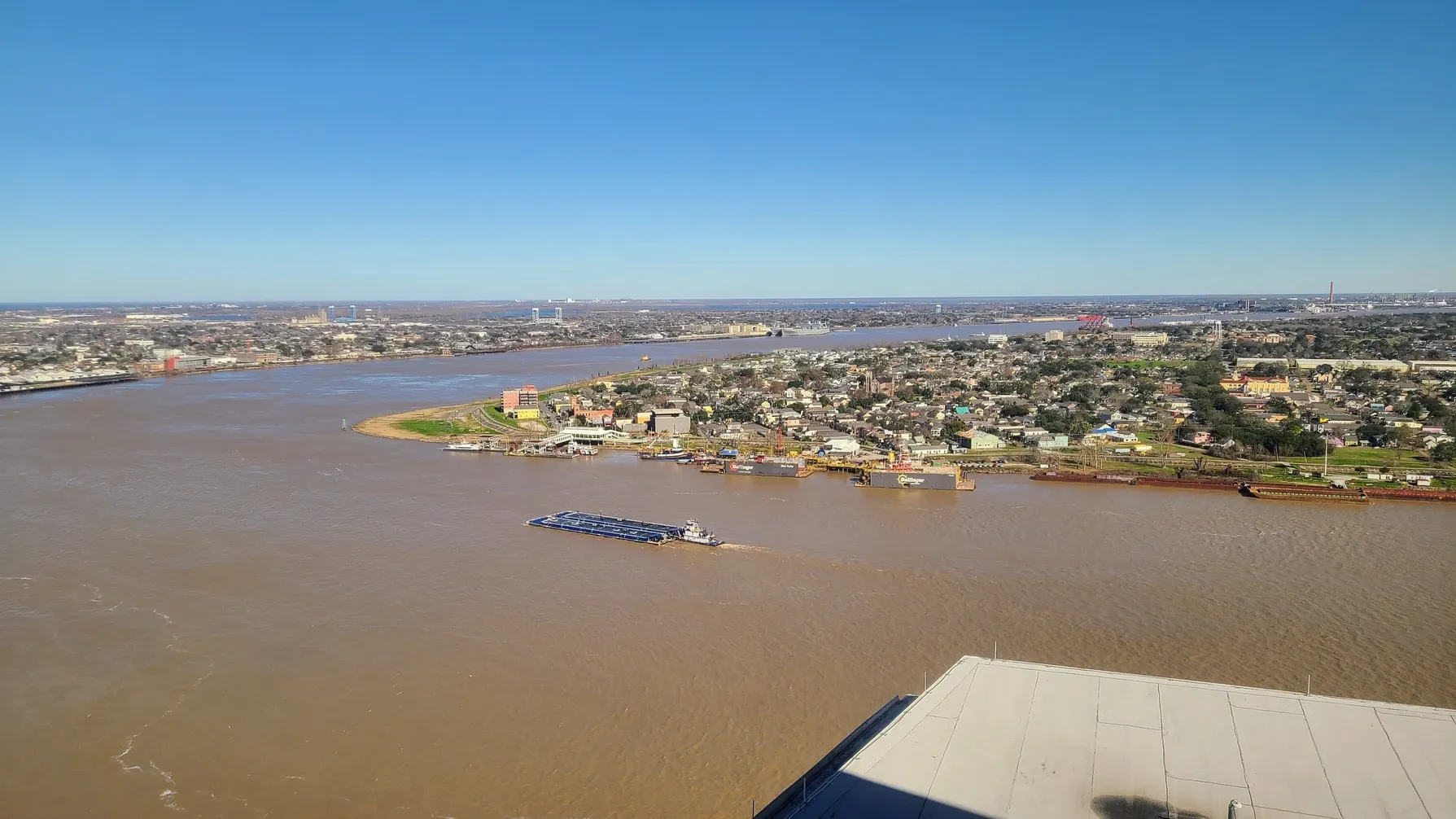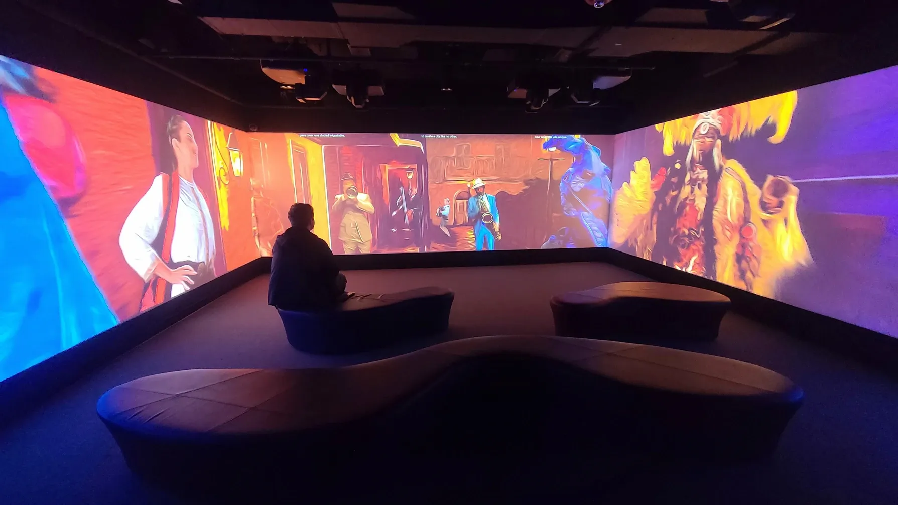 We got great advice on Instagram to park in the Basin Lot on St. Louis Street, which was only $5 for 10 hours and $10 for a full day, had tons of parking, and even allows RVs for $50! The actual inner city RV park is up the street. This parking lot also happened to be recommended by the City Sightseeing Tours, and our hop-on/hop-off tour had a ticket agent and pick-up spot right across the street. We got on and took the bus - a double decker with an open-air top - two stops to the Riverwalk. This area has ferries and boat cruises along the Mississippi, outlet stores, the Harrah's Casino (soon to be Caesars...you heard it here first), and the walk itself along the riverbank. We went for a different reason: Vue Orleans. I had been getting endless NOLA-related ads since arriving to the area, which is weird because usually my ad content is about 3 weeks behind the location I'm actually in. Granted, I was still getting Myrtle Beach ads too, but clearly the NOLA ones were way more useful. Anyway, Vue Orleans came up and I thought it looked cool. I read a couple of things on the website and determined that it was an observatory on the 33rd floor of one of the hotels, and it had exhibits with information about the city. My initial research didn't do this place justice. There are 3 floors of exhibits, and they're all modern, interactive multimedia presentations. On the first floor, you learn about the famous people who make up the history of the city, and there is also a board to learn about the most essential parts of the city - buildings, landmarks, celebrations, and more. All the interactions are touchless. You just gesture to the screen and it picks up your motion. Also on the first floor are exhibits on costumes (where we got to virtually dress ourselves), food, and music. Down the hall was a theater area that showed a film on a 270-degree screen, surrounding us on the left, front, and right sides.