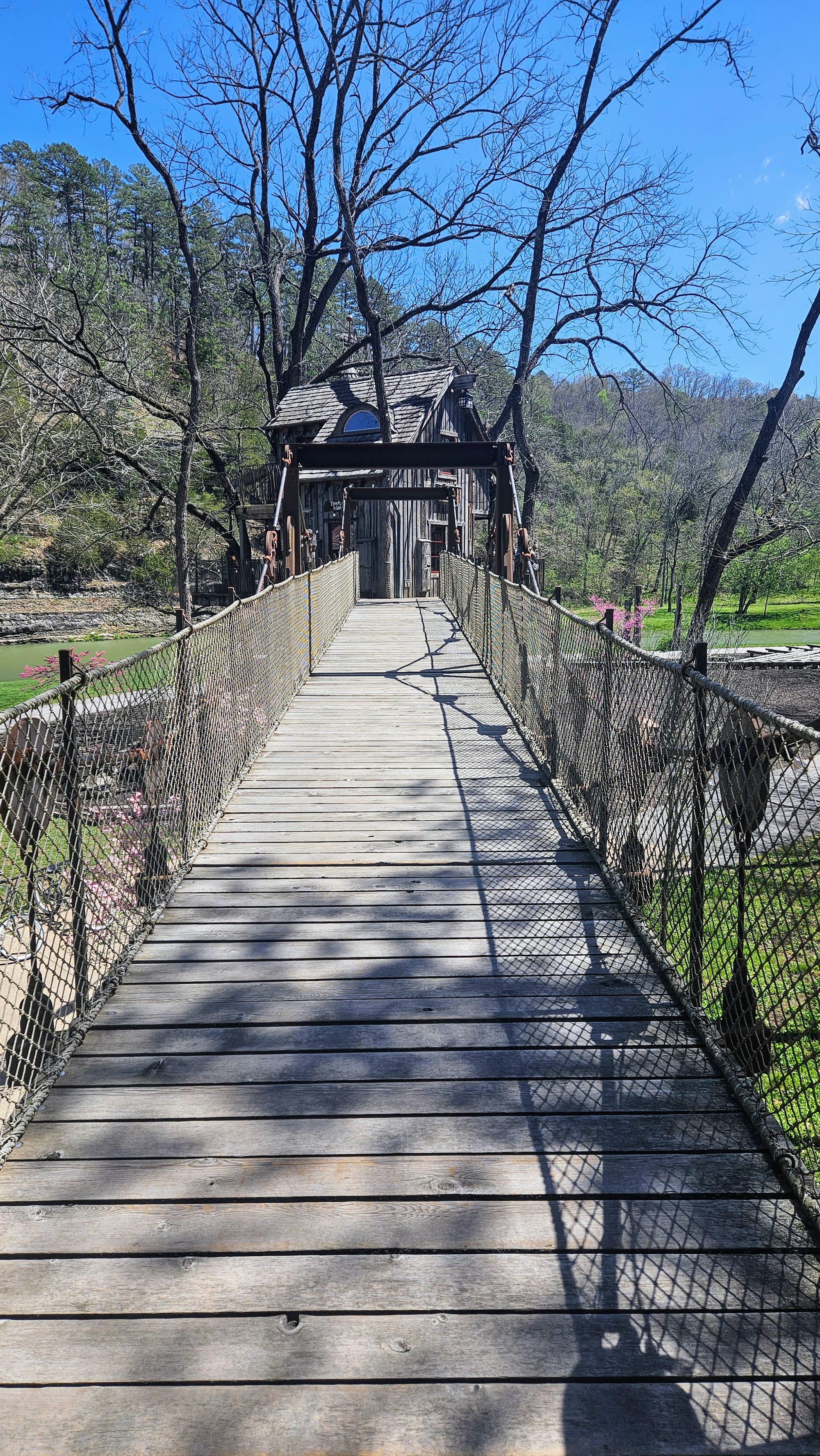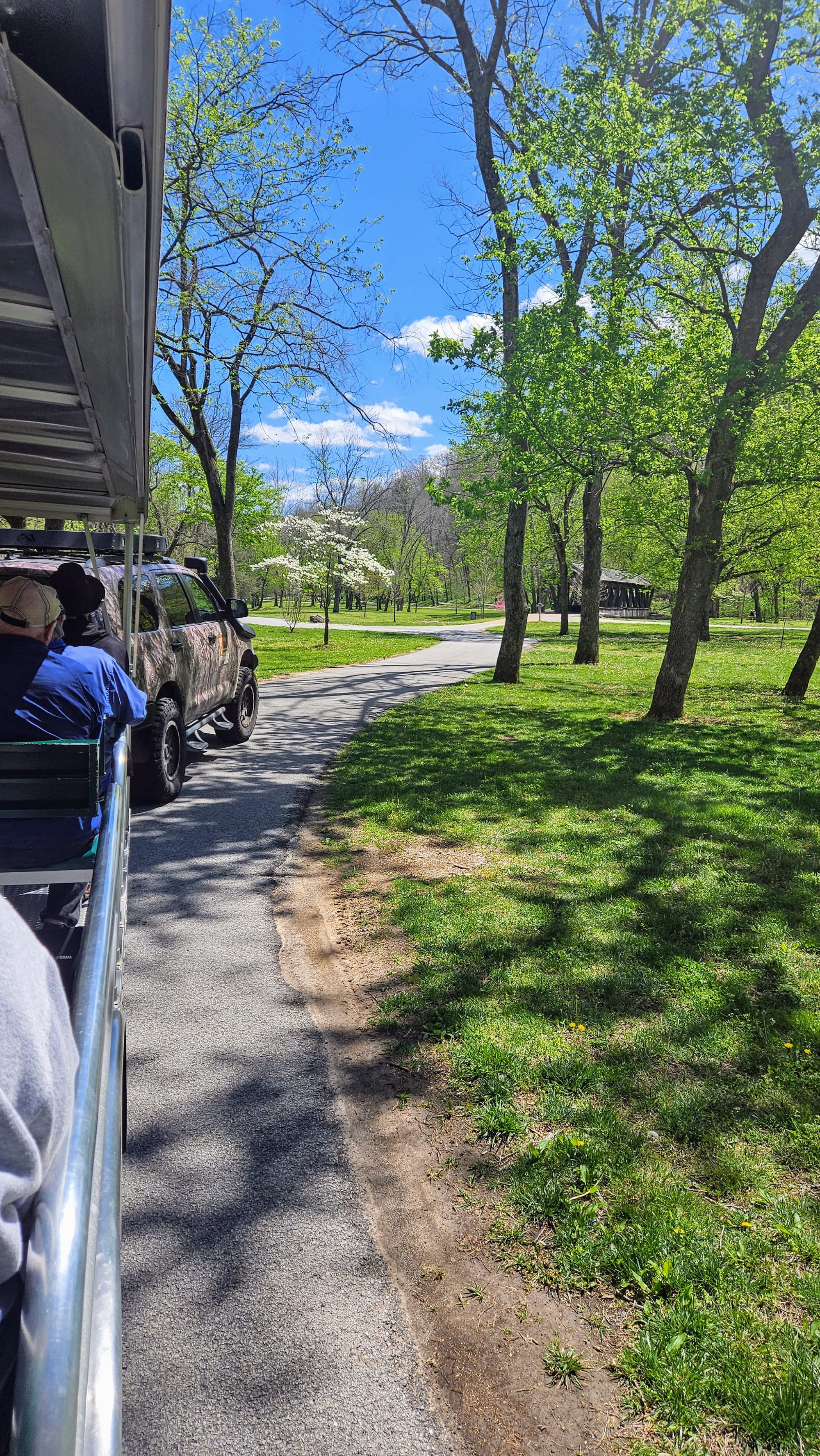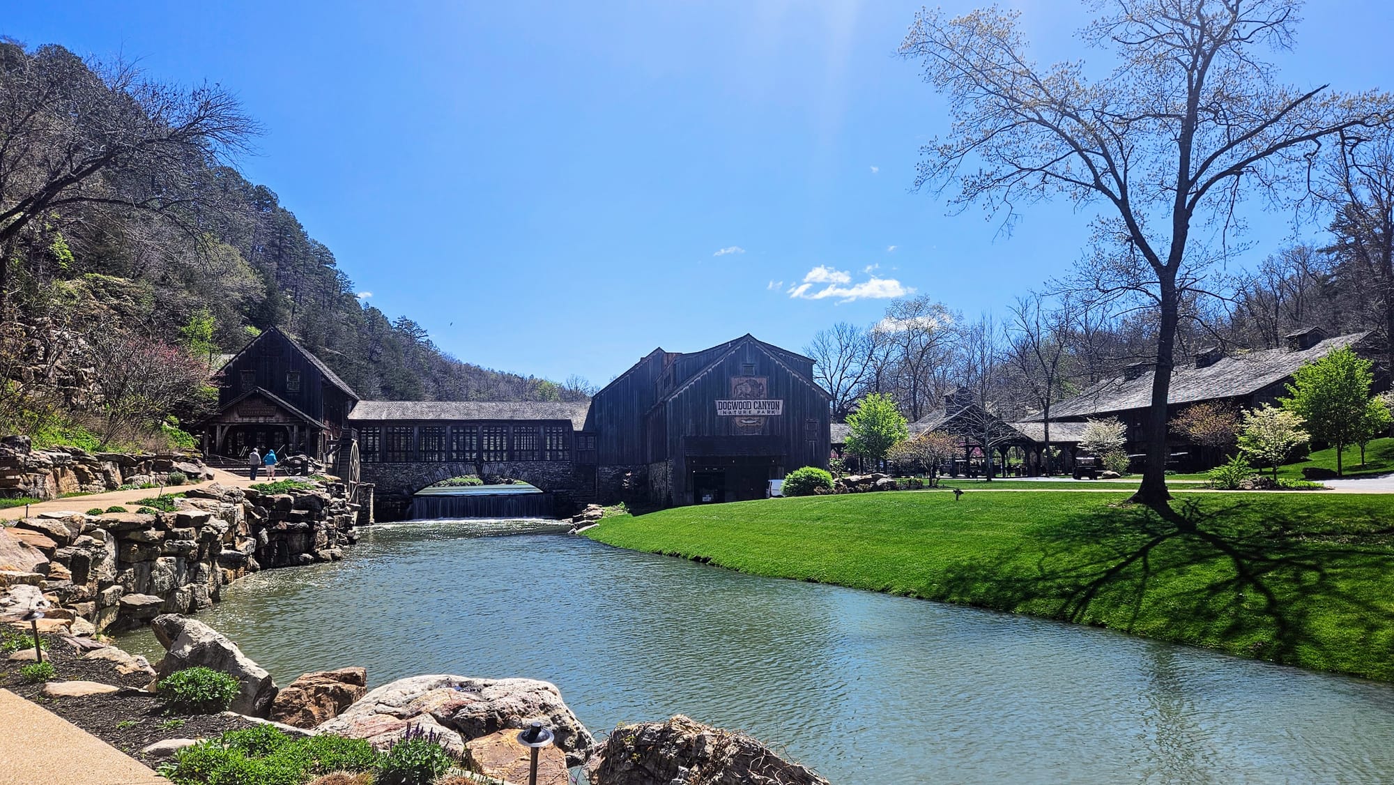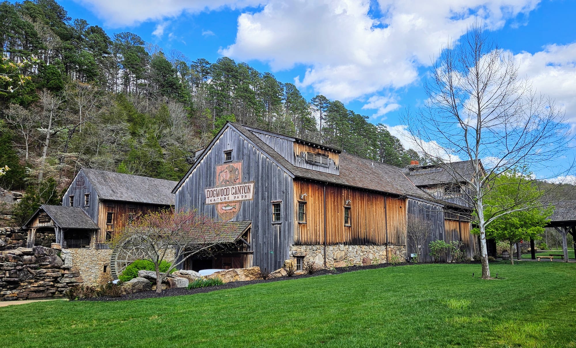 Our first full day was rainy, but that gave us time to get work done before our adventures. The following day, the sun came out and gifted us a perfect spring day. Instead of going to Branson right away, we went to the town of Lampe, home of Dogwood Canyon Nature Park. The park is a 10,000-acre nature preserve with some unique features, including a wildlife sanctuary, grist mill, treehouse, restaurant, and gallery exhibiting Native American and Civil War relics. We were able to see most of these with a general admission ticket, but we purchased an add-on, a 2-hour tram tour through the entire preserve, including the wildlife pasture which is otherwise not accessible to visitors.