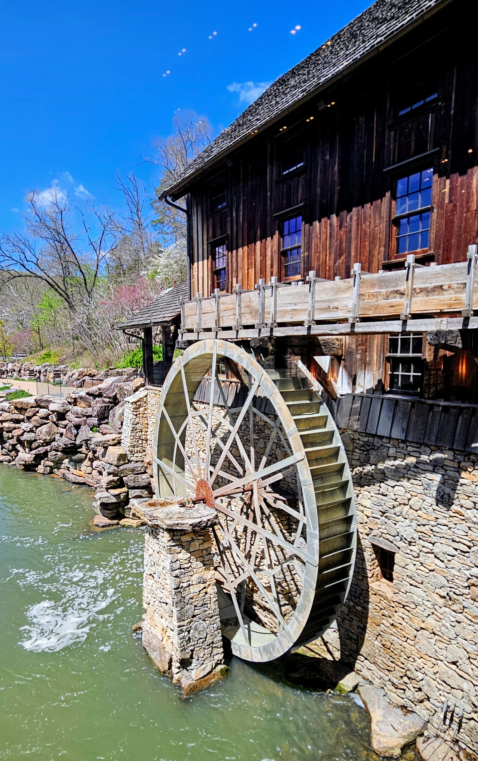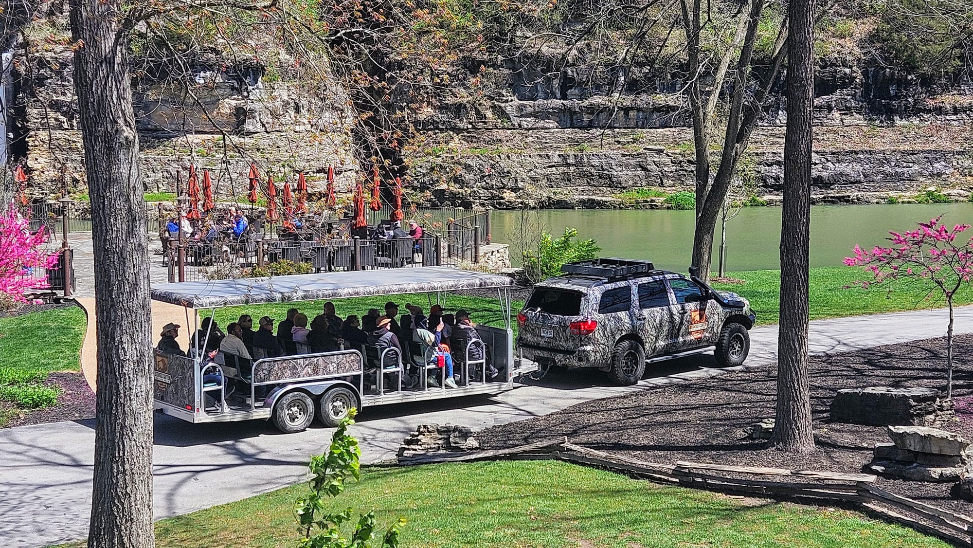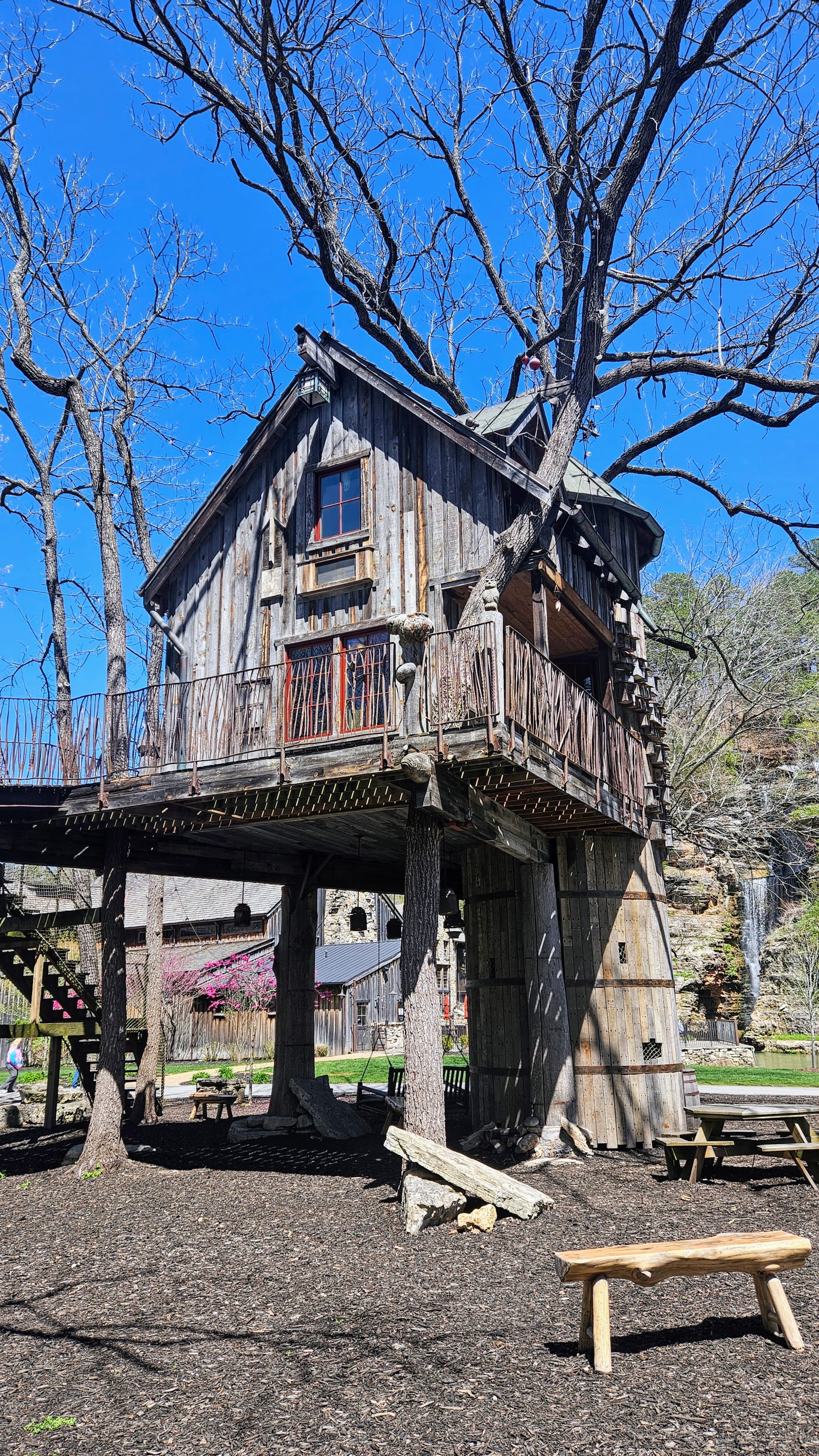 Our first full day was rainy, but that gave us time to get work done before our adventures. The following day, the sun came out and gifted us a perfect spring day. Instead of going to Branson right away, we went to the town of Lampe, home of Dogwood Canyon Nature Park. The park is a 10,000-acre nature preserve with some unique features, including a wildlife sanctuary, grist mill, treehouse, restaurant, and gallery exhibiting Native American and Civil War relics. We were able to see most of these with a general admission ticket, but we purchased an add-on, a 2-hour tram tour through the entire preserve, including the wildlife pasture which is otherwise not accessible to visitors.