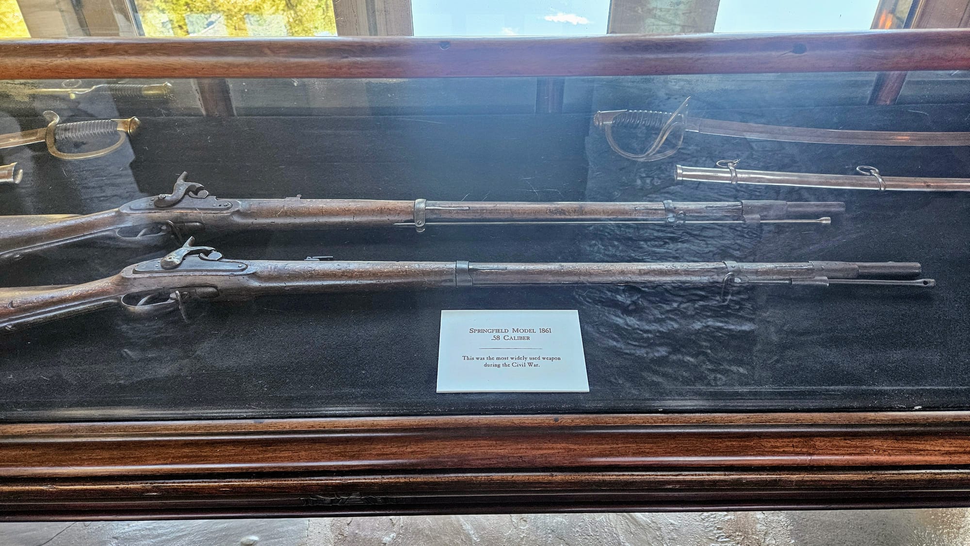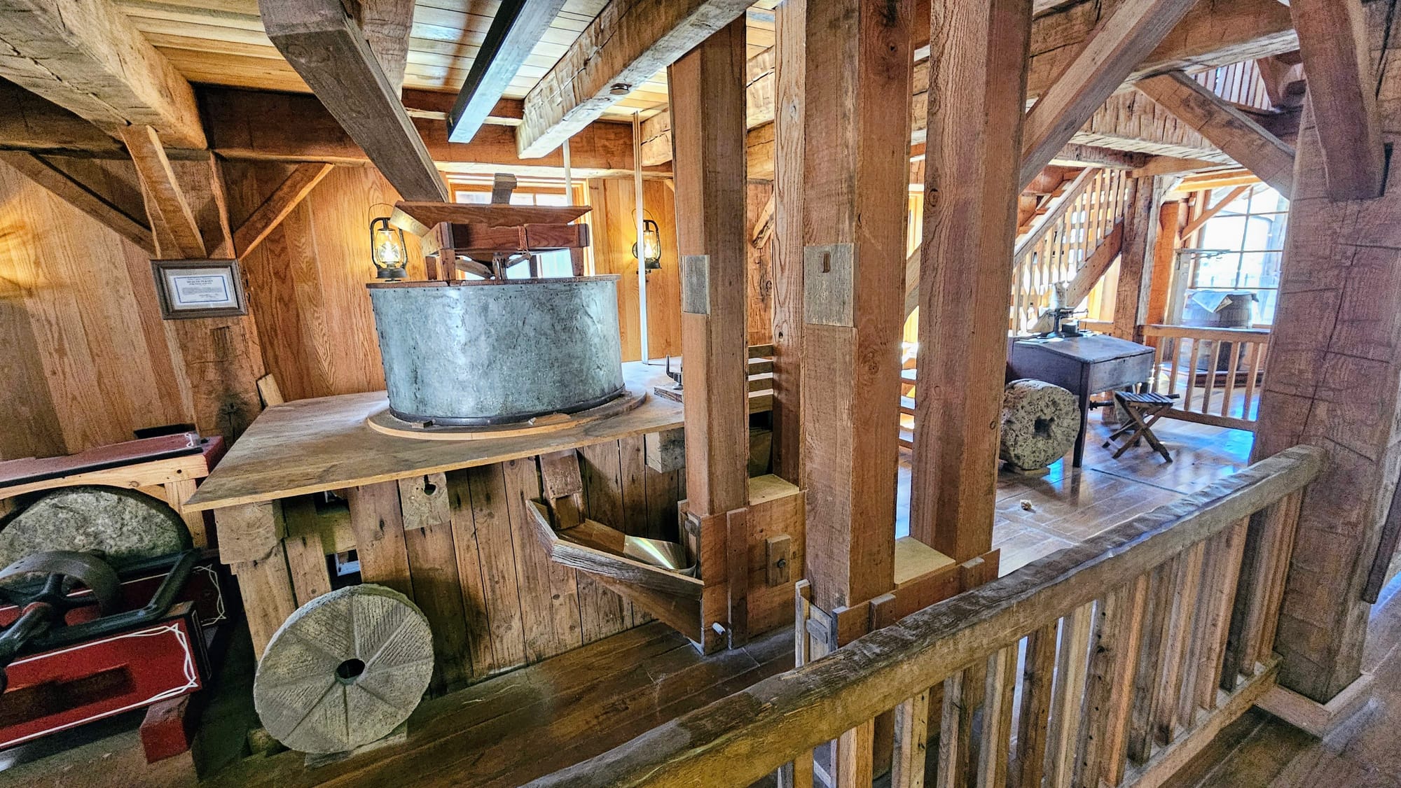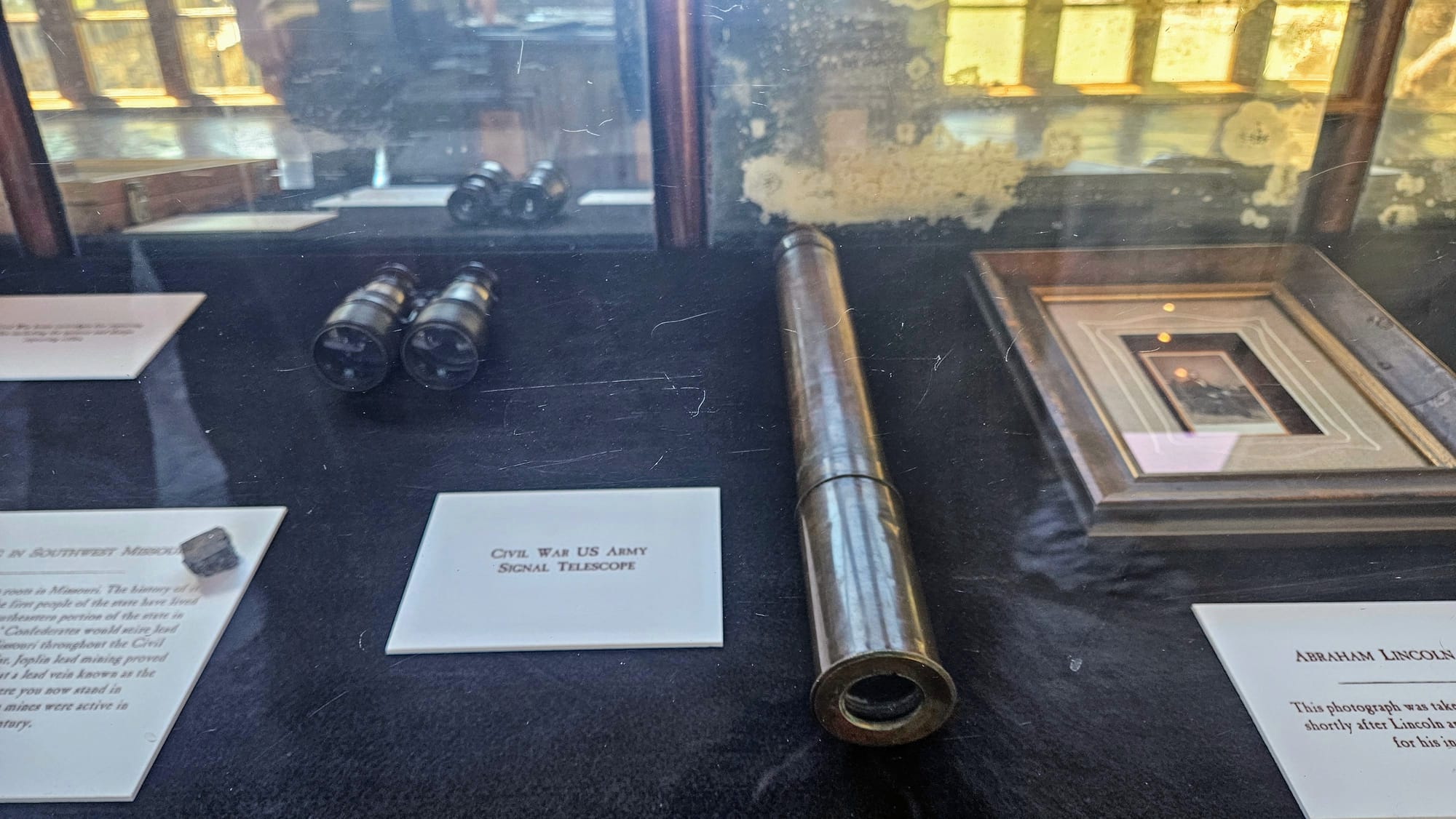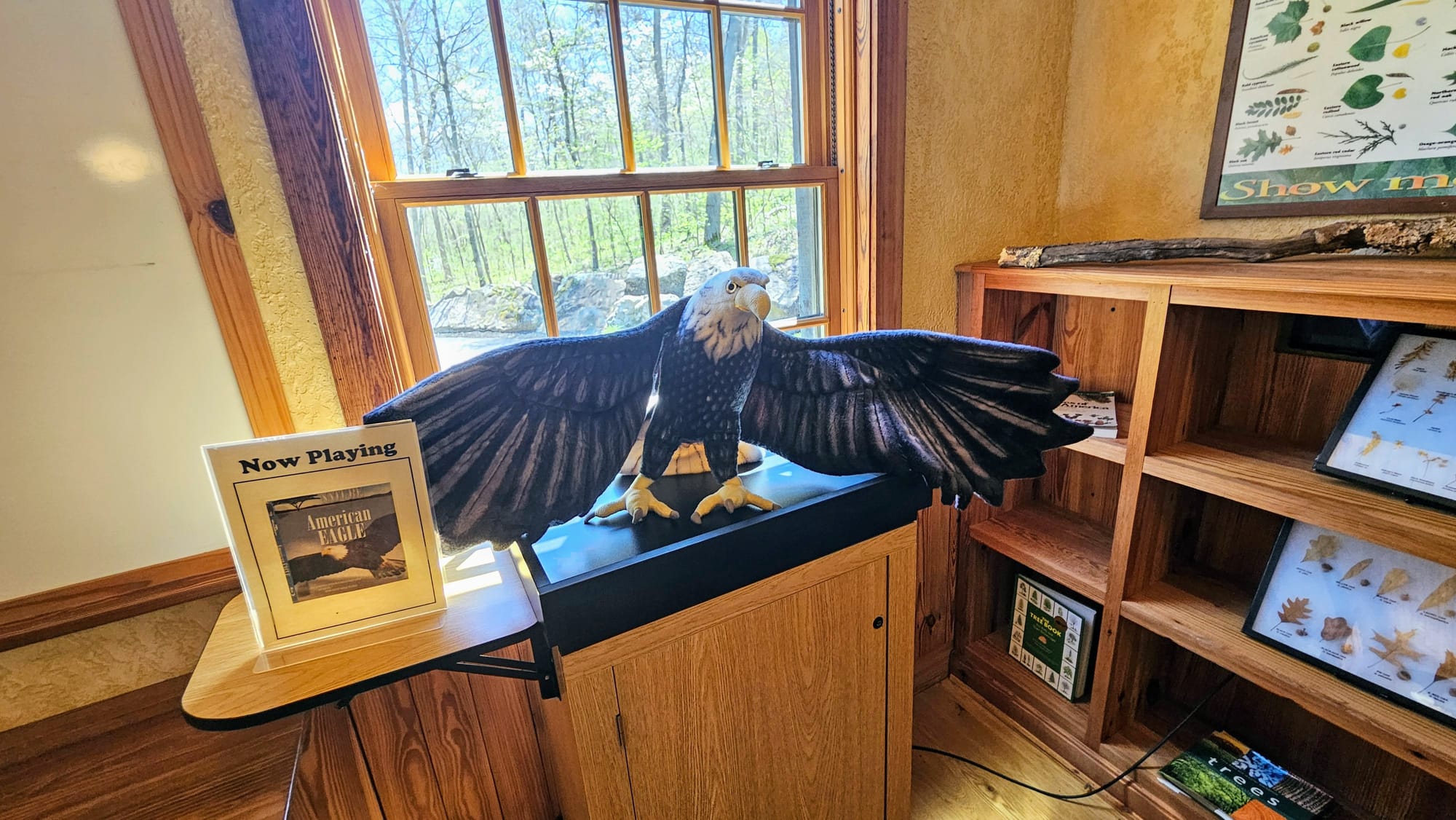 There is a lodge building that houses exhibits, the restaurant, and the gift shop, and it's attached to the grist mill by a breezeway. We spent some time looking at the exhibits, including one on the bald eagles of Missouri, and the main exhibits on the Native American and Civil War era history of the area. Then we relaxed on the restaurant patio while we waited for our tram tour to start.