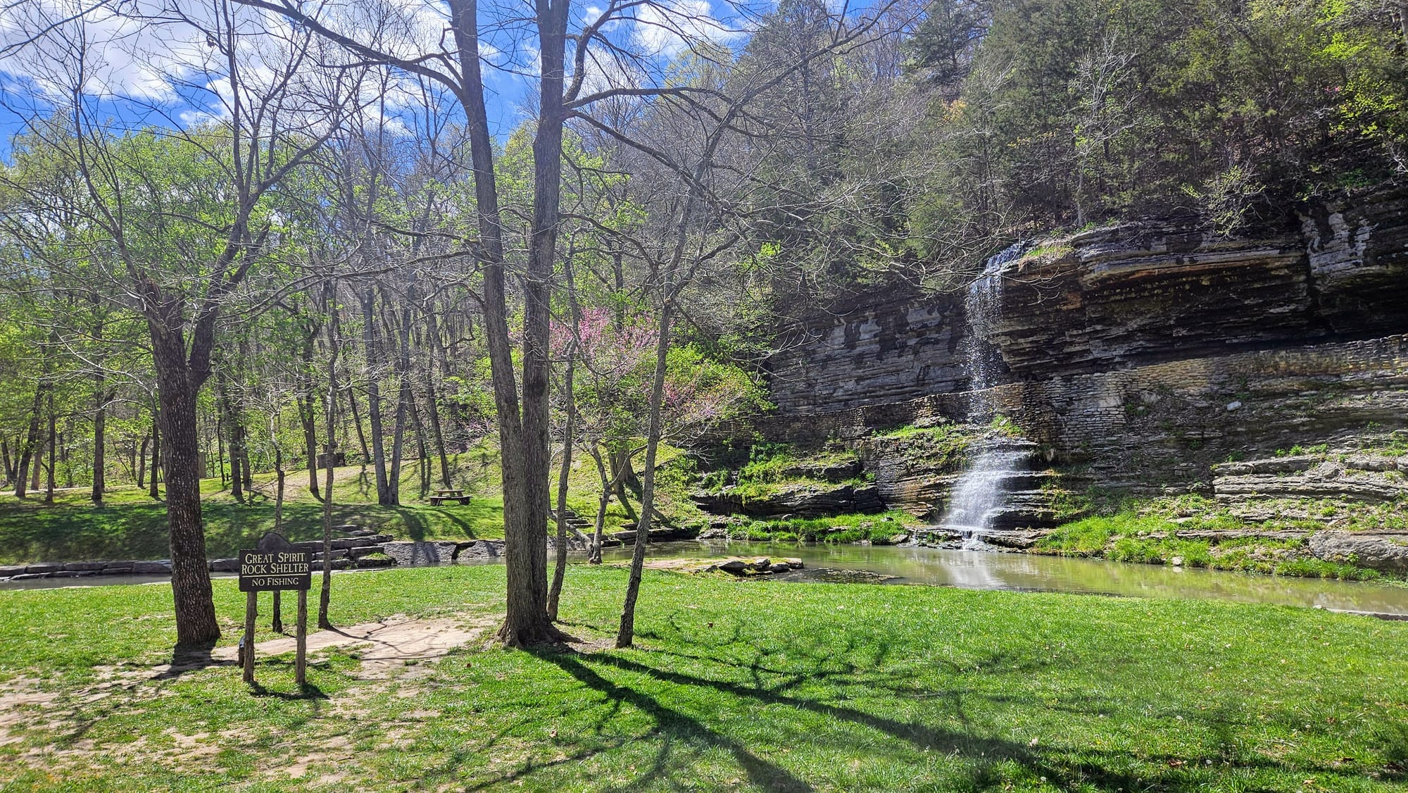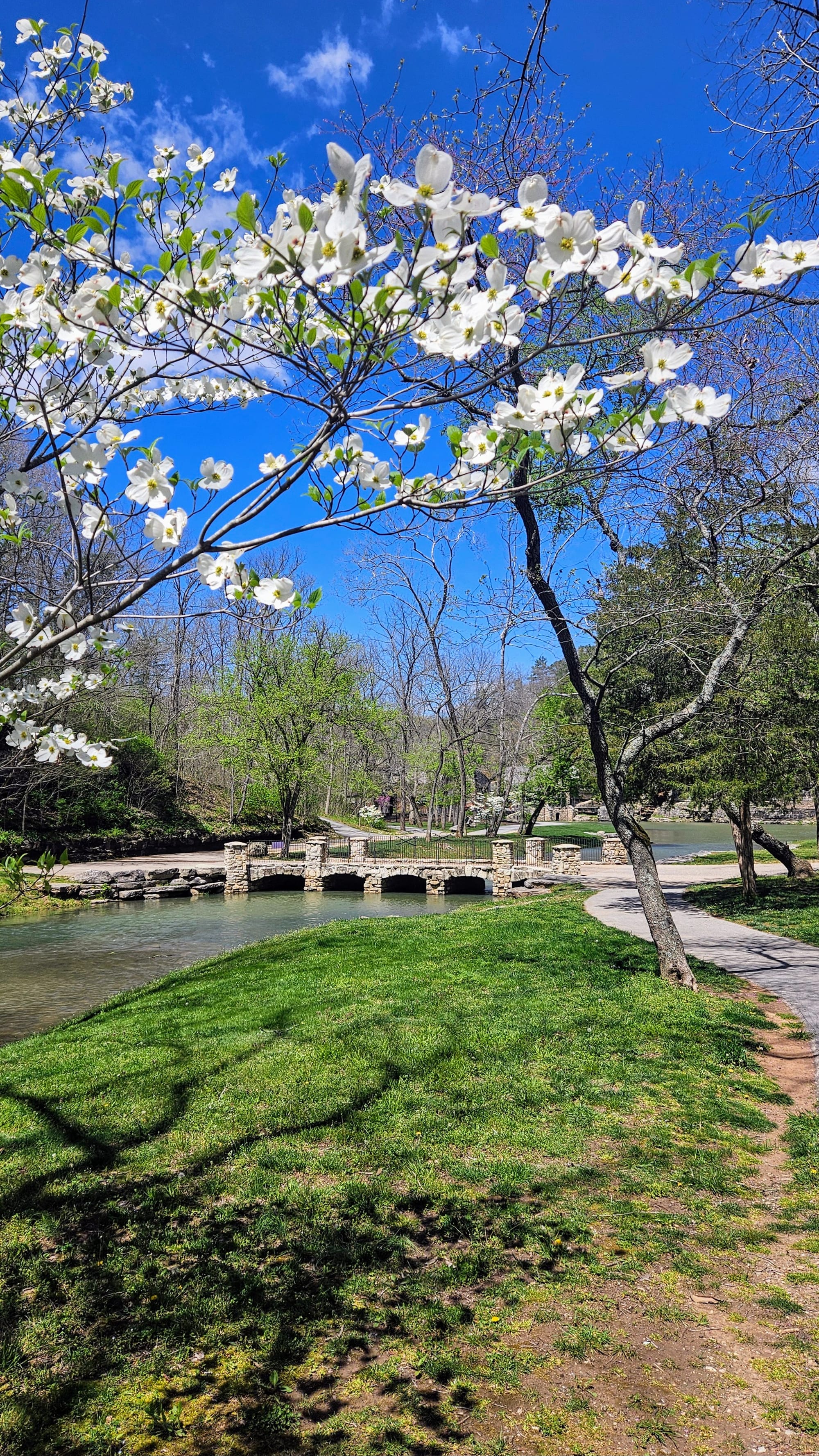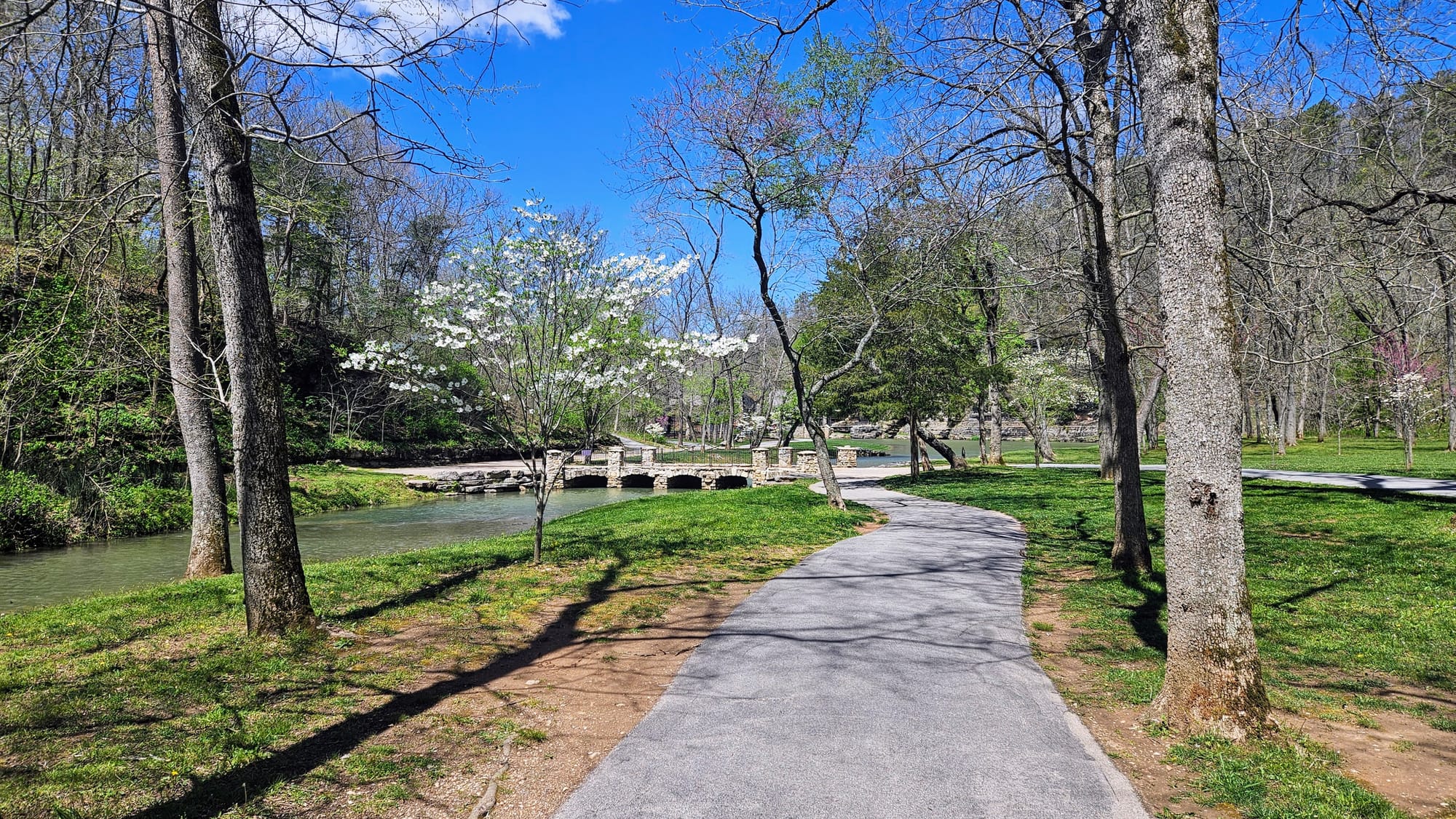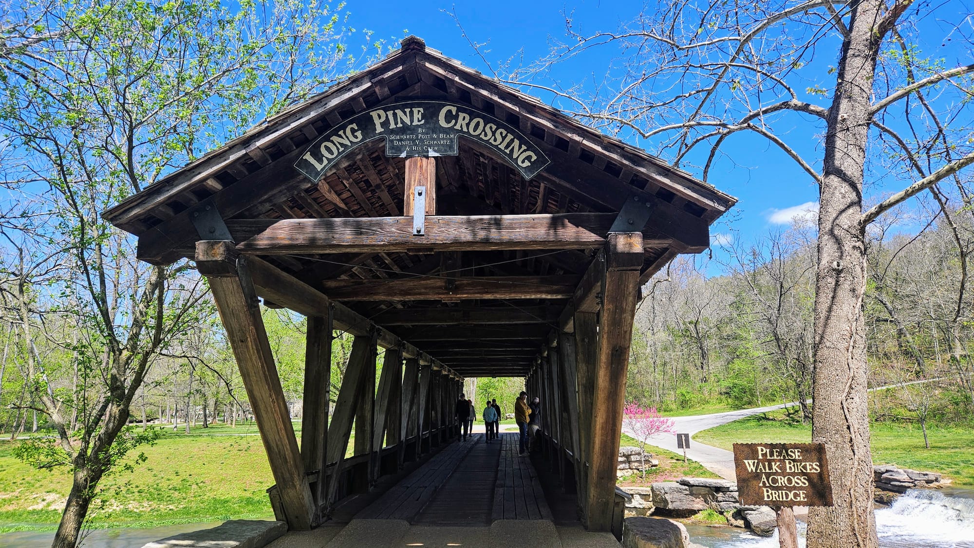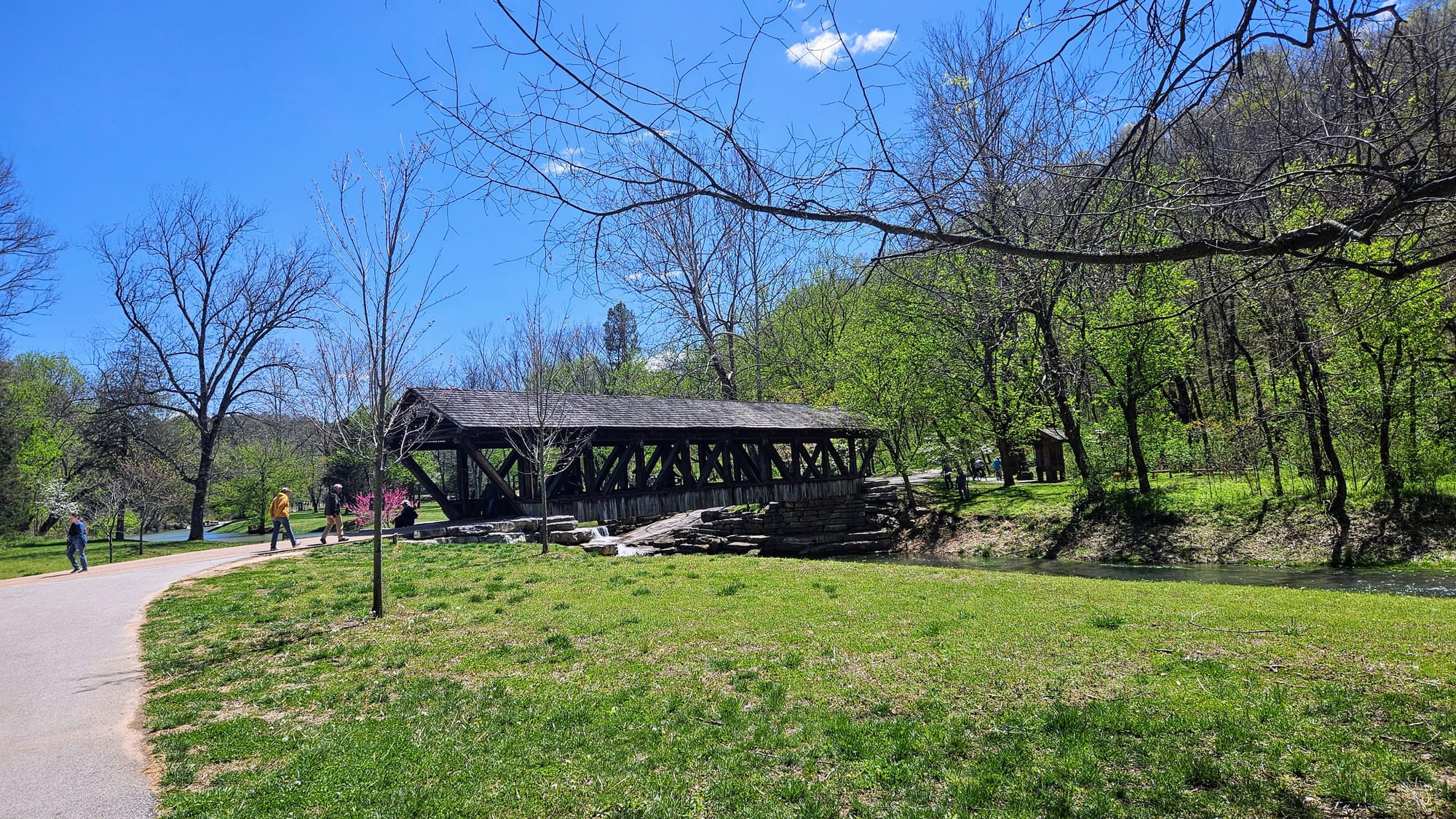 The whole place is idyllic. The Little Indian Creek flows through the canyon, with waterfalls cascading down the canyon walls. Paved paths parallel the water, where visitors can choose to walk, bike (rentals are available), or take the tram. Our biggest reason for going was to see the dogwoods, Missouri's state tree. They were not quite at peak bloom yet, but they were getting close. We had been following their bloom all the way up from Arkansas and we found it only fitting to enjoy their beauty in a place named after them. While dogwood trees are native to Missouri, many of the ones at the canyon were planted and maintained. The canyon also boasted numerous caves, many of which had Native legends associated with them. We took a hike on one of the unpaved trails and walked the paved path to a covered bridge constructed by the Amish.