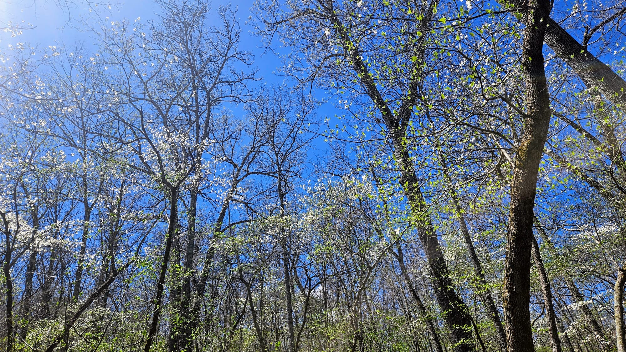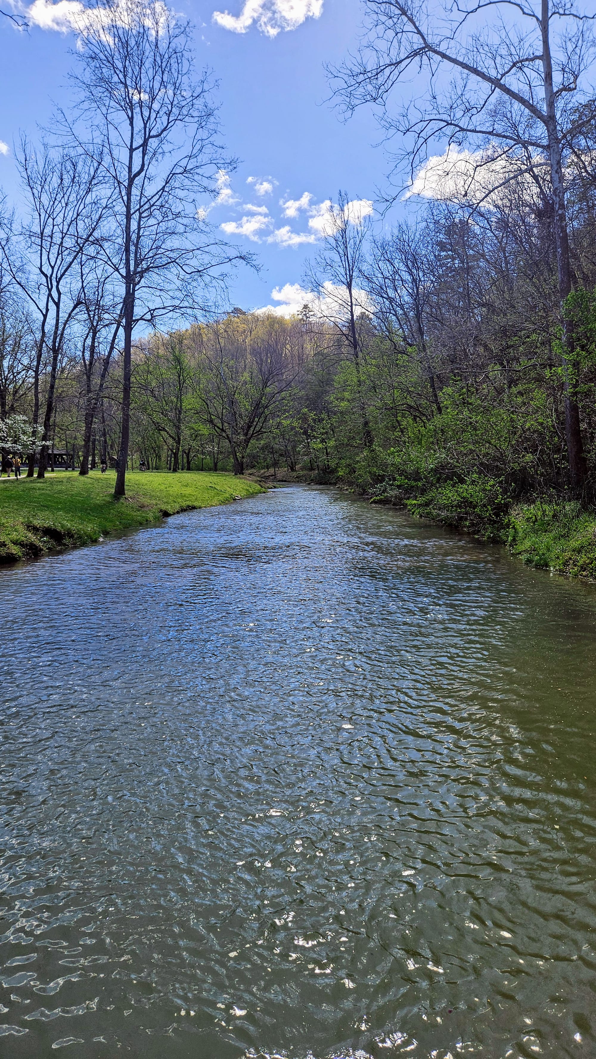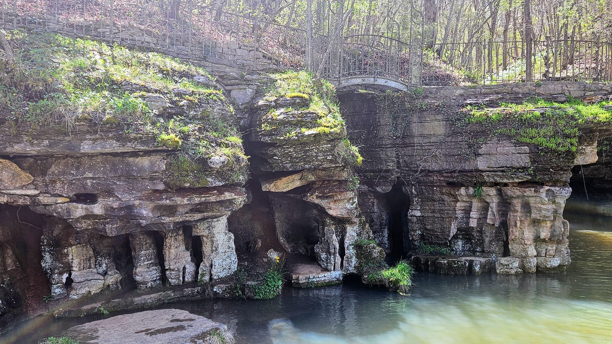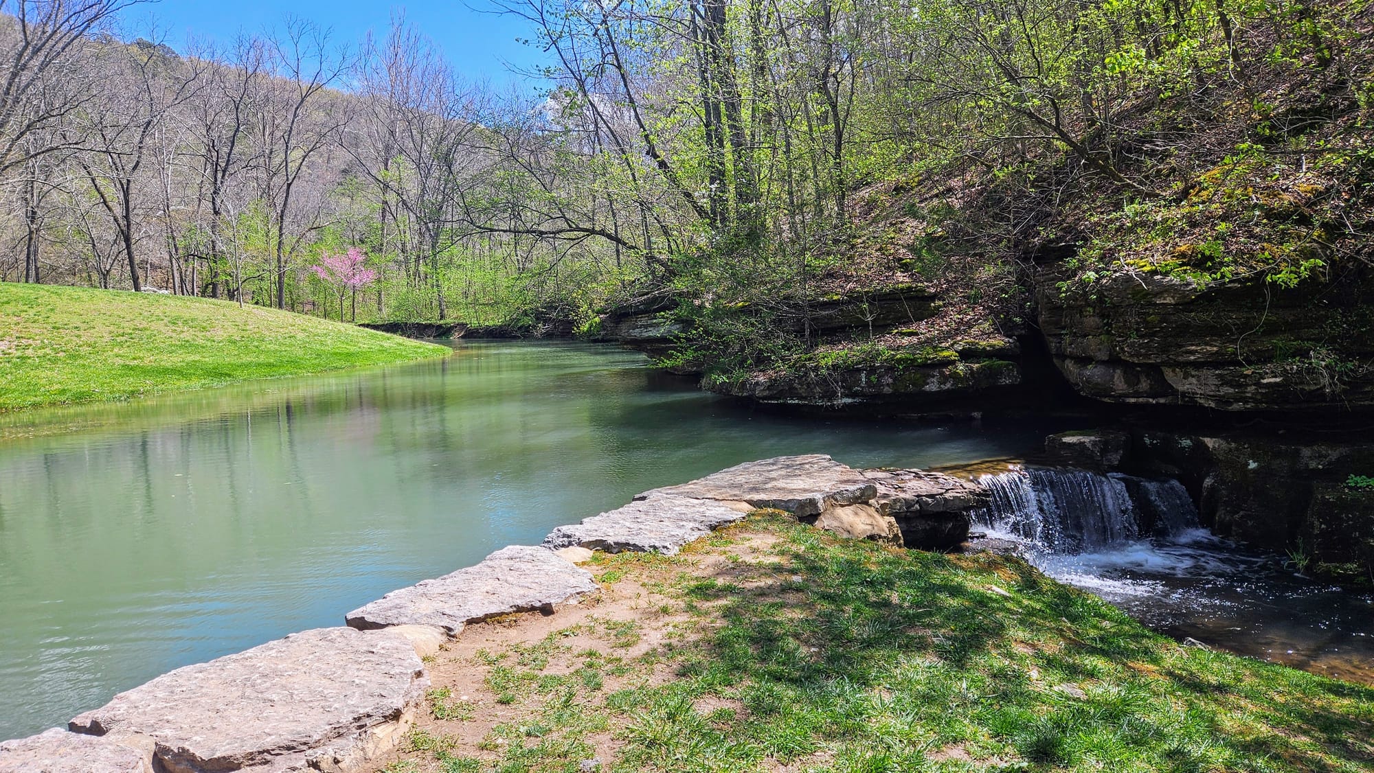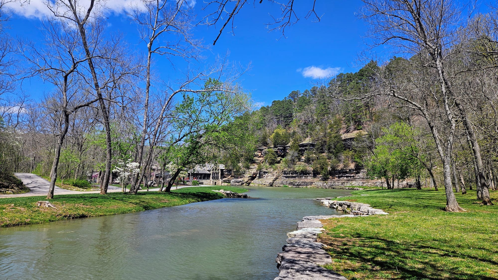 The whole place is idyllic. The Little Indian Creek flows through the canyon, with waterfalls cascading down the canyon walls. Paved paths parallel the water, where visitors can choose to walk, bike (rentals are available), or take the tram. Our biggest reason for going was to see the dogwoods, Missouri's state tree. They were not quite at peak bloom yet, but they were getting close. We had been following their bloom all the way up from Arkansas and we found it only fitting to enjoy their beauty in a place named after them. While dogwood trees are native to Missouri, many of the ones at the canyon were planted and maintained. The canyon also boasted numerous caves, many of which had Native legends associated with them. We took a hike on one of the unpaved trails and walked the paved path to a covered bridge constructed by the Amish.