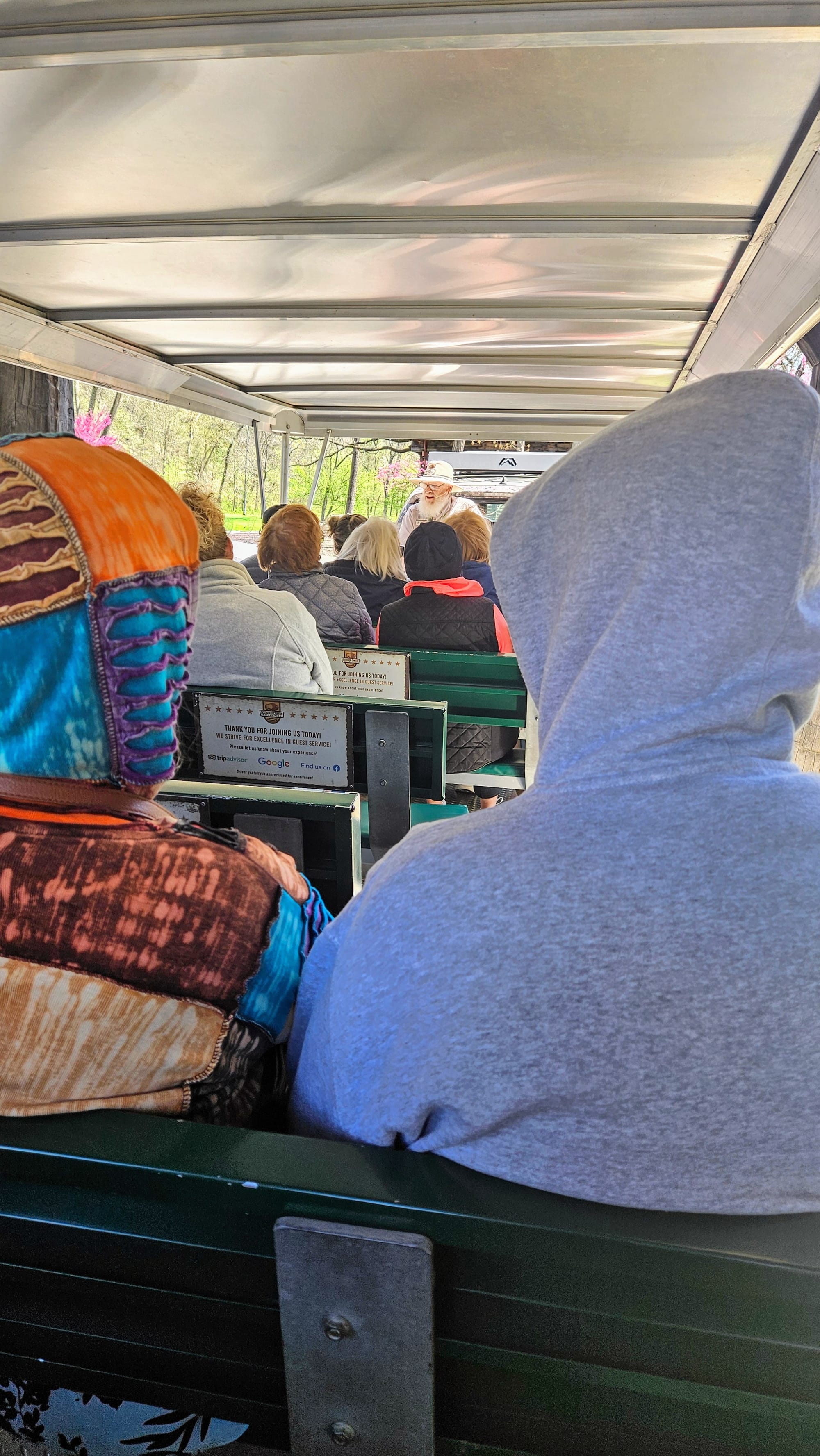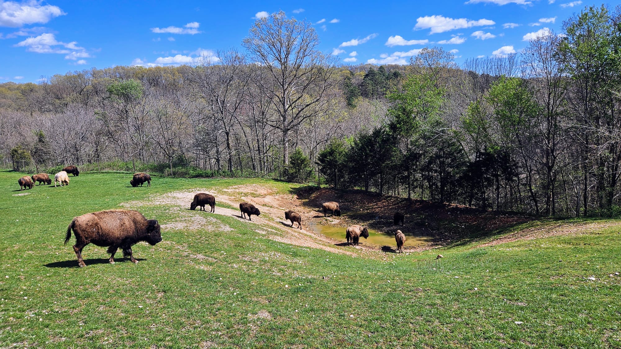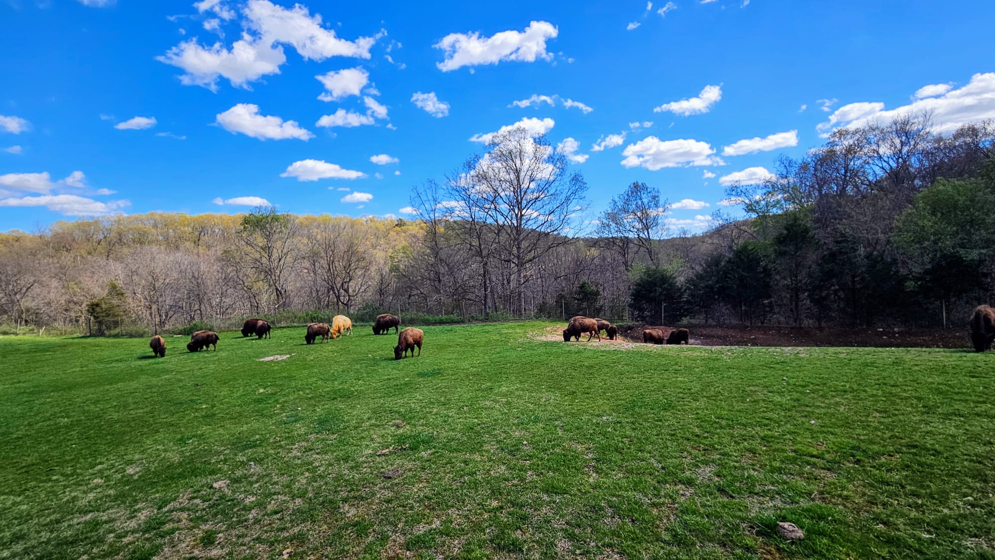 Our guide Joe was an exuberant octogenarian who had accumulated lots of knowledge and stories in his life, which he enthusiastically shared with us as we made our way up the road and across the many creek crossings. We learned about the wildlife in the area, the Native tribes that used to live there, and the formation of the canyon. We made a couple of stops along the way, including the chapel. Dogwood Canyon hosts about 50 weddings a year. Then we crossed the border into Arkansas and entered the wildlife sanctuary, where we met the herd of elk, bison, and two Texas longhorns. Venturing through that pasture was reminiscent of our journey out West last year. Memories arose of our time at the drive-thru zoos, Custer State Park, Wyoming, and the Colorado Rockies.