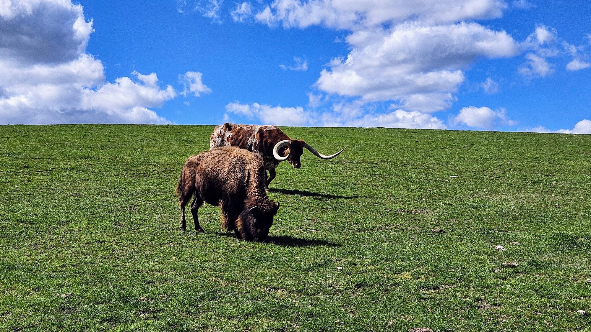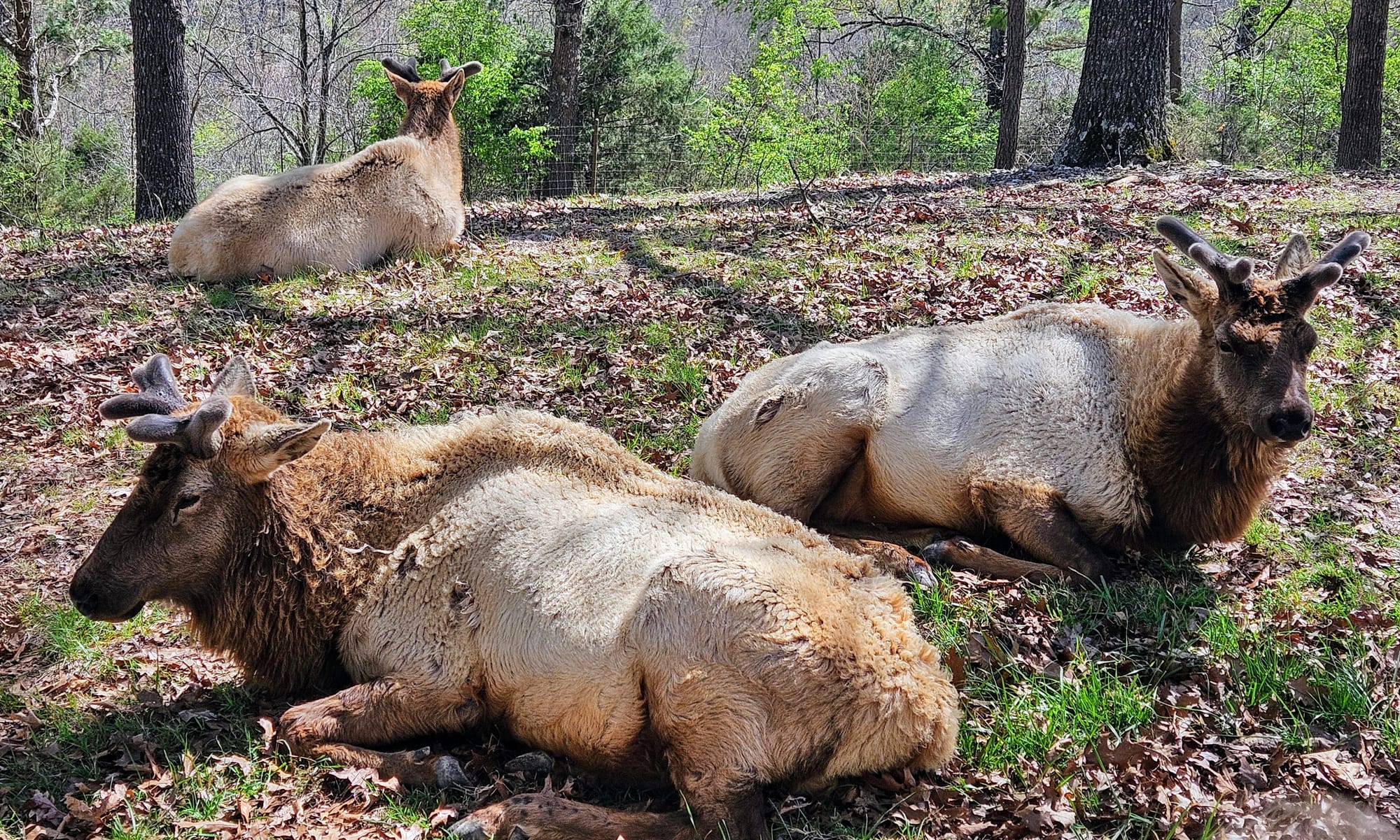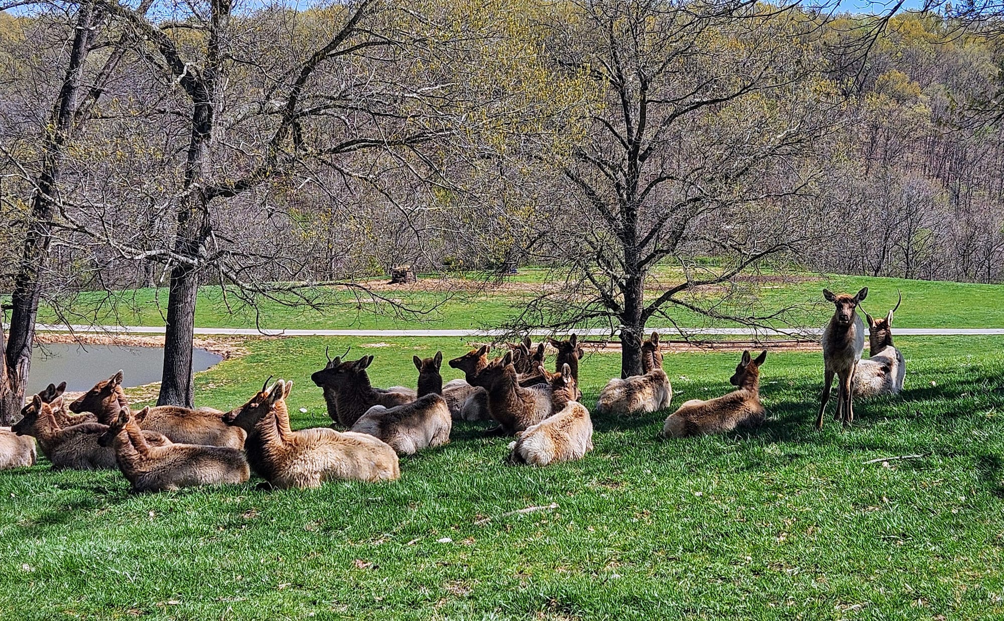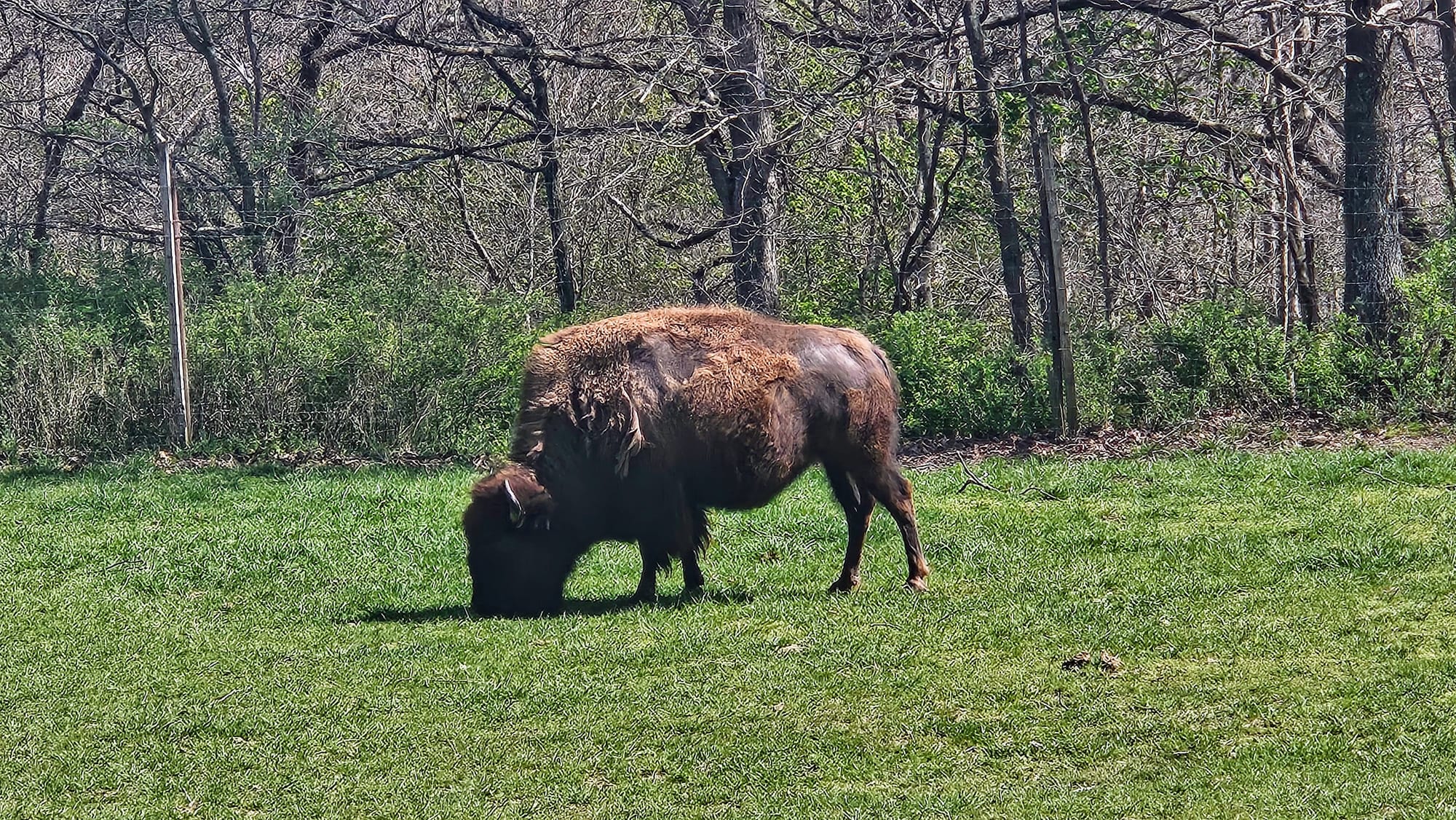 Our guide Joe was an exuberant octogenarian who had accumulated lots of knowledge and stories in his life, which he enthusiastically shared with us as we made our way up the road and across the many creek crossings. We learned about the wildlife in the area, the Native tribes that used to live there, and the formation of the canyon. We made a couple of stops along the way, including the chapel. Dogwood Canyon hosts about 50 weddings a year. Then we crossed the border into Arkansas and entered the wildlife sanctuary, where we met the herd of elk, bison, and two Texas longhorns. Venturing through that pasture was reminiscent of our journey out West last year. Memories arose of our time at the drive-thru zoos, Custer State Park, Wyoming, and the Colorado Rockies.