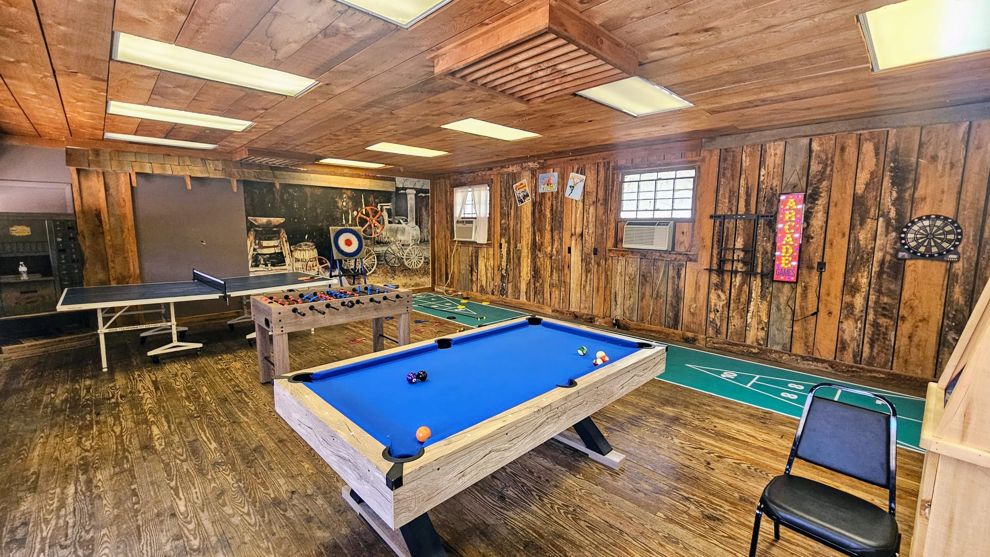 On our way back to the truck, we went and saw the animals, including an alpaca with a mullet, which may have been the most entertaining part of our whole visit. Then we stopped to check out the games. The game room was cute and rustic, but all the tables were small and cheap. We wonder, why have it at all? We feel like this place could be much better if it offered less, upped the organization, and made sure to do everything well. There would be plenty to keep both kids and adults entertained if there were even half of these activities. The fact that on a beautiful Saturday afternoon, we were the only ones on this side of the farm, makes us think that these attractions are not very attractive.