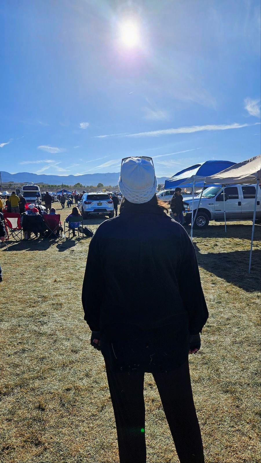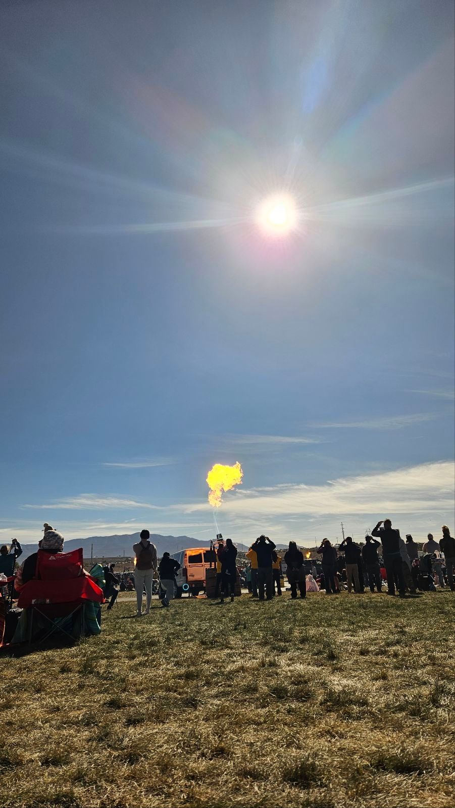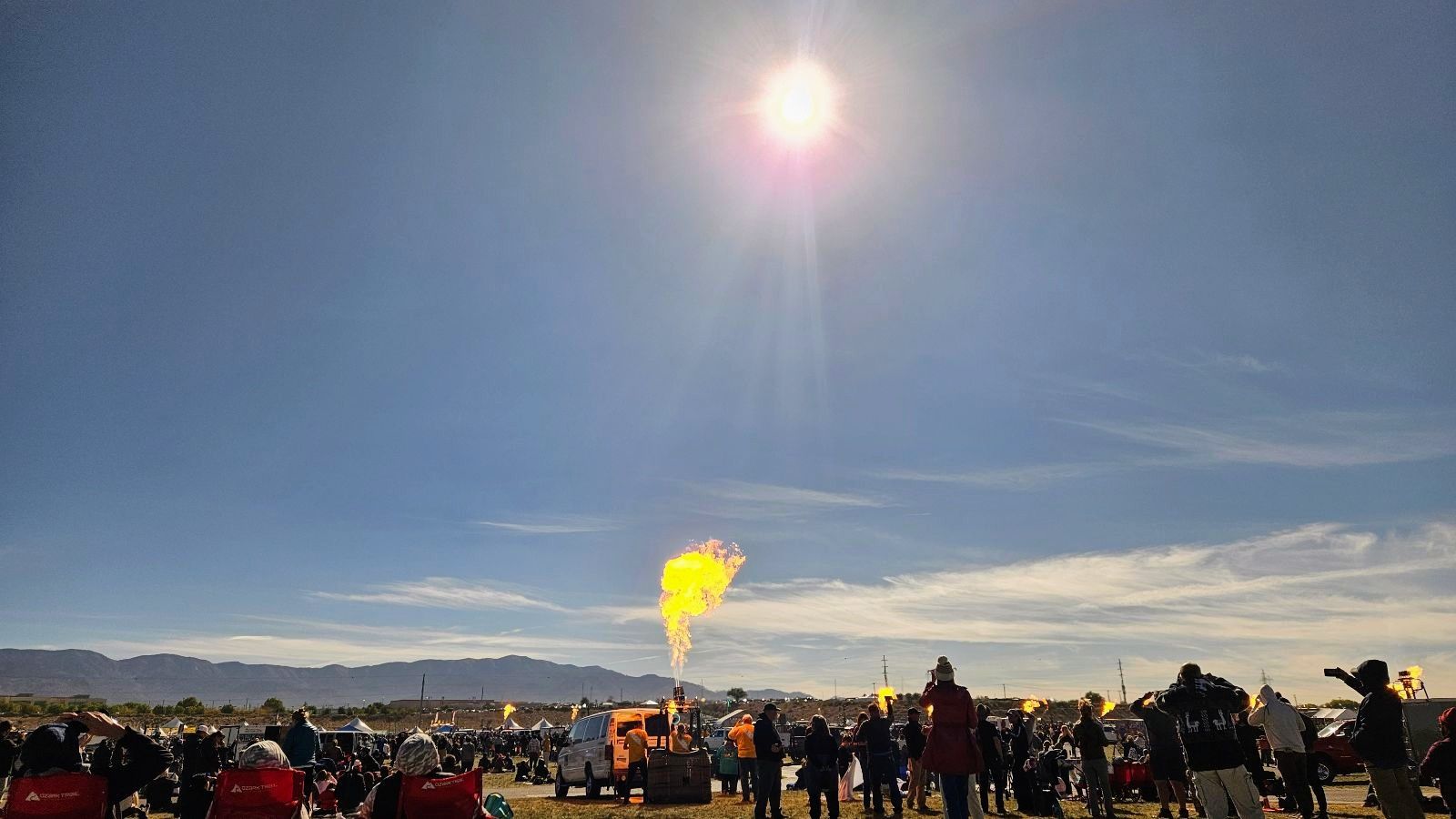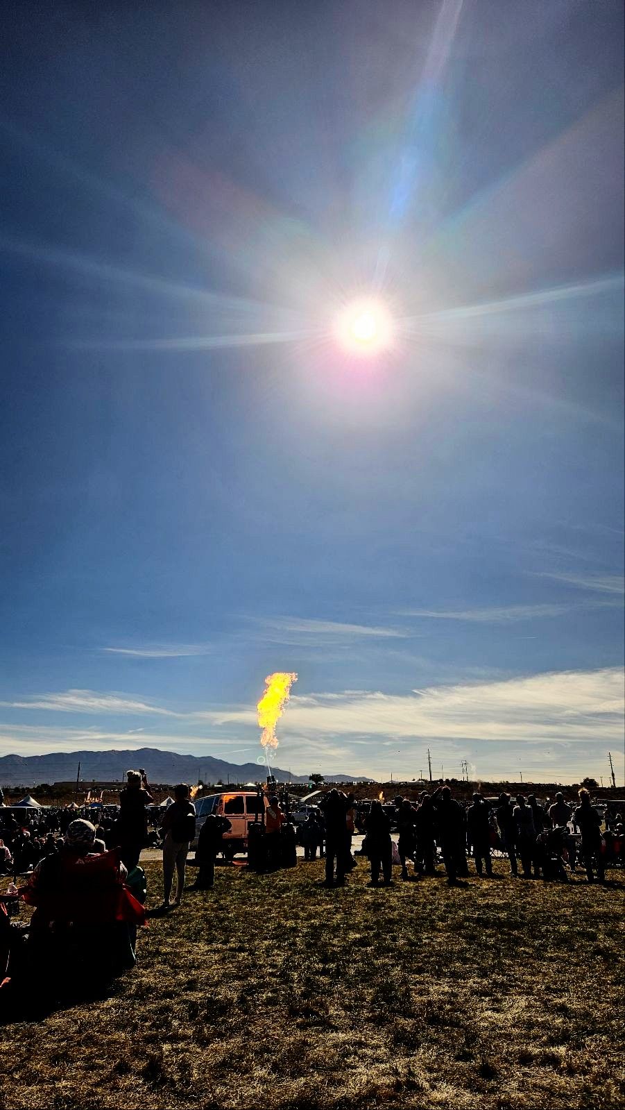 Experiencing the solar eclipse at the Balloon Fiesta was a unique experience. The plan was to have a balloon glow during the peak when everything was a bit darker. Unfortunately, the winds weren't conducive to inflating the balloons, so instead the pilots burned their gas in a "candlestick glow" as the ring of fire appeared in the sky. I tried to capture both the fire and eclipse in the same shot, but I wasn't at an optimal angle. The filters made the fire look extra orange, though, which was quite mystical!
