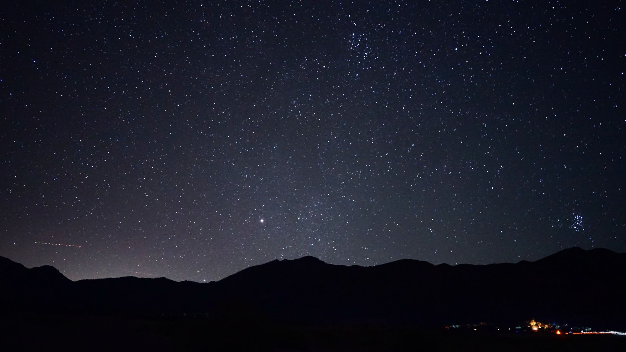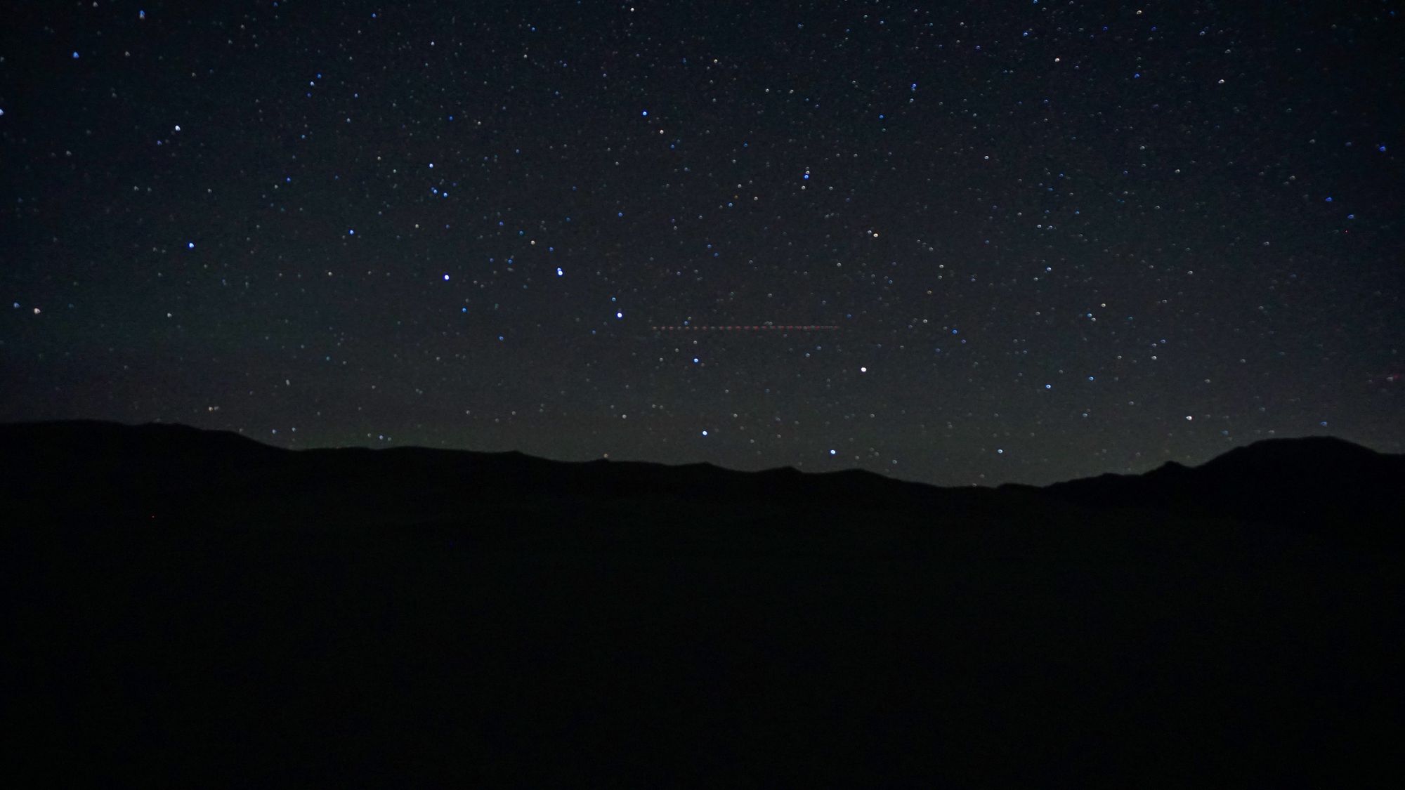 Turning east was no picnic either...except that I was facing the campground, so I guess there are picnic tables somewhere! Thankfully the campground lights themselves didn't detract from the stars too much, but there is some light leak shining from behind the mountains. I call it an artistic liberty. Look to the left and you'll see a couple of plane trails, and that cluster to the right is the Pleiades, which had just become visible and would remain so for the next six months. Lastly, the slightly whiter area in the middle of the photo is the Milky Way. It was the only reasonable photo I captured of it with a foreground - the Sangre de Cristo Mountains. If I wanted to get a more vivid image, though, I'd have to point the camera straight up.