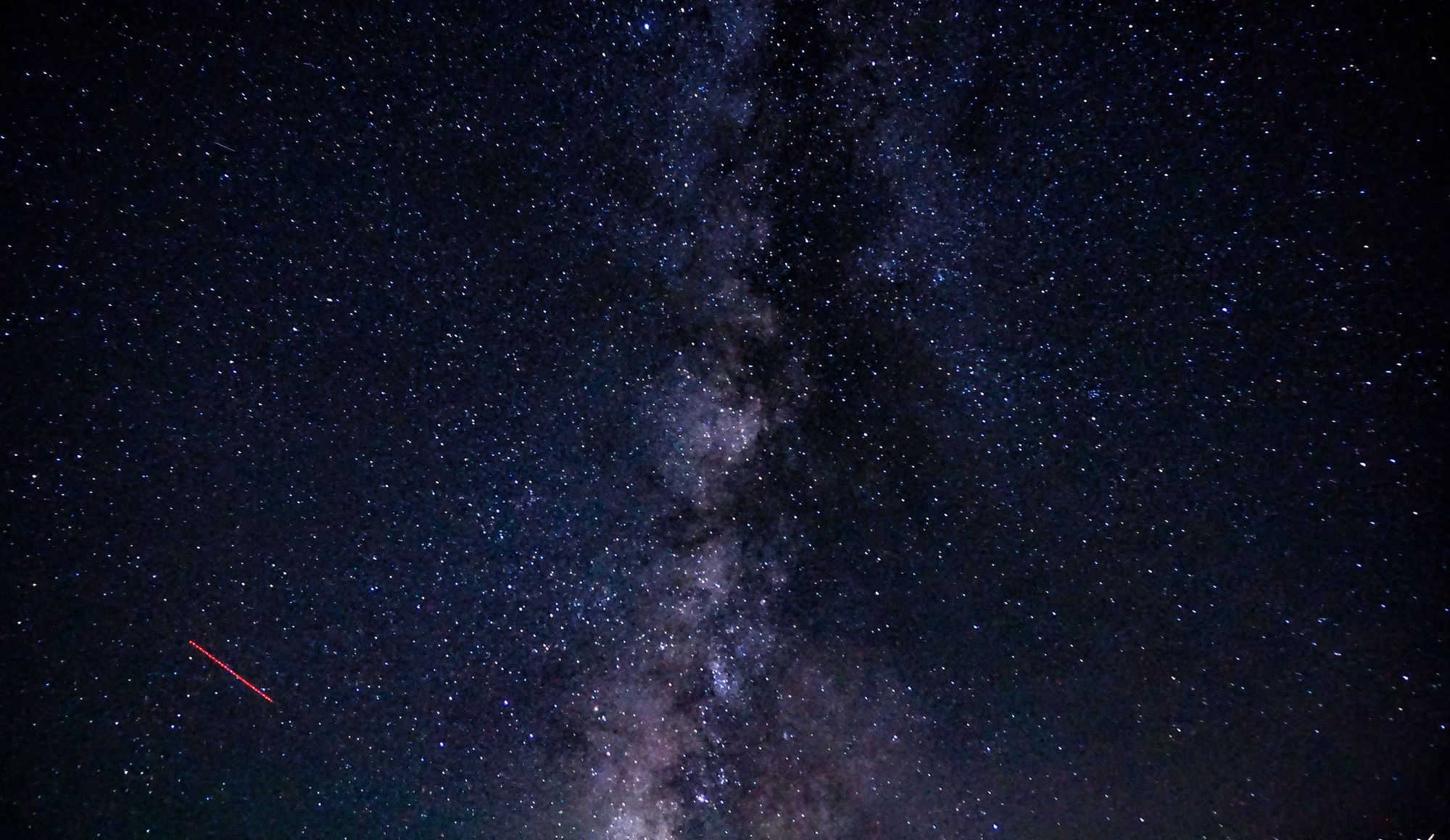 This was probably the most stars we've ever been able to see with the naked eye. It was extraordinary and I only wish I could capture it better with the camera, but with my limited equipment, I tested out a couple of my wide angle lenses, eventually settling on my 20mm fixed zoom lens. From where we stood, the Milky Way was most vivid looking west, toward the town of Alamosa. This was a little unfortunate because the city lights would cause some interference, and this direction was also away from the dunes. As I decided what to do, I took a few shots towards the dunes. The Big Dipper was setting behind them and it was a gorgeous sight. Look closely and you'll also see dots of red streaming across the sky. These are airplane trails.