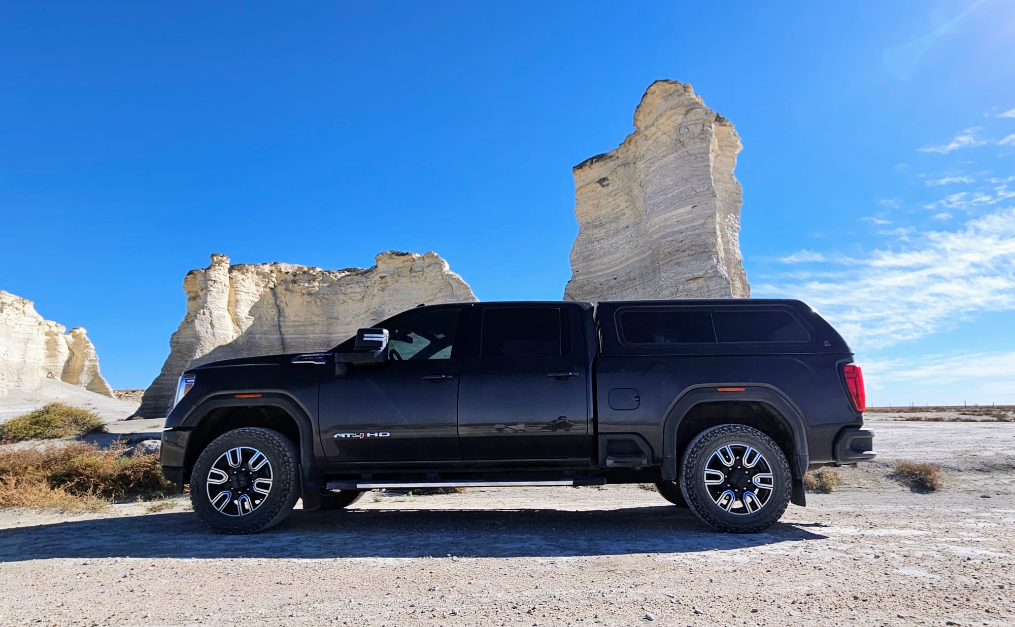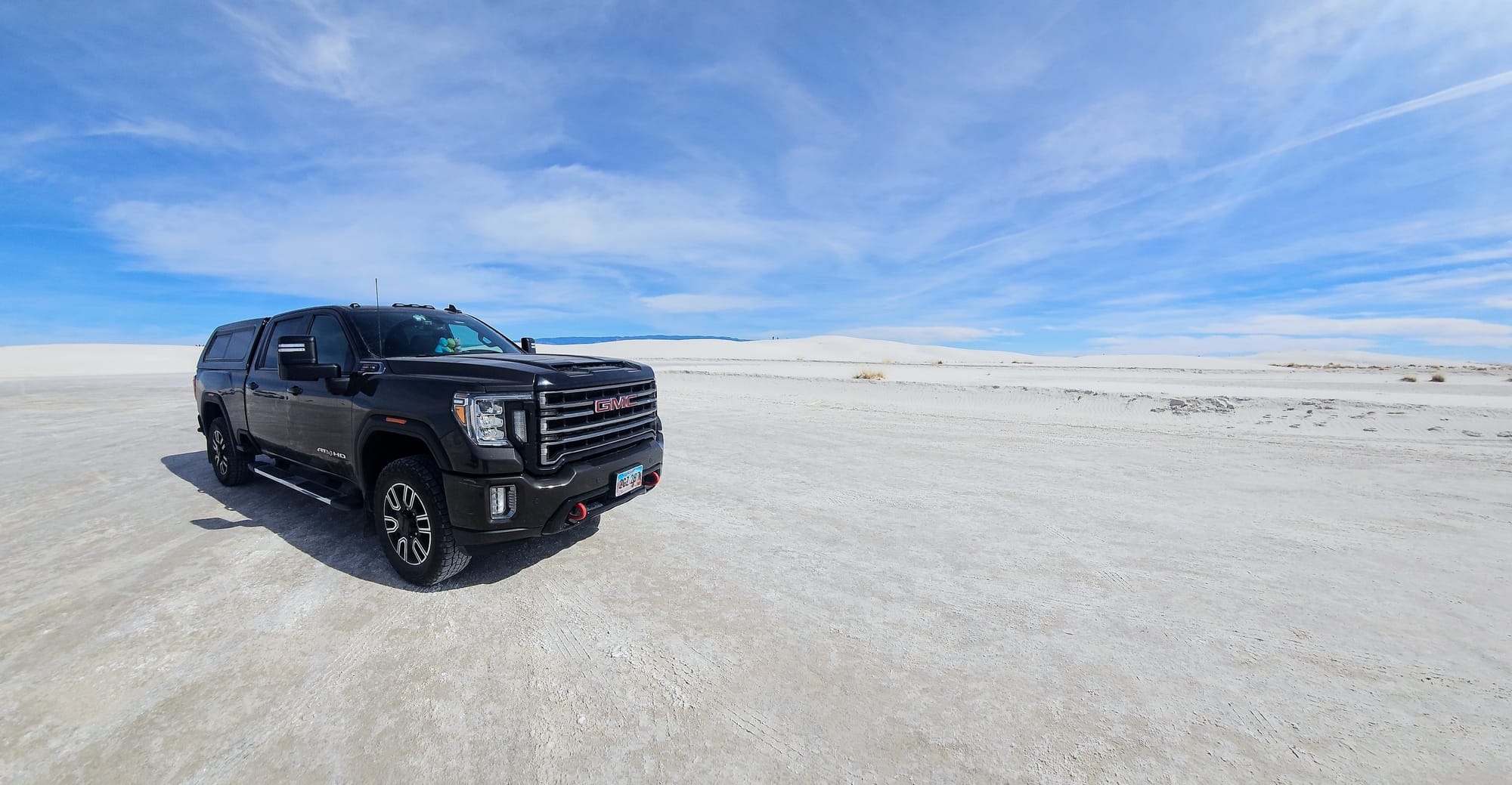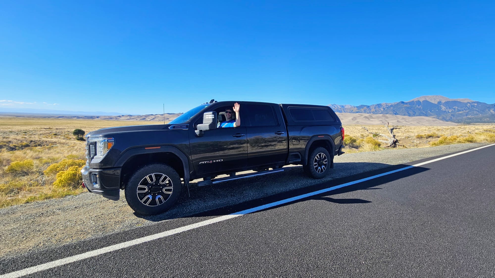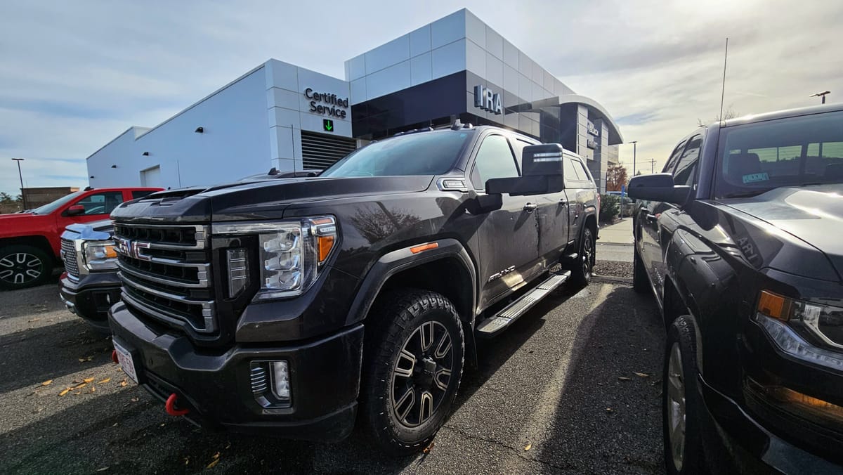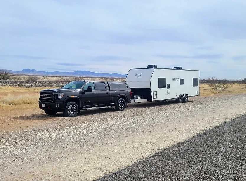 Clyde is a 2020 GMC Sierra 2500. We got him in February 2021, almost exactly a year to the day we launched on the road. We faced a lot of obstacles when purchasing our first truck. We had always been fans of small vehicles and never liked the ruggedness of trucks. At first, we resisted getting one at all. We considered trying to tow the RV with a large SUV, but once we settled on our 28ft ATC toyhauler, we knew we needed to go heavier duty, especially if we wanted to travel all over the country. At the end of the day, learning to maneuver a large truck would be nothing compared to maneuvering the entire RV! All that said, we still needed to find a truck that wouldn't feel too bumpy barreling down the road. We test drove tons of makes and models, and GMCs felt the most "un-truck" to us. We liked the comfort, the interior setup, and its specs for towing a rig our size.