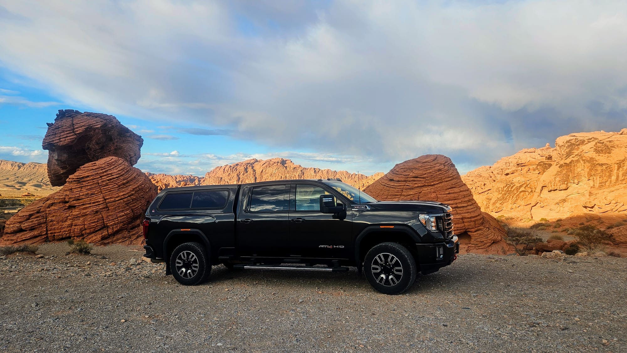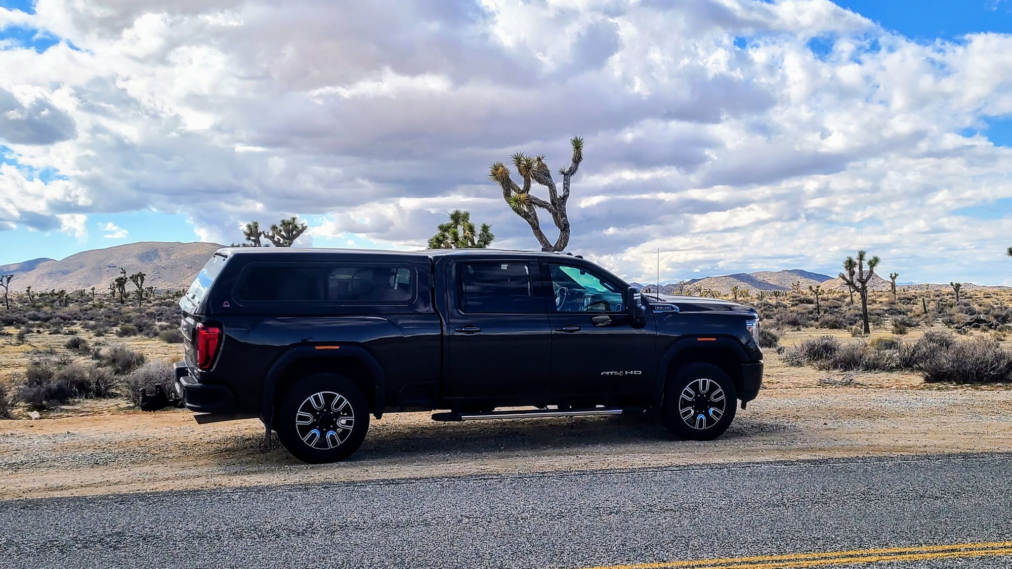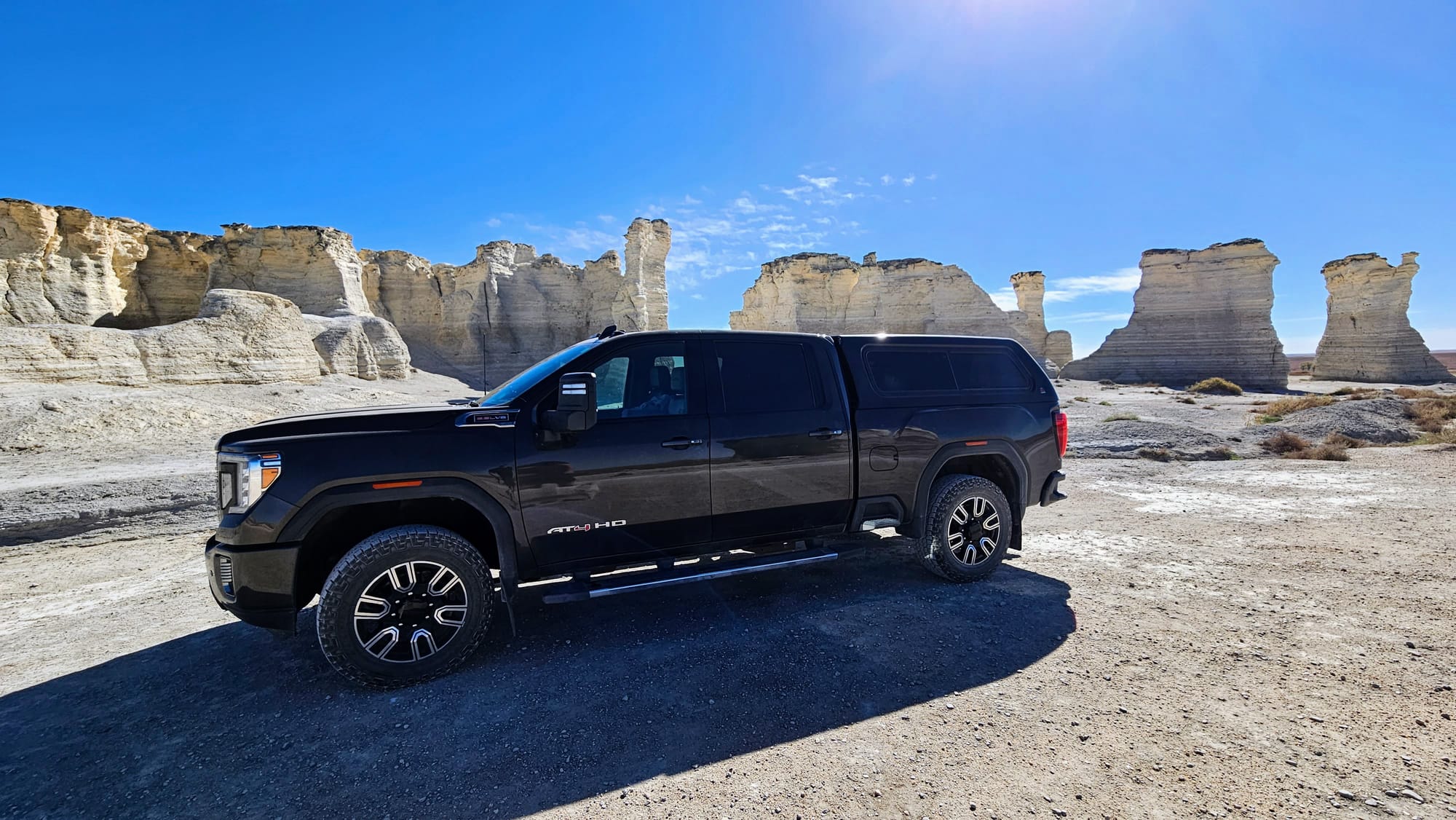 Clyde is a 2020 GMC Sierra 2500. We got him in February 2021, almost exactly a year to the day we launched on the road. We faced a lot of obstacles when purchasing our first truck. We had always been fans of small vehicles and never liked the ruggedness of trucks. At first, we resisted getting one at all. We considered trying to tow the RV with a large SUV, but once we settled on our 28ft ATC toyhauler, we knew we needed to go heavier duty, especially if we wanted to travel all over the country. At the end of the day, learning to maneuver a large truck would be nothing compared to maneuvering the entire RV! All that said, we still needed to find a truck that wouldn't feel too bumpy barreling down the road. We test drove tons of makes and models, and GMCs felt the most "un-truck" to us. We liked the comfort, the interior setup, and its specs for towing a rig our size.