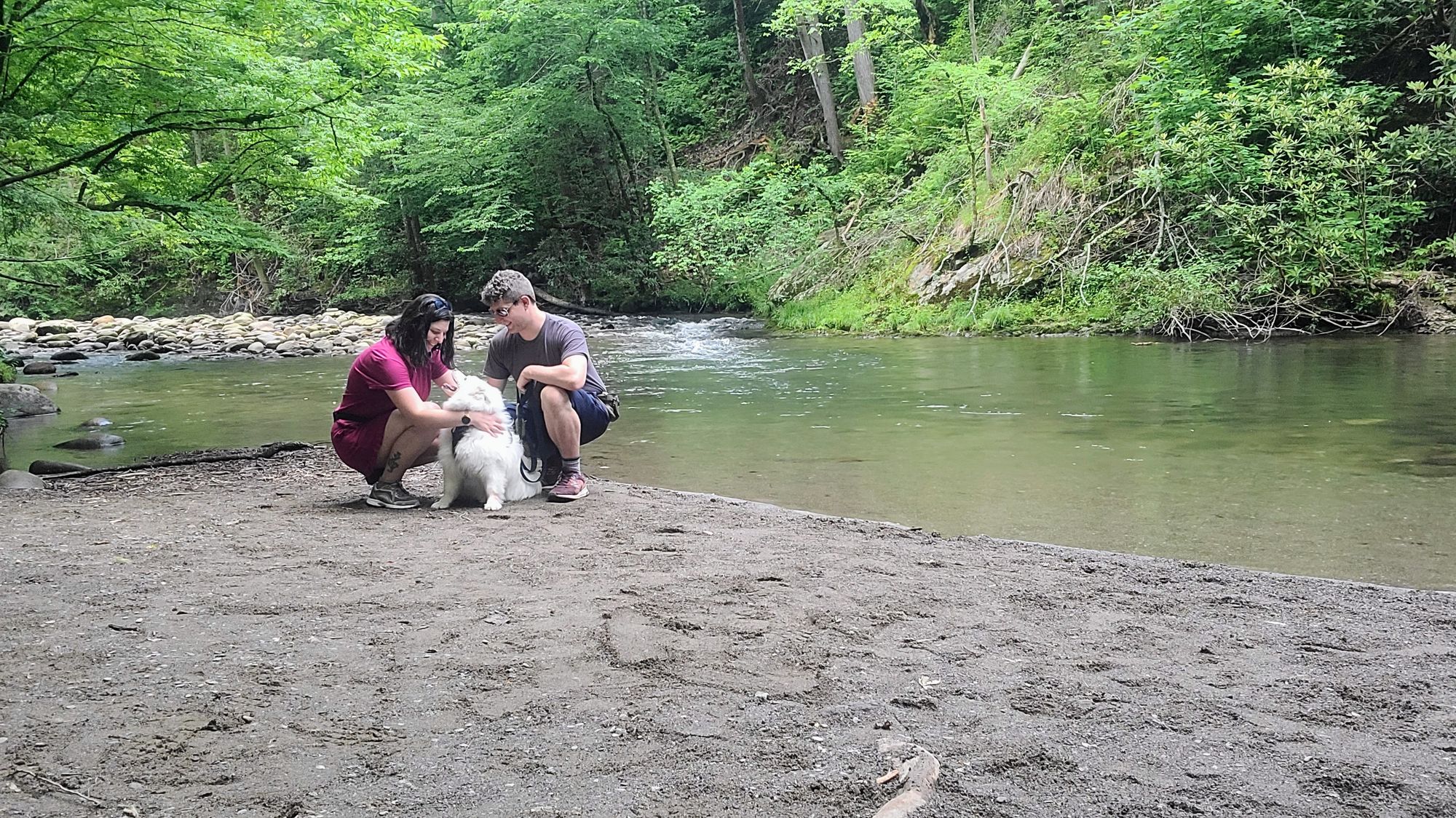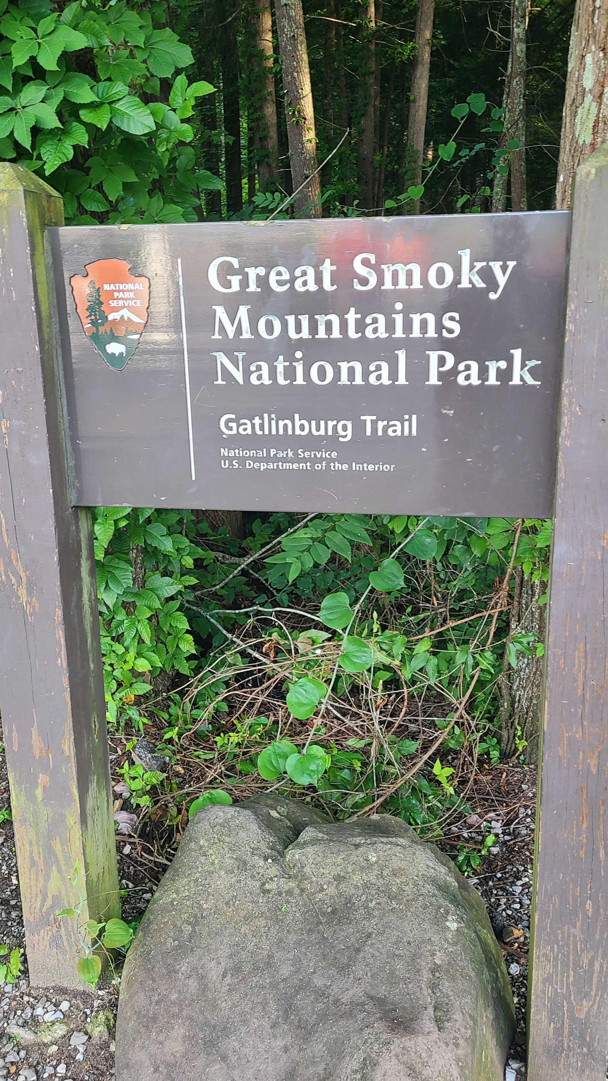 We decided to forego waterfall hikes and head to one of the two dog-friendly trails, so that we could take Tanner on one of the cooler days. The Gatlinburg Trail follows alongside a river, and while it's close to town and you can hear some traffic noise, it's overall a very peaceful trail. More of a nature walk than a hike, it doesn't have a lot of elevation gain and was perfect for our senior pup. We parked at the maintenance lot close to the Sugarlands Visitor Center and walked to Gatlinburg and back. All Trails says the hike is almost 4 miles total, but we clocked far less than this, probably closer to 3, if that. We also had the opportunity to go up to the road and get a picture by the Smokies Sign, a fun memory to share with our little fluffball.