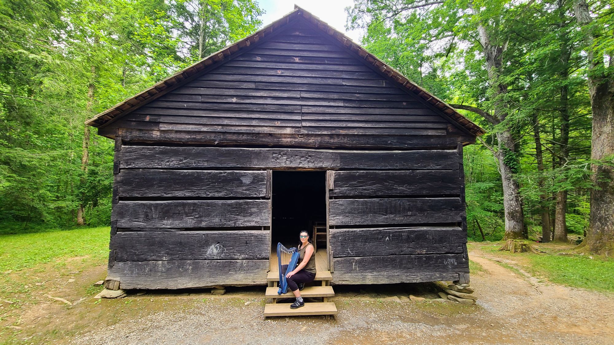 We loved walking through all the pioneer farmsteads during our drives up Roaring Fork and Cades Cove Loop, but near our campground was the Little Greenbrier School, which has a fascinating history. You can drive to the school, but we opted to hike the Metcalf Bottoms Trail, which leads to the school. The trail is fairly easy but does have some inclines. It's a true forest walk, with little footbridges over creeks, and the spring greenery was extra vivid in early June. I took my harp with me, and while I didn't play much along the trail, it was nice to give a little pop of blue to the surrounding green and brown colors of the forest and schoolhouse.