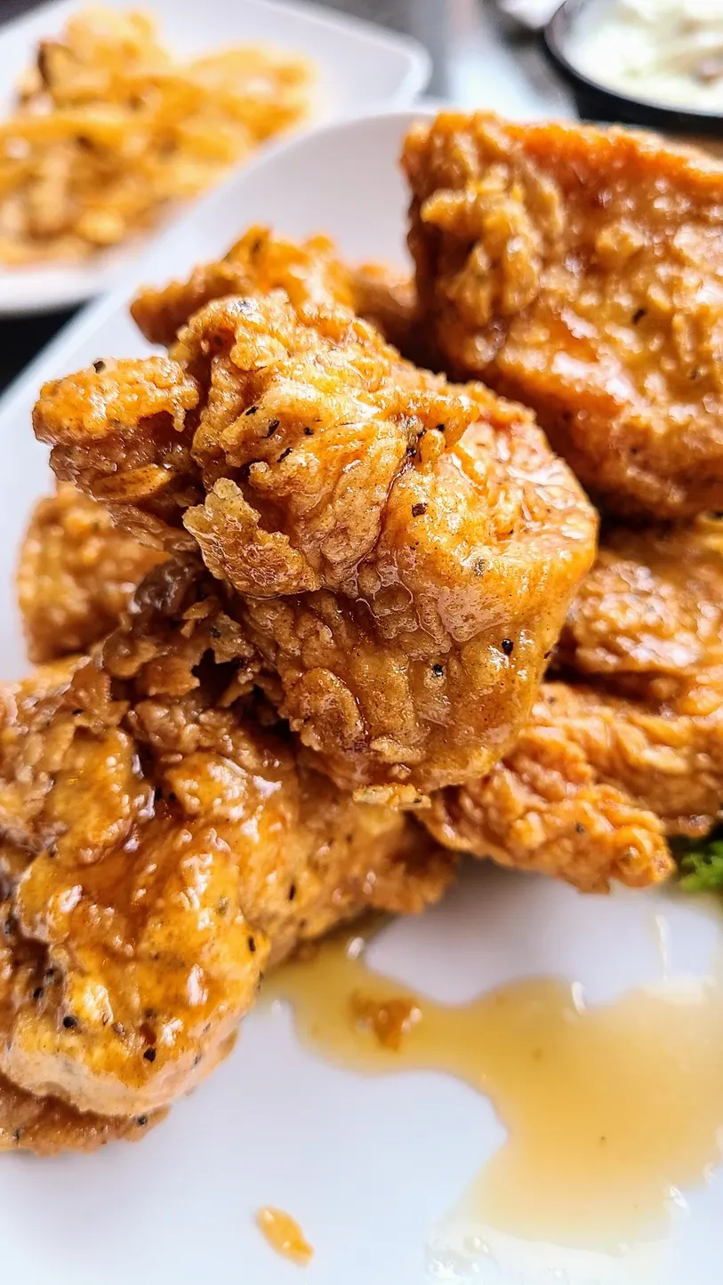 Anthony made it very clear that he wasn’t in the mood for onion rings again, but his opinion quickly changed when the plate made it to our table. We thought we weren’t prepared for our giant onion nest at Table 105. There is literally nothing that would have prepared us for the spectacular monstrousness before us. They mentioned on the menu that the onion rings were thick cut and they weren’t kidding. We stared at the plate in comic disbelief, wondering what the onions must have looked like that produced such an exceptional array. As Anthony said, this wasn’t a question of how many onion rings we want; it’s a question of how much of an onion ring we want. One ring and we were both already almost too full for dinner. The rings were delicious, though. The onions were tender and juicy, and the batter was the same as what they use for the fried fish, so we got a preview of what that would taste like. They even gave us the batter crumbles a la Long John Silvers. You can’t beat greasy crunchy bits of batter.