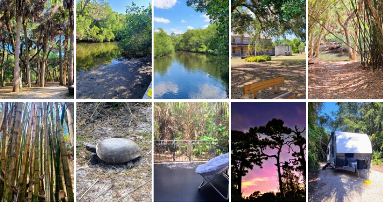 Florida state parks only allow for a maximum of a 14-day stay at one time. We booked at Koreshan for a week. This was Newbie Nicole's tentative way of booking a site without full hookups, as Koreshan only has water and electric (no sewer hookups, but does have a dump station at the park). In August 2021 we had no idea how long we wanted to be without full hookups, and so all we could do was predict what would make us most comfortable.