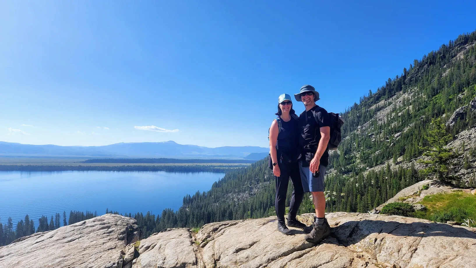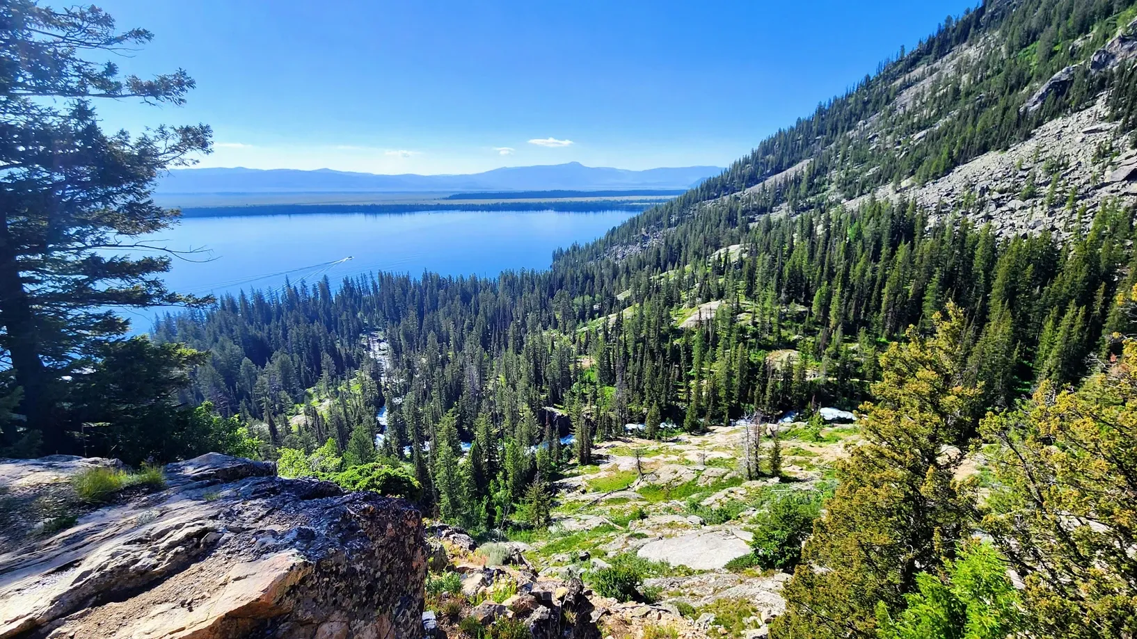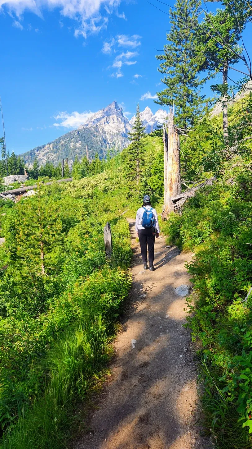 Jenny Lake is an iconic feature in the Tetons. We had stopped there for a short shoreline walk during our audio tour, but I had a specific hike planned since 2020. There is an overlook on the west shore of Jenny Lake called Inspiration Point, and there are a few ways to hike there. Option 1: You can take a shuttle across the water and then hike 1.8 miles to the overlook. The shuttles run every 15ish minutes and are $20 roundtrip. We already knew we'd rather save the money and hike, plus we'd want to get an earlier start than when the shuttles start running. Option 2: Walk around Jenny Lake, which would be about 2-2.5 miles, plus the remaining climb up to Inspiration Point. Option 3: Approach from the other side, after parking at String Lake, the lake adjacent to Jenny. When I was planning our 2020 roadtrip-that-wasn't, I had my sights set on a hike that included Jenny Lake and String Lake, with Inspiration Point in the middle. String Lake has a smaller parking area than Jenny, so we headed out early in the morning and had no issues finding a place to park. We first headed southwest along Jenny Lake for about 2 miles before veering off and upward towards Inspiration Point. This was the only climb of the hike, but given the looks on some people's faces, we think lots of people underestimate it. It's got some rocks that are slippery with dust, so wearing the right shoes is important. This was the only part of our hike where we saw crowds, unsurprisingly since a shuttle boat had just dropped people off.
