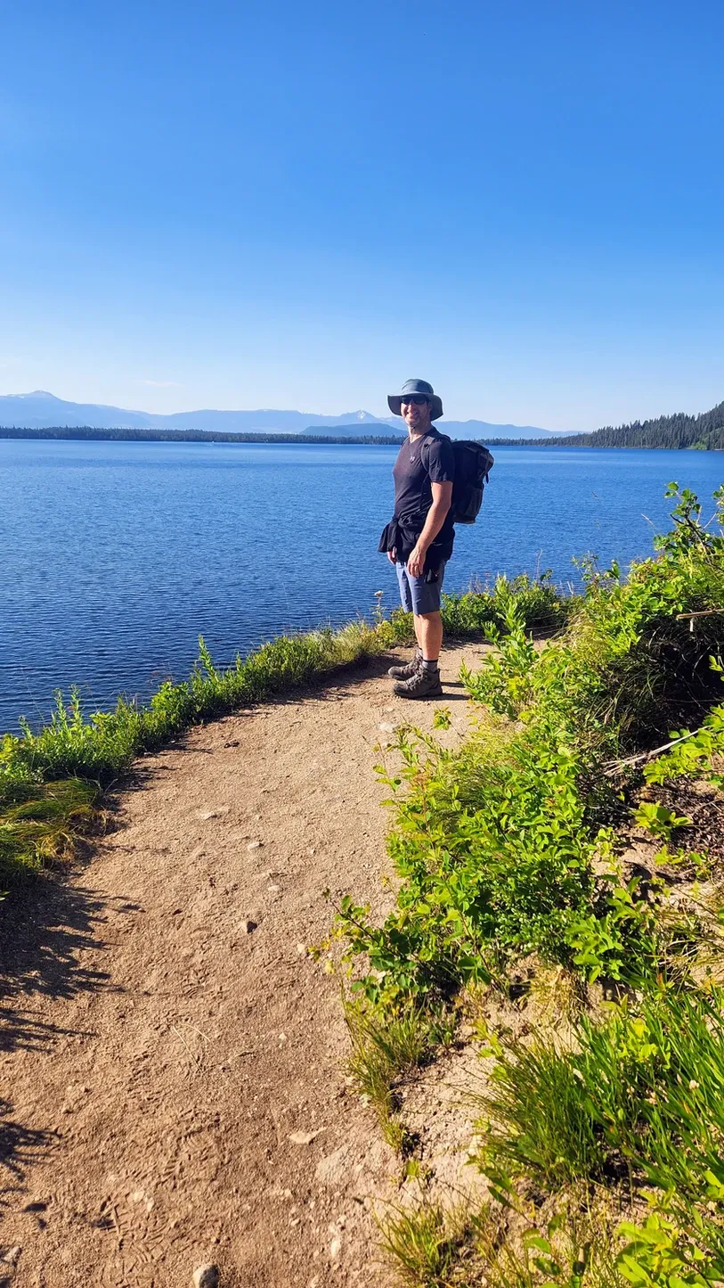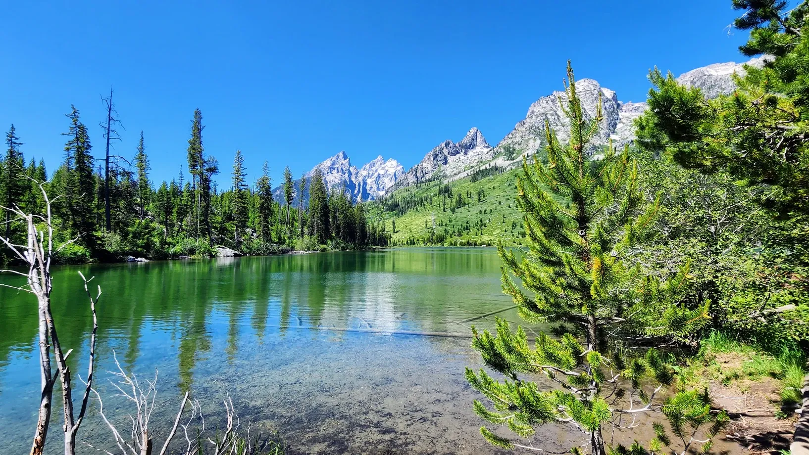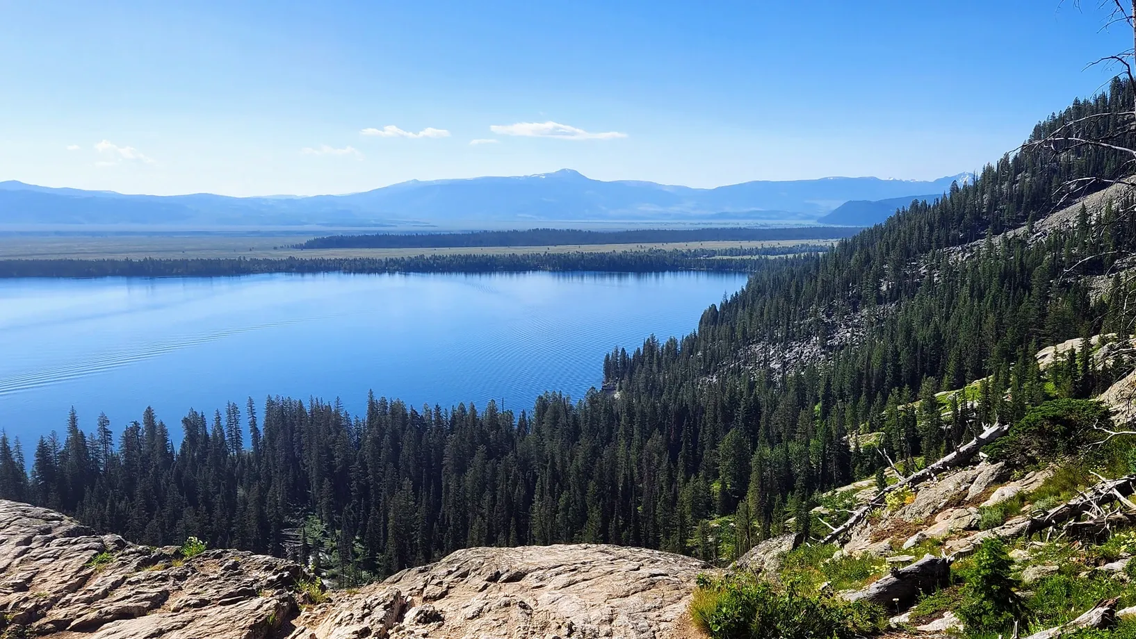 Jenny Lake is an iconic feature in the Tetons. We had stopped there for a short shoreline walk during our audio tour, but I had a specific hike planned since 2020. There is an overlook on the west shore of Jenny Lake called Inspiration Point, and there are a few ways to hike there. Option 1: You can take a shuttle across the water and then hike 1.8 miles to the overlook. The shuttles run every 15ish minutes and are $20 roundtrip. We already knew we'd rather save the money and hike, plus we'd want to get an earlier start than when the shuttles start running. Option 2: Walk around Jenny Lake, which would be about 2-2.5 miles, plus the remaining climb up to Inspiration Point. Option 3: Approach from the other side, after parking at String Lake, the lake adjacent to Jenny. When I was planning our 2020 roadtrip-that-wasn't, I had my sights set on a hike that included Jenny Lake and String Lake, with Inspiration Point in the middle. String Lake has a smaller parking area than Jenny, so we headed out early in the morning and had no issues finding a place to park. We first headed southwest along Jenny Lake for about 2 miles before veering off and upward towards Inspiration Point. This was the only climb of the hike, but given the looks on some people's faces, we think lots of people underestimate it. It's got some rocks that are slippery with dust, so wearing the right shoes is important. This was the only part of our hike where we saw crowds, unsurprisingly since a shuttle boat had just dropped people off.