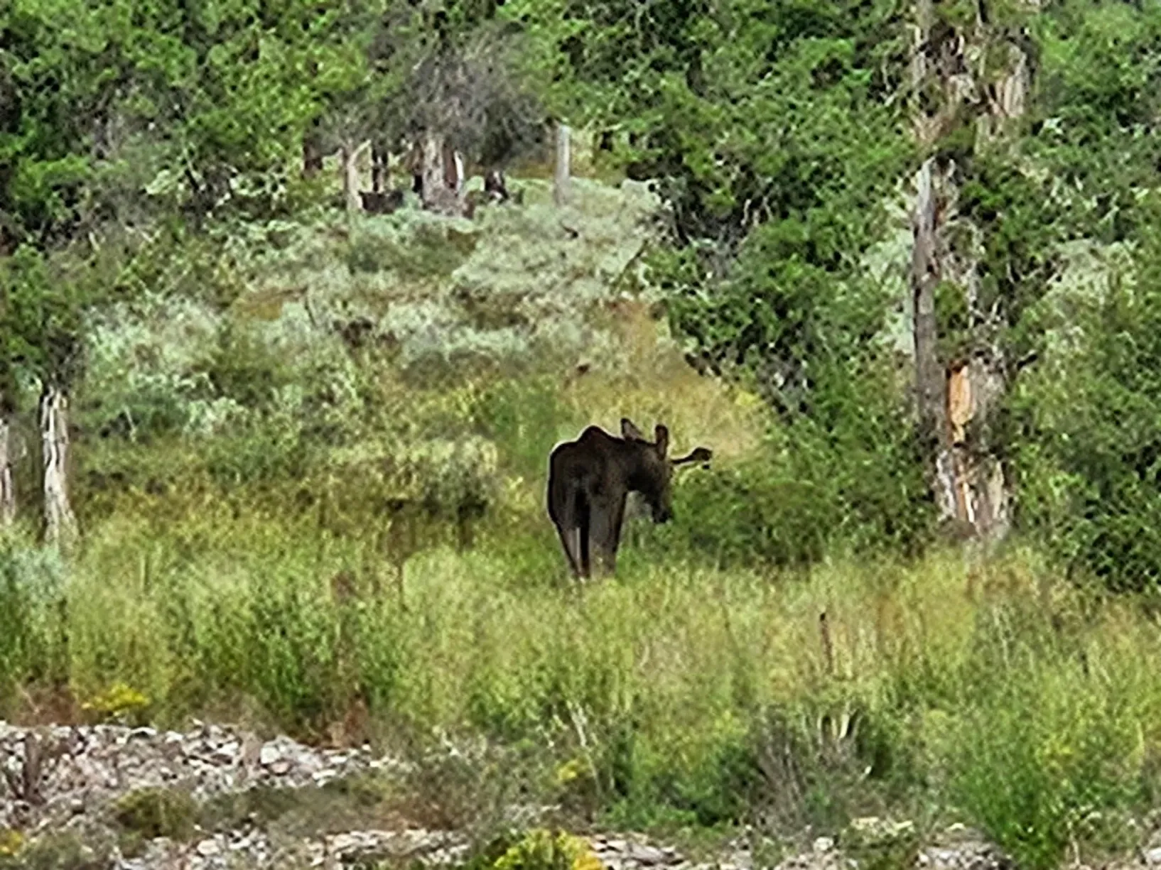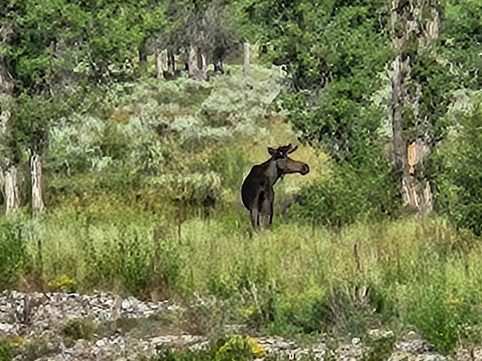 Alright, moment of truth. Did we finally end up seeing a moose? WE DID! After searching high and low - we spotted a moose twice, and both times were right up the street from our campground. Isn't that always the way?! The road to our campground runs alongside the Gros Ventre River, and that's where the moose had decided to hang out. We saw a female and apparently her calf, but her calf was surrounded by too tall grass for us to see it. This was at an overlook only a couple miles from our campground. Then, a few days later, we were coming back from running errands in Jackson and hit a traffic jam. We knew it could only mean one thing, and sure enough, an adolescent bull moose was hanging around the trees by the river.