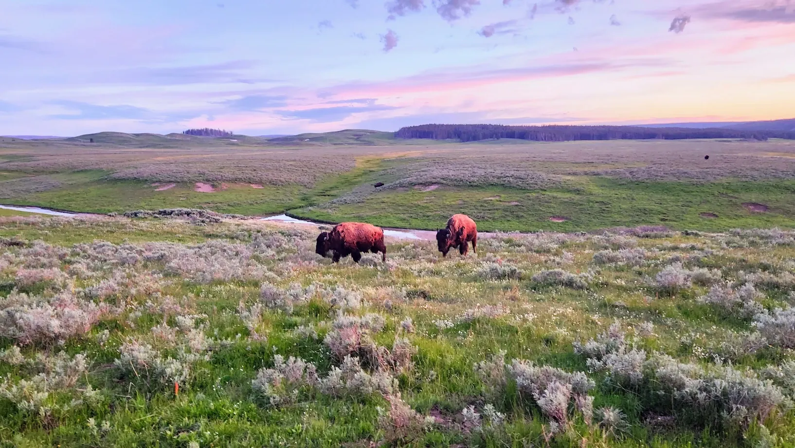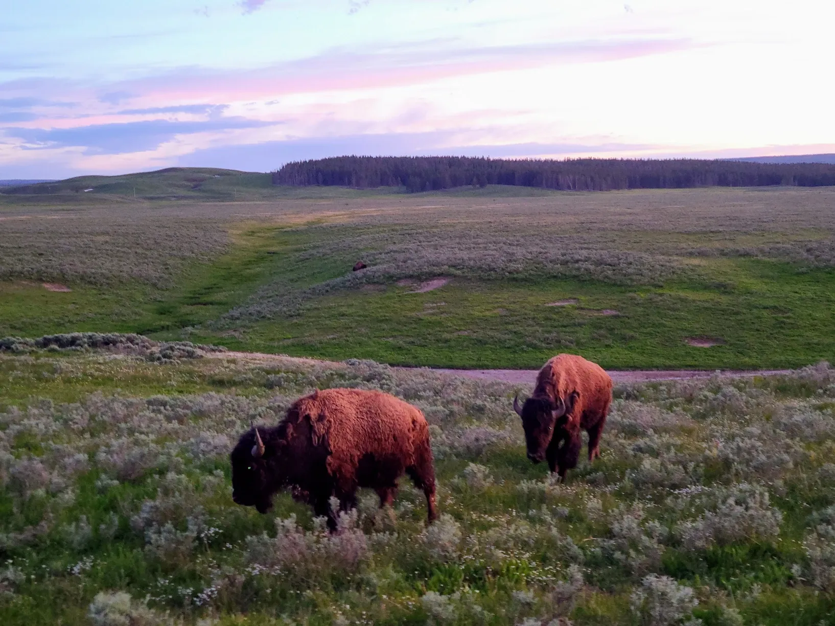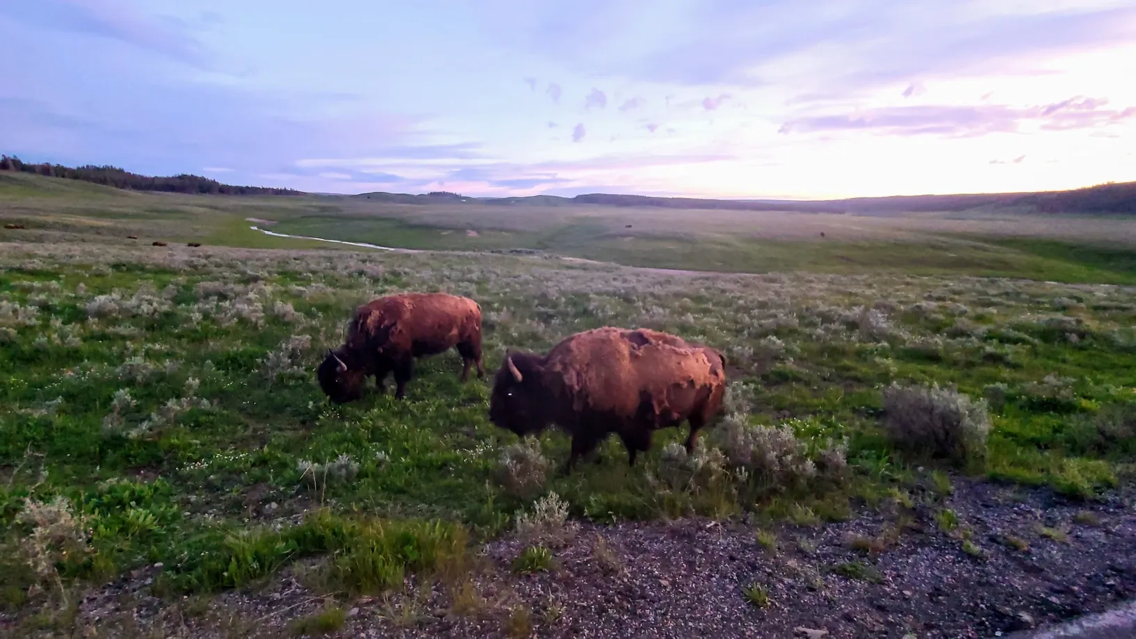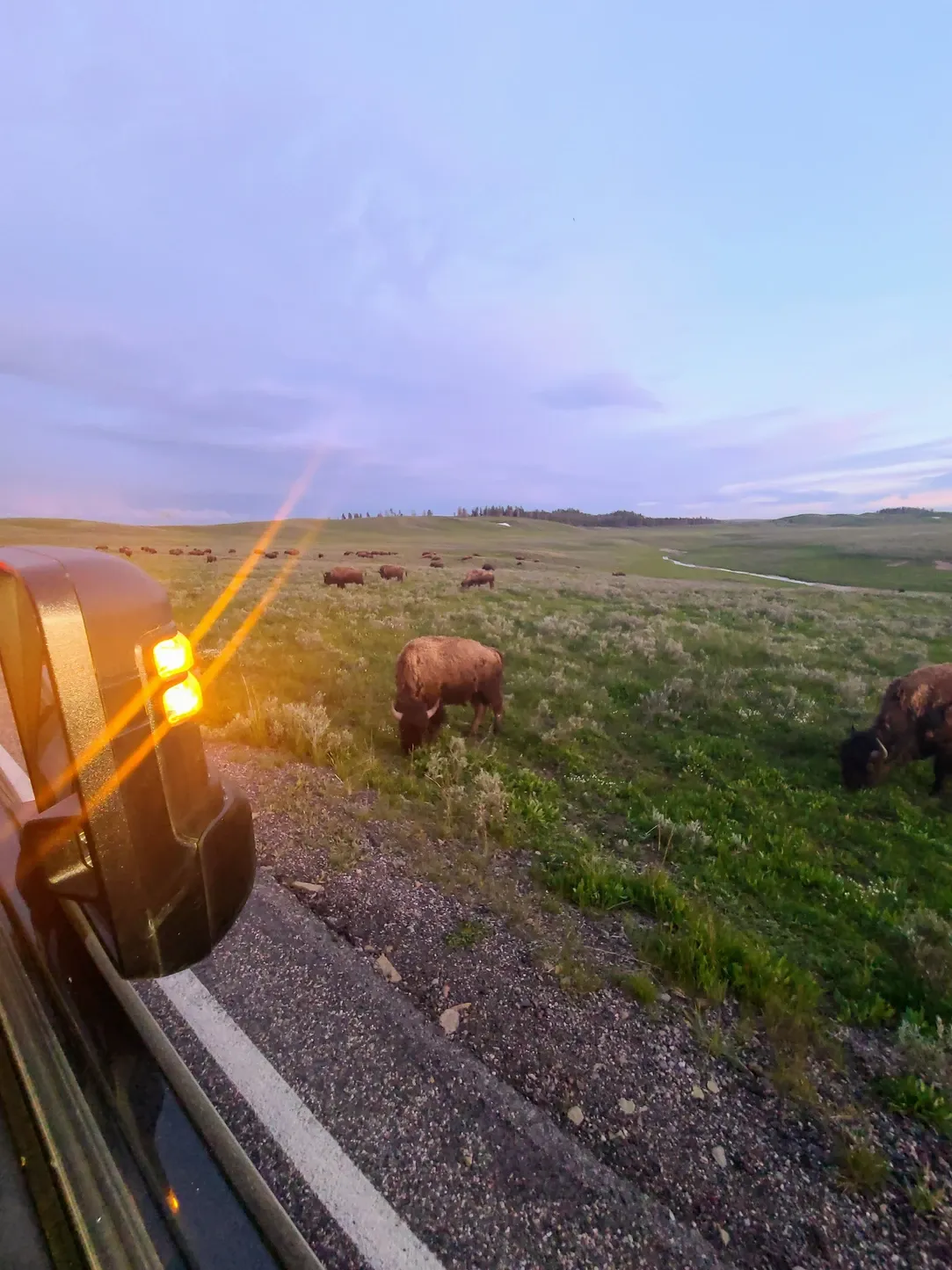 And sights we saw! The sunset that evening was stunning, and we got to watch it set over the river, reflecting pinks and oranges in the water. We didn't get much further before we got stuck in our first official bison jam. We thought it was amazing, especially because we were only the third car and had the herd walking right next to us, at times even crossing the road right in front of us. There's no experience like it. The jam made us lose the remaining sunlight, but it was so hard to care when we were living such a memorable moment.