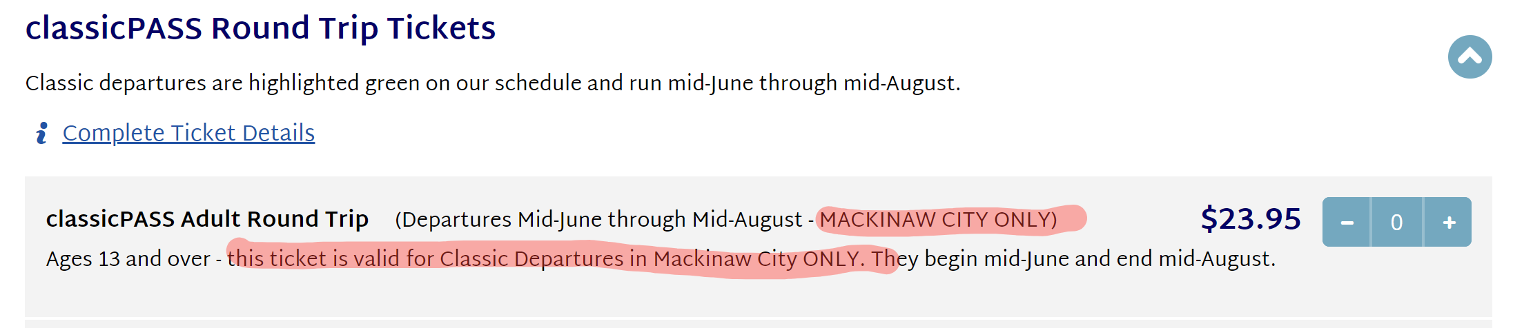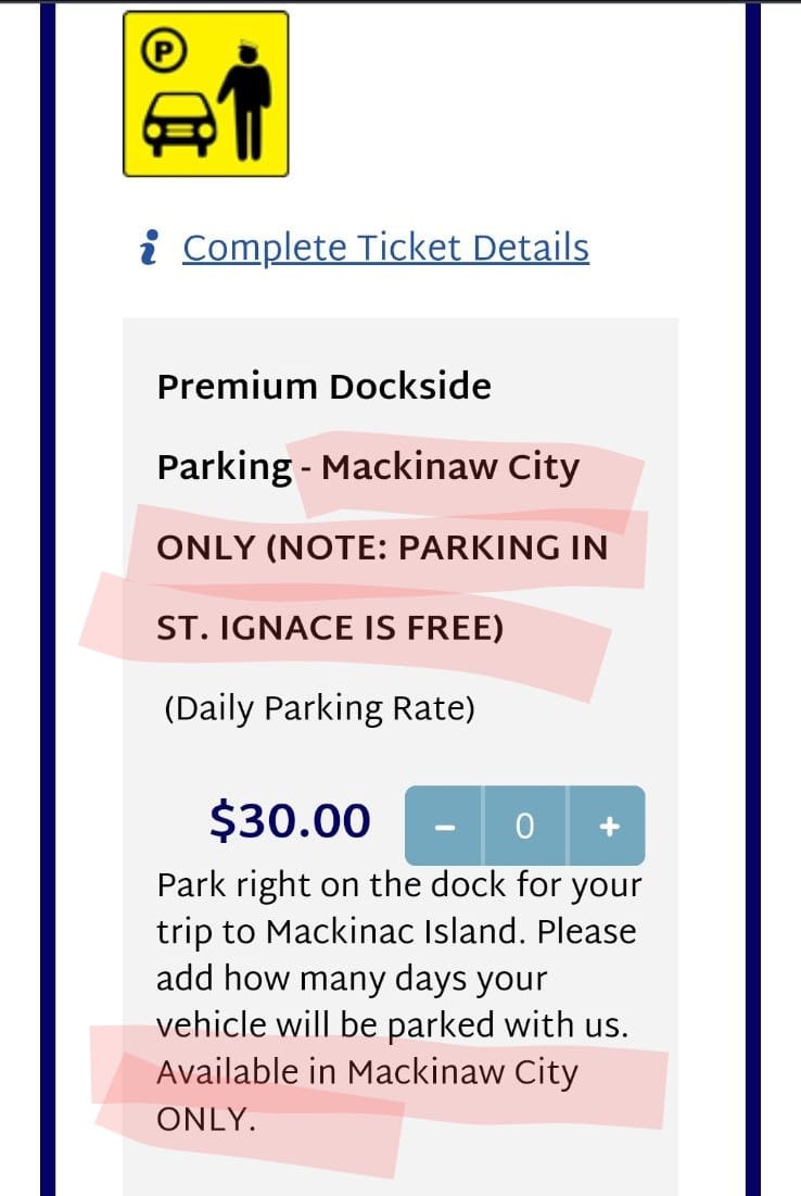 We discovered the same problem with the priority parking. Evidently this too is only available in Mackinaw City, but no one would find this out until they decided to buy it, went into the ticket page, and realized it wasn't available. That's if they noticed at all. The writing is there, but it's not super visible unless you diligently read the descriptions, which lots of people probably don't when they already feel they've made their decision on what to purchase. What Star Line should really do is put a landing page where the customer clicks whether they're departing from St. Ignace or Mackinaw City, and then show the available options. But they don't seem to care about making things easier for the customers.
