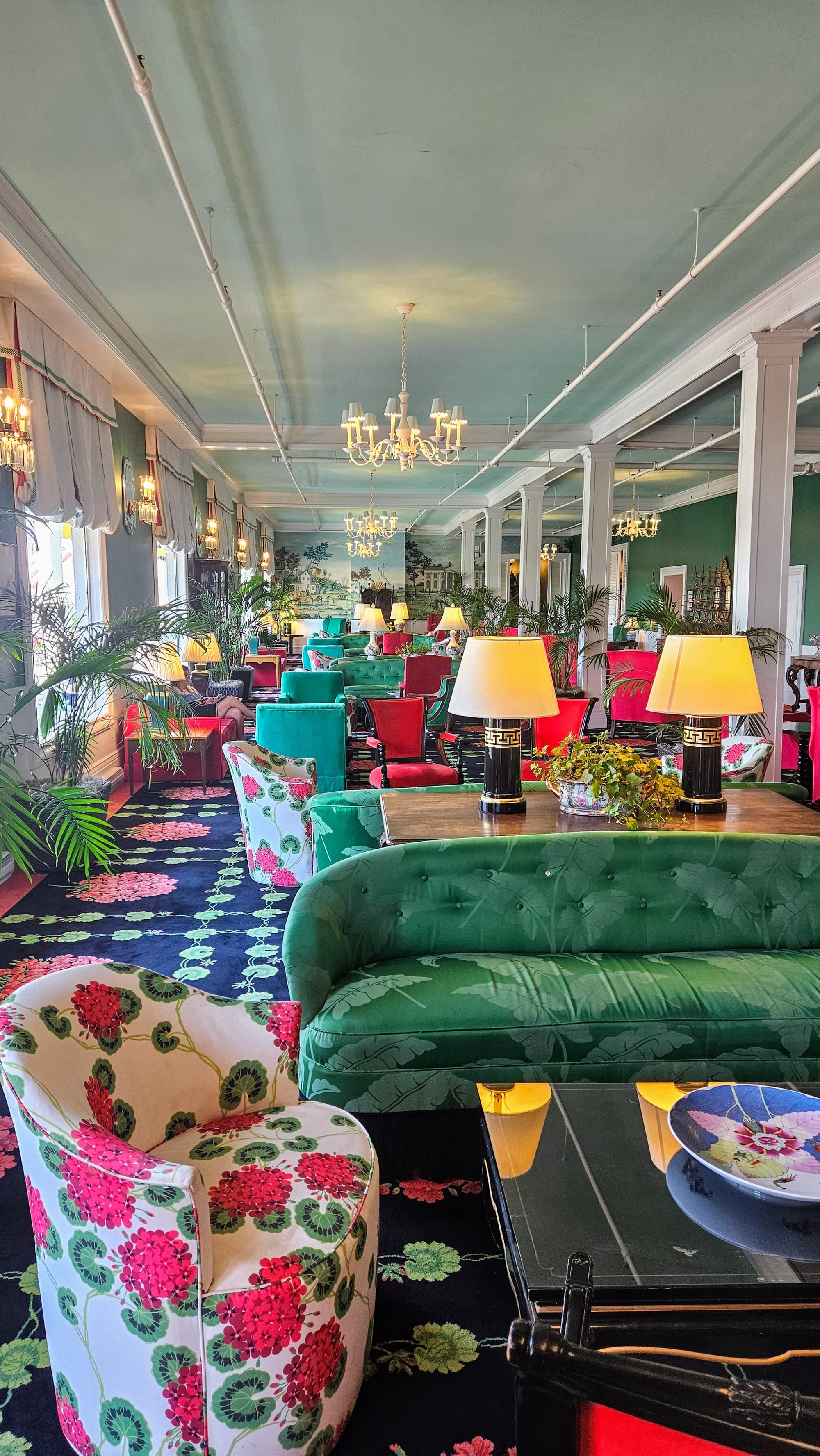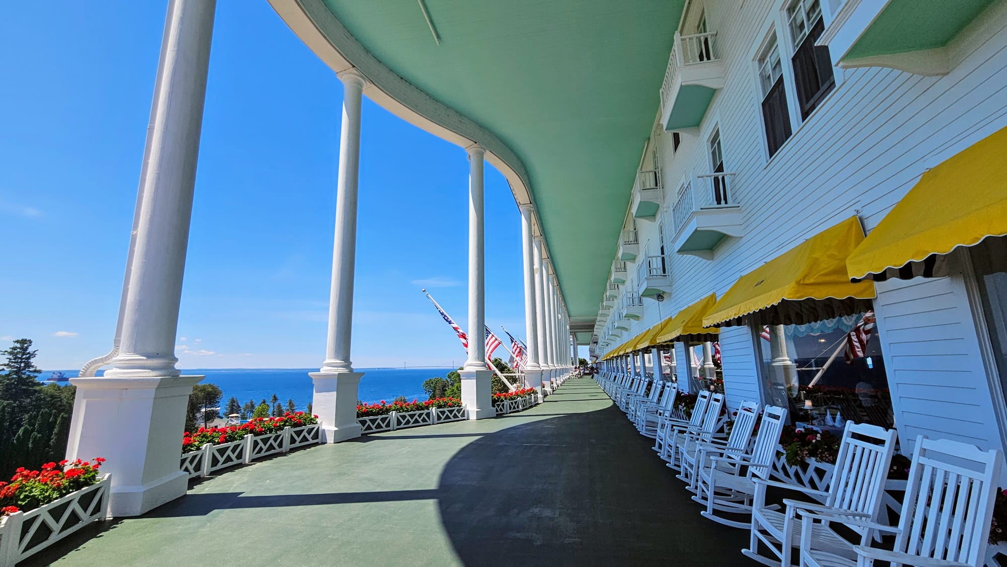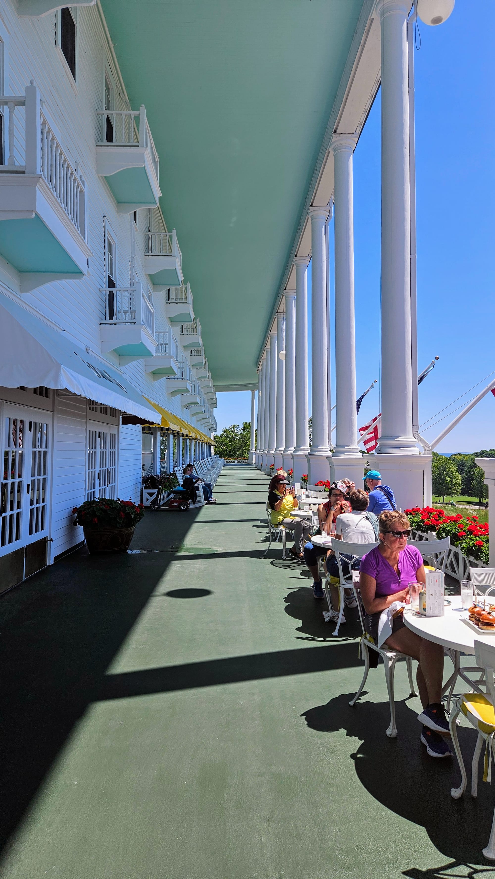Now that we were no longer dependent on the carriage company, we hoped to turn the day around. We walked the .6 miles to the Grand Hotel and tried to figure out where to redeem our tickets for admission. Admission to what, exactly? We couldn't figure it out. Online I read that admission covered access to the lobby and porch, but we walked straight up the main steps, onto the porch, and then into the lobby.