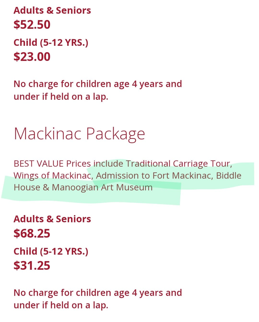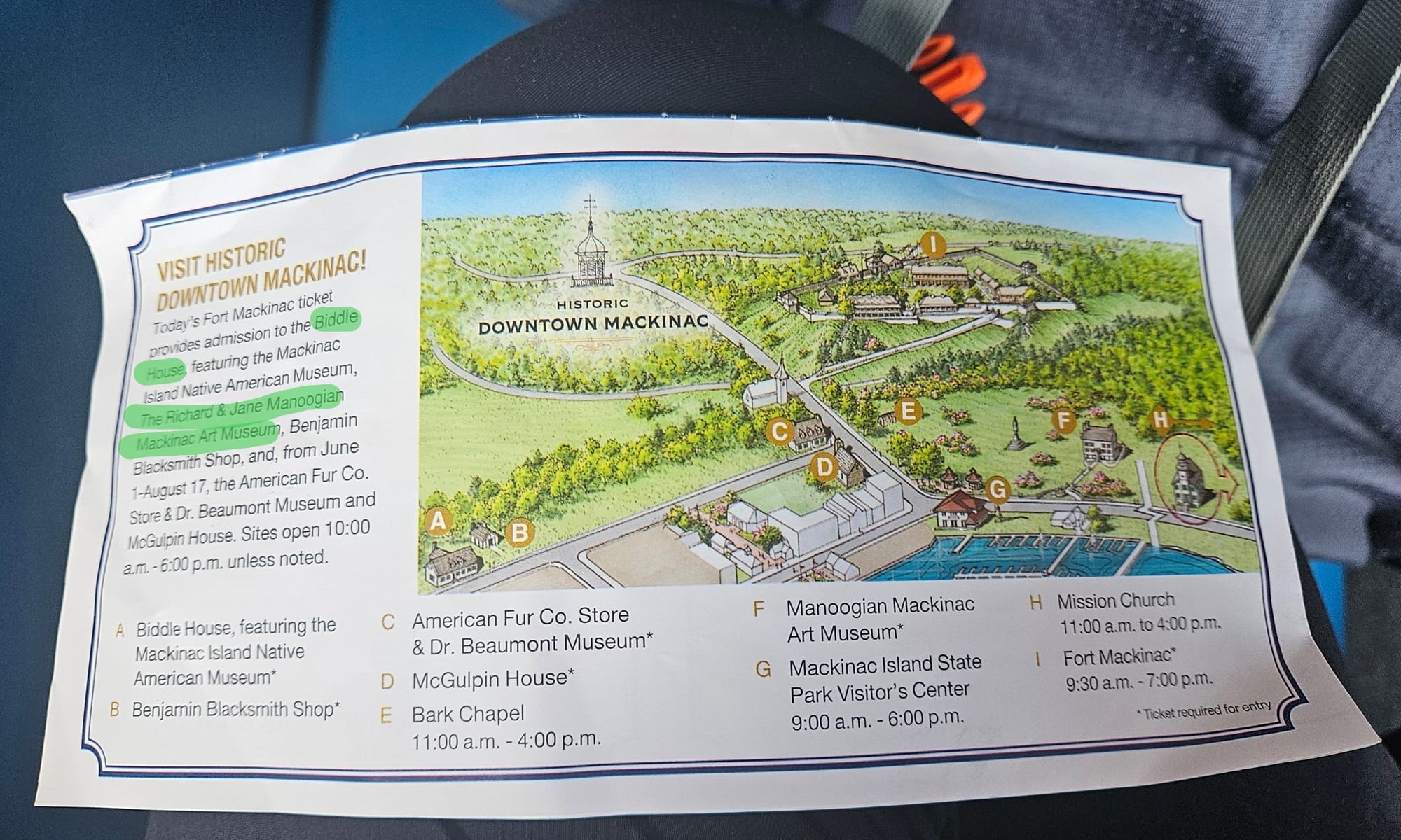 "What are we looking at, Nicole?" Oh, I'm so glad you asked, dear readers! On the left is the map we got from Fort Mackinac, which lists all of the places we could visit for free with our Fort ticket. On the right is the combo ticket offered by the Carriage Tour Co. Notice how they make it seem like you are getting ALL THOSE THINGS for the price of the ticket, but now we know that the Biddle House and Manoogian Art Museum are included in the Fort ticket anyway! Except most people won't know that until and unless they go to the Fort first, but the Fort is way across the island and most people are going to take the carriage ride there. Deceit deceit deceit.