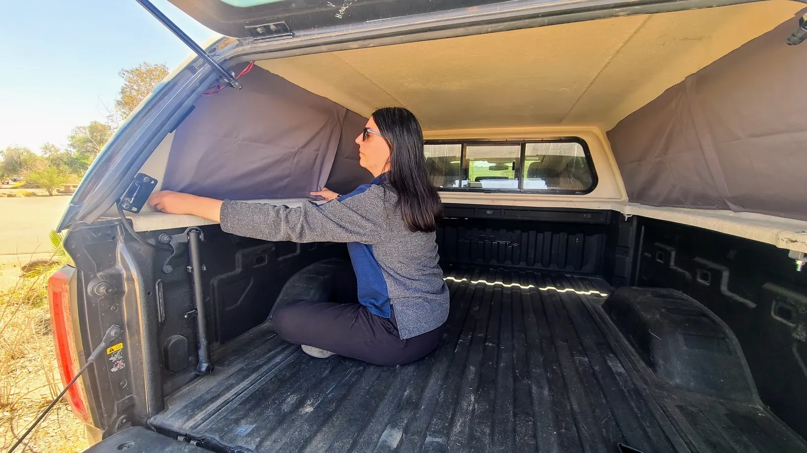 The first priority was to "stealthify" our truck bed. We would be bringing the truck into Las Vegas at least once, and since we store a lot of our belongings in the back of our truck, we feel more comfortable covering up the windows so people can't see what we've got inside. We'll often not take our truck into big cities due to its size and auto thefts, and so last time we went to Vegas, we actually rented a car for a few days. We did the same when we went into New Orleans earlier in the year. This time, though, we didn't want to spend the money on a rental, and we clearly had other fish to fry, and so we fashioned some curtains for the truck cap windows.