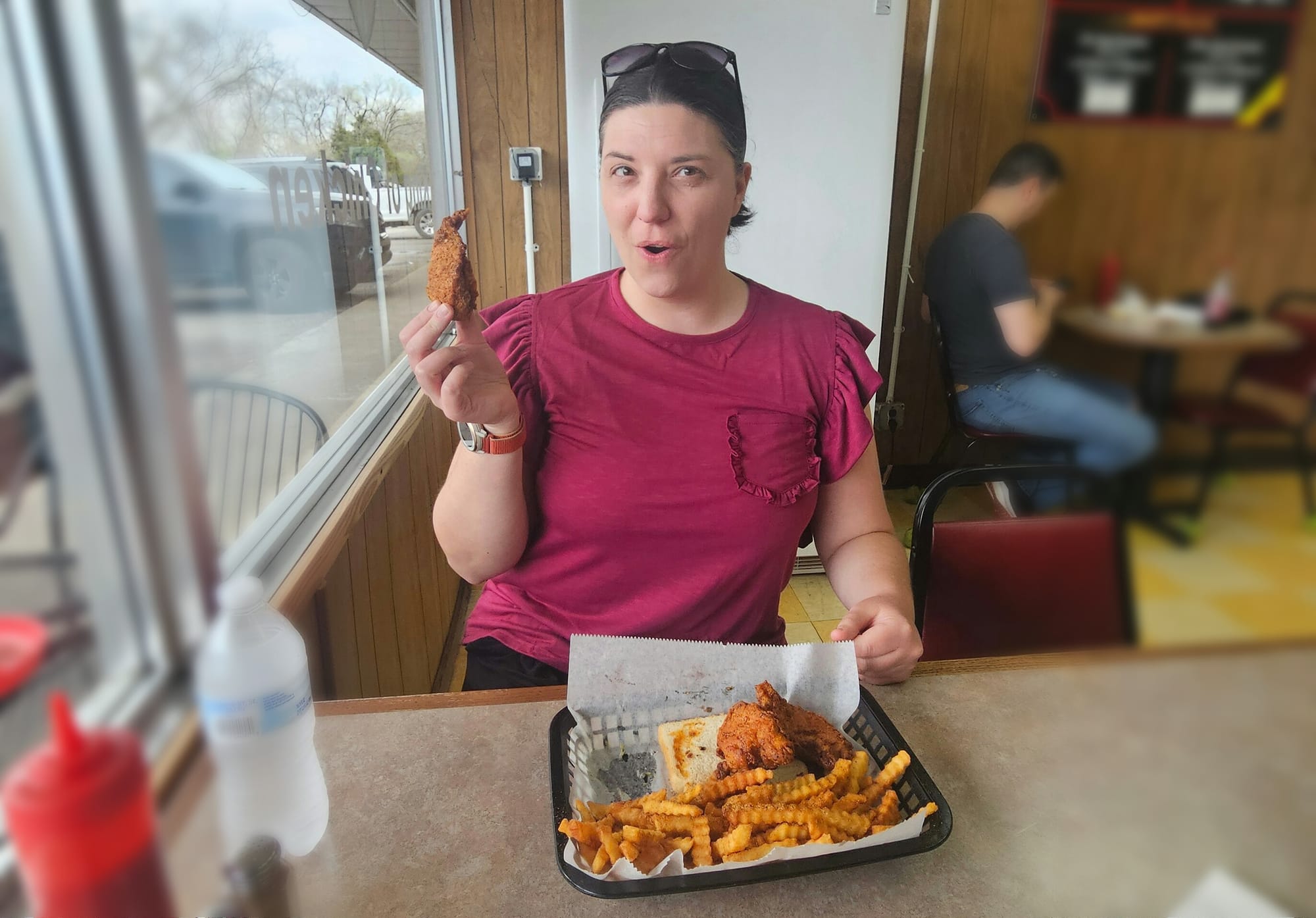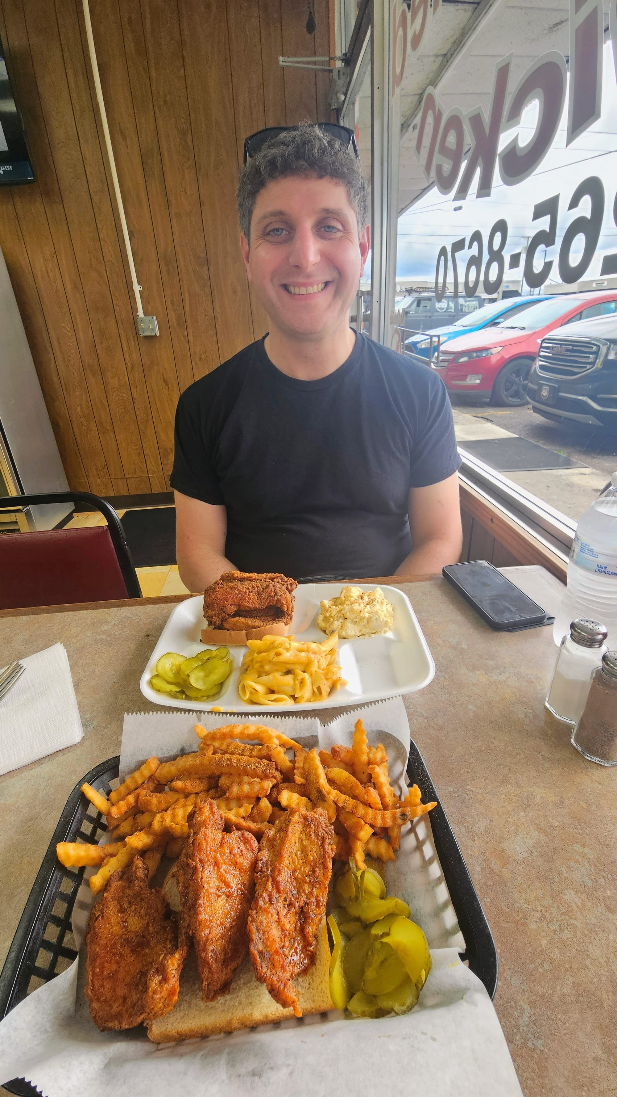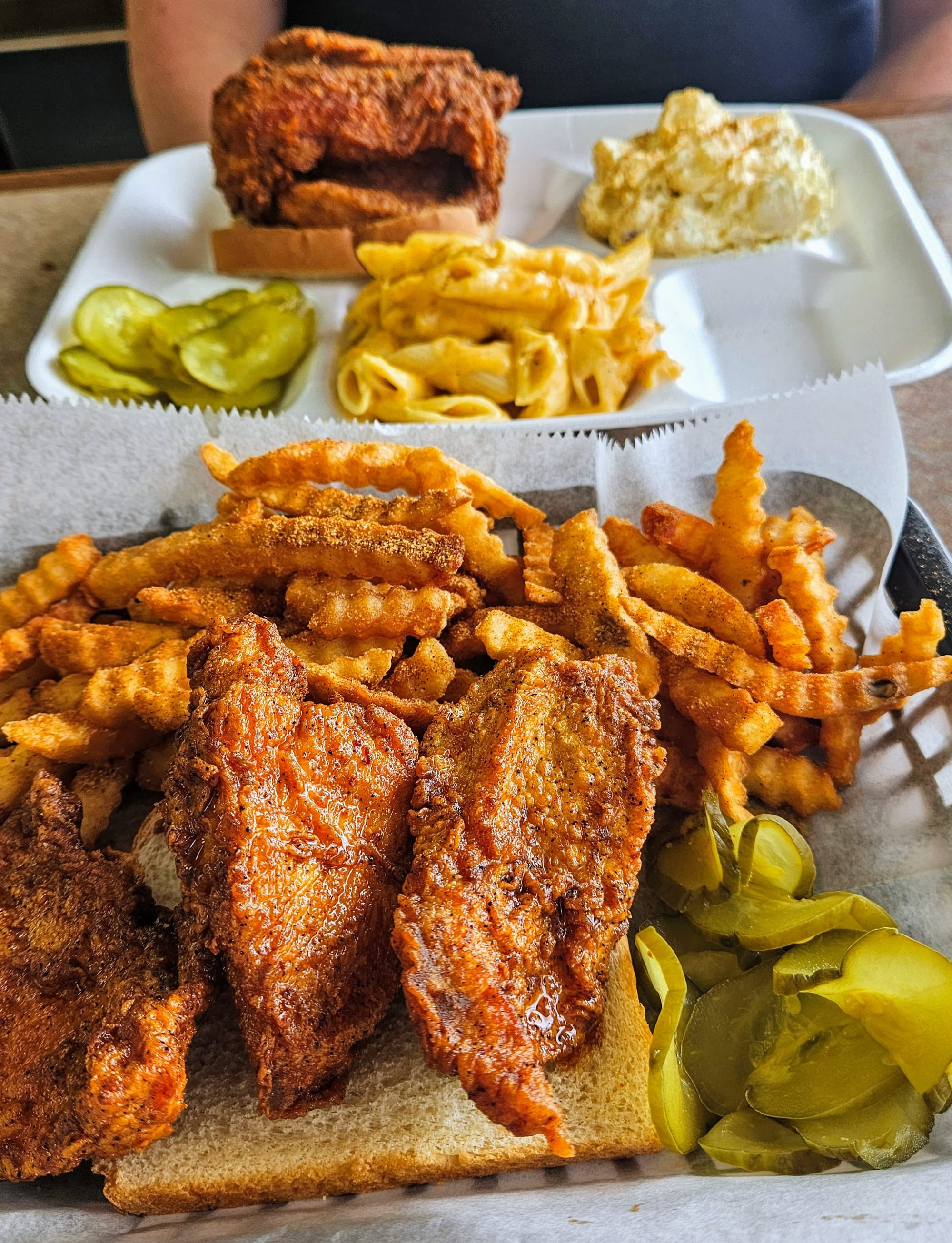Traditionally, the chicken is served on white bread and topped with pickle slices. Meals typically include one or two selections from a list of sides, such as fries, grits, greens, mac & cheese, and other popular southern accompaniments. We knew, however, that we would need to focus on keeping our bellies free for all the downtown chicken we'd be eating in one day. Sticking with counter-serve locations helped, as many of them had options for snacks or smaller meals, and we didn't have the pressure of ordering more. The biggest decision, however, would be which level of heat to select. Each establishment listed different, varying levels, but the general consensus was that medium was respectably risky, and anything hotter would have you questioning your life choices. Some places offered a no spice option, but that was not the case at our first stop.