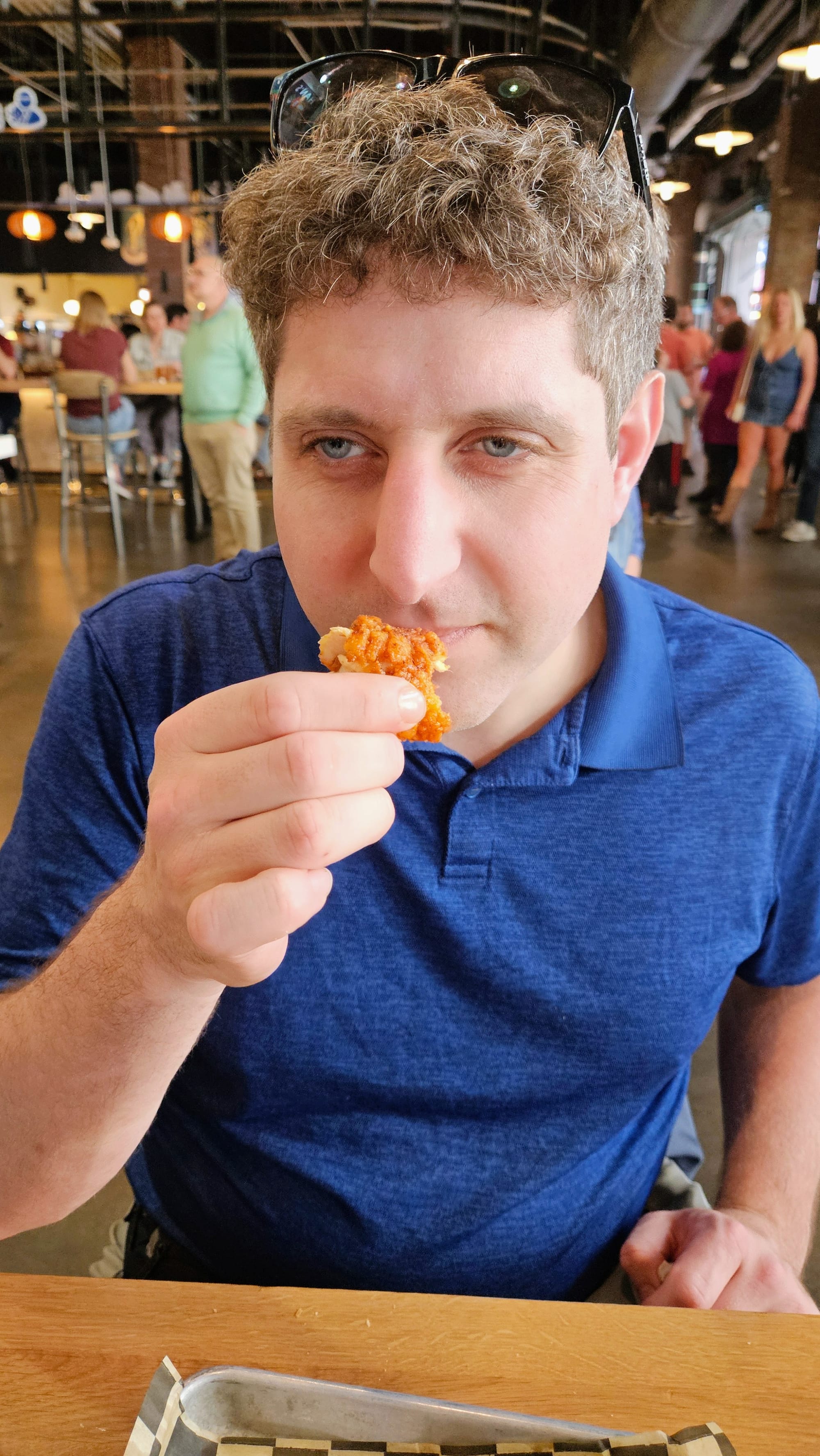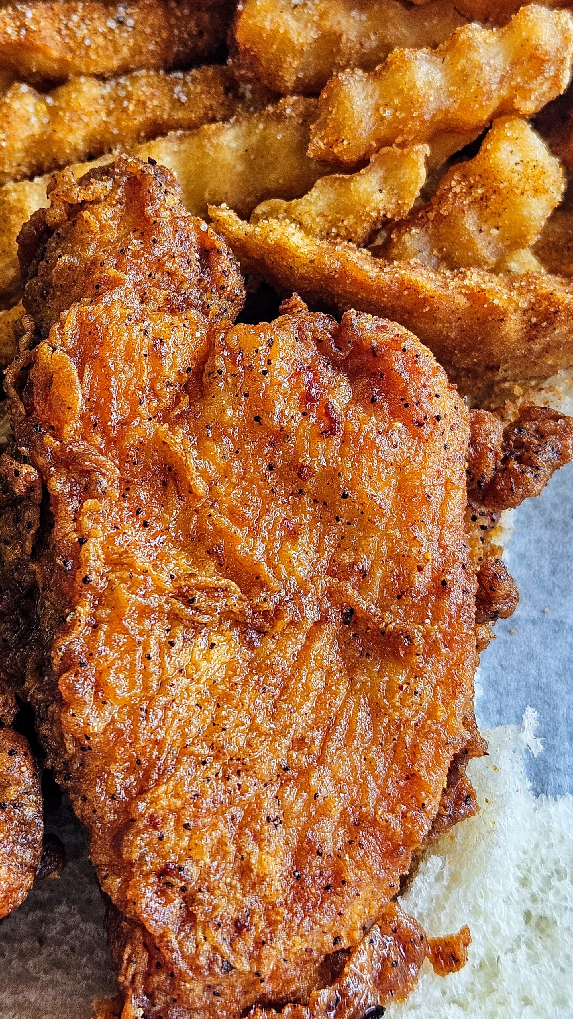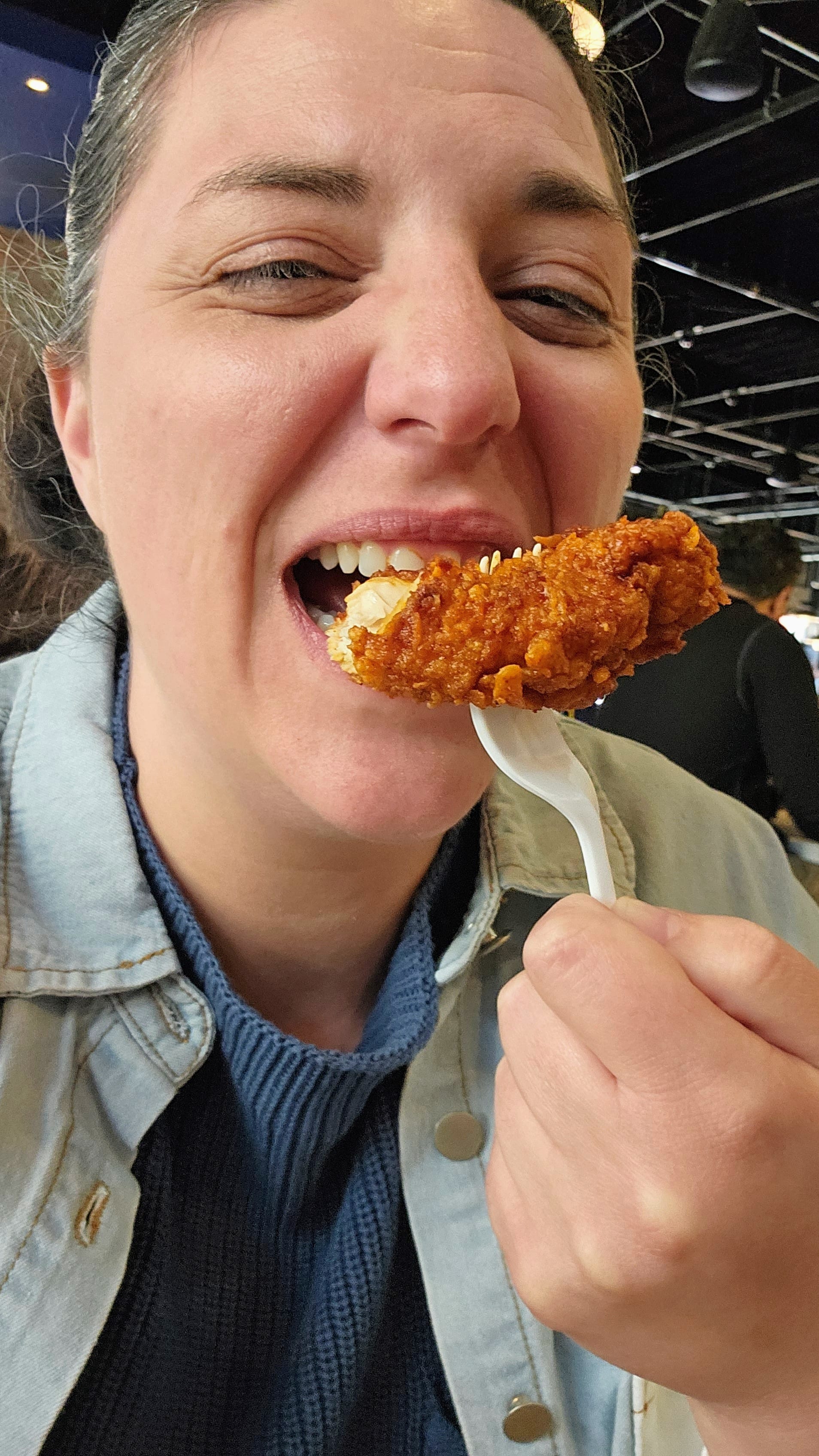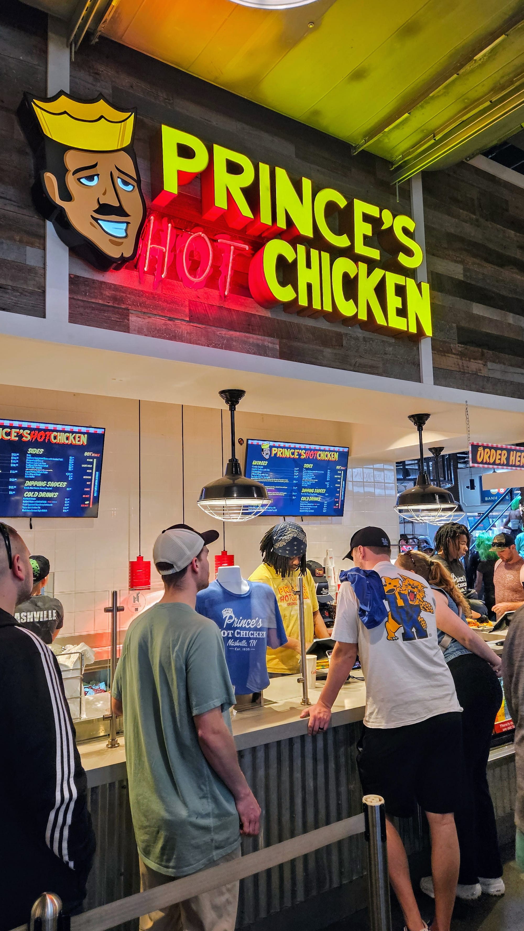 Next door to Hattie B's is Assembly Food Hall, the current location for Prince's. We looked online to see if we could order ahead of time, but nothing on the website allowed us. We went inside the food hall and found several other restaurants that we would have rather eaten at, but we were deep into our quest now! We got in line at Prince's, which wasn't long at all, but we quickly noticed a sign with a QR code that said "Skip the line. Order online." Huh. We scanned it, and sure enough, it took us to a site that wasn't available through the main website home page. We discovered that they only want customers ordering when they're already at the location because they immediately put the orders in. Our online order was ready in no time. We only ordered a few tenders with no sides, since we had already had our full lunch at Hattie B's. The chicken did still come with bread and pickles, though. We ordered "hot" because we knew that if Hattie B's babied the tourists, Prince's would, too.