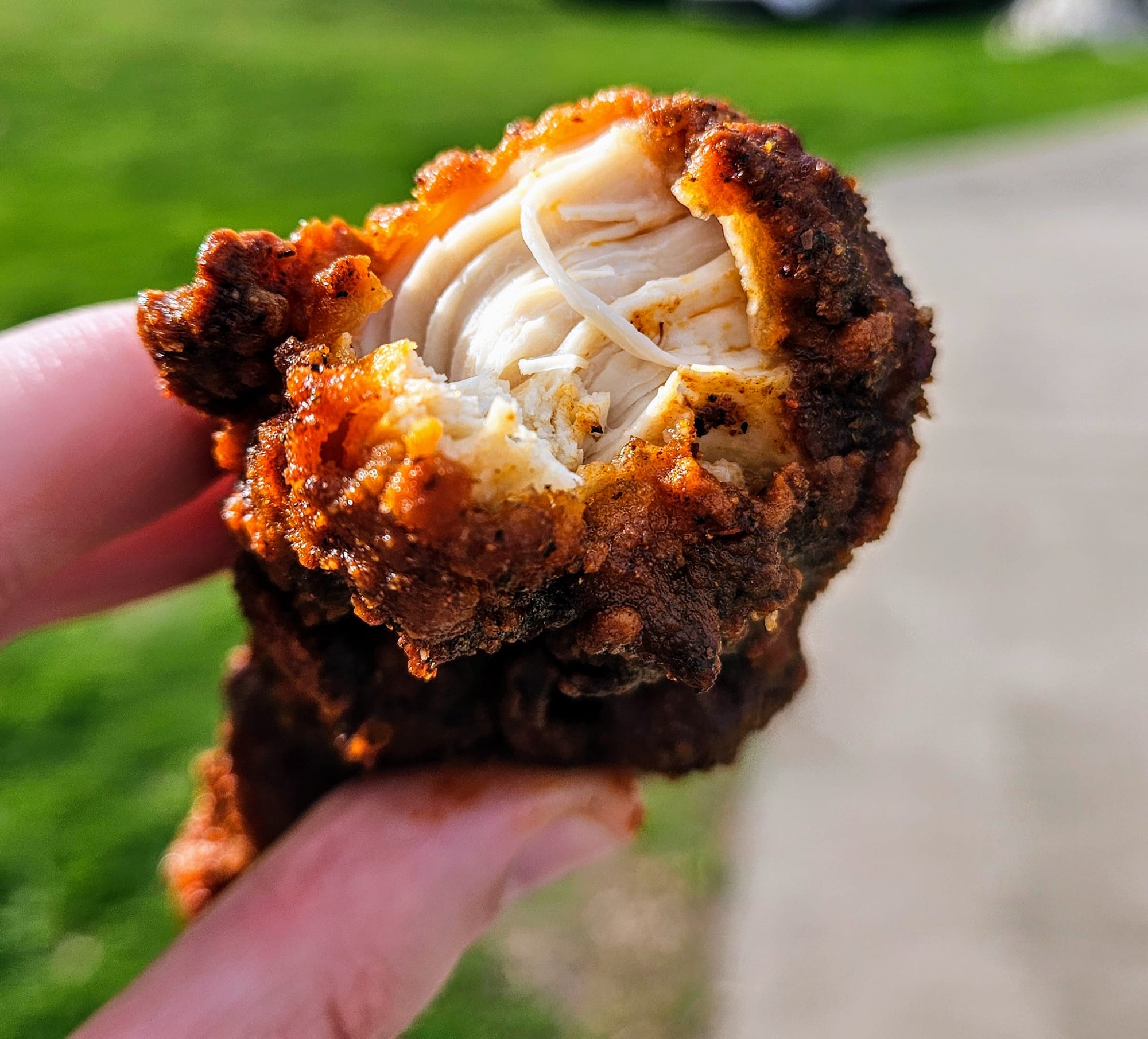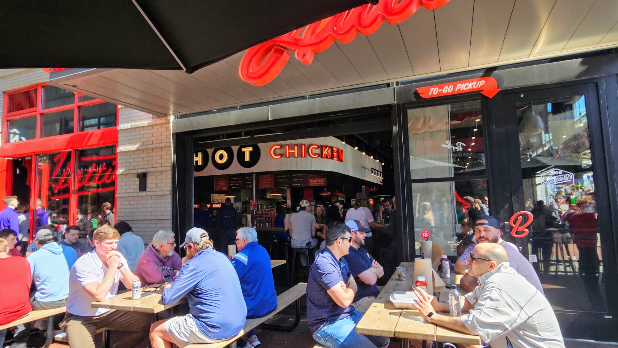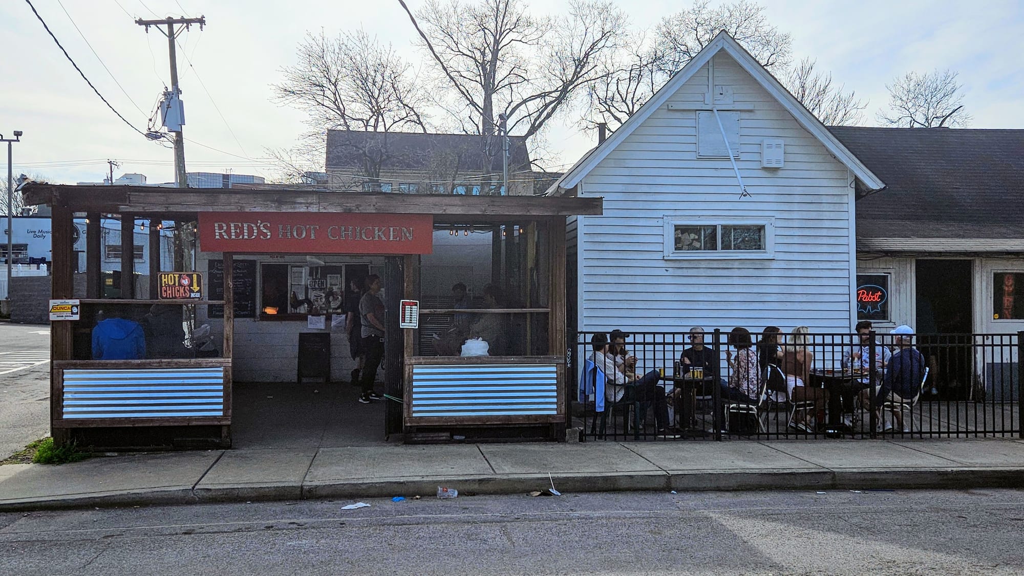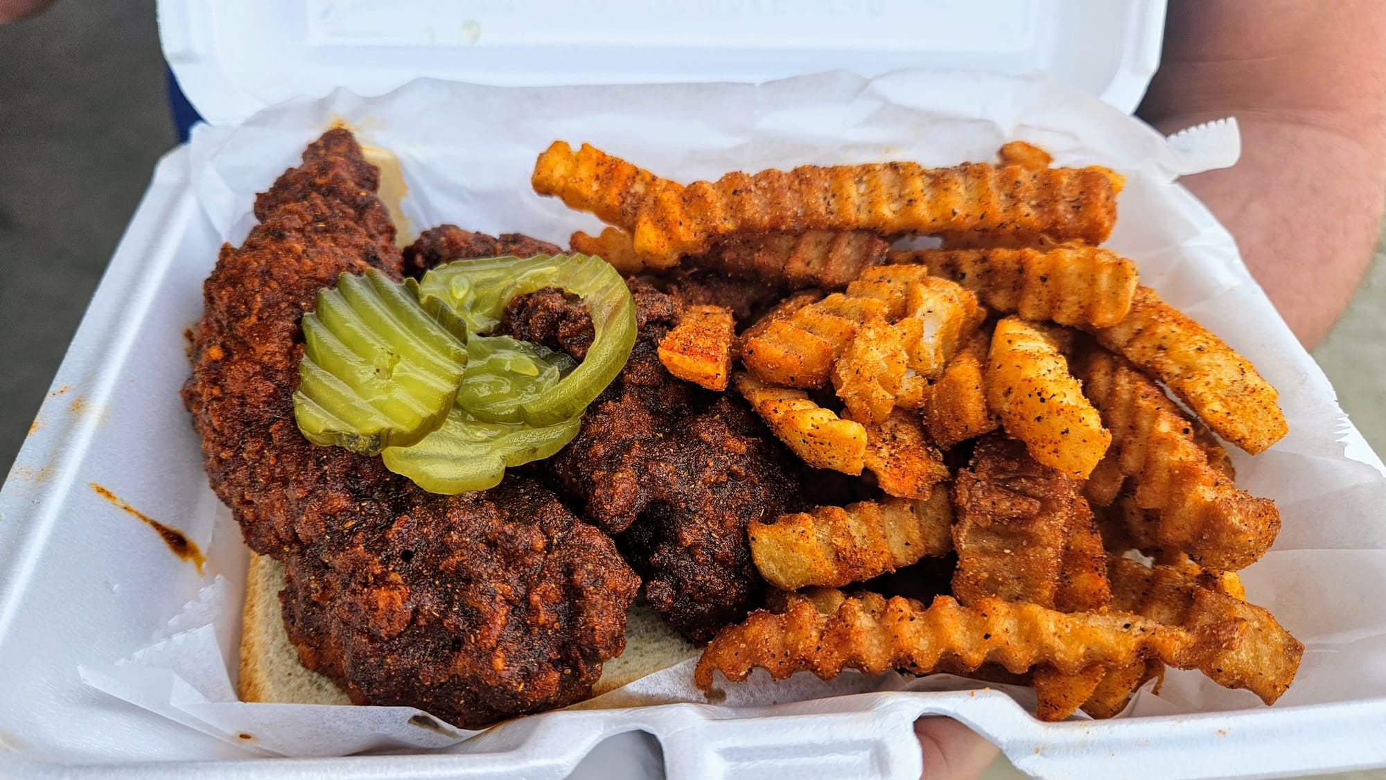 Red's is located a block away from Centennial Park and is a popular haunt for Vanderbilt students. They have a walk-up window where we placed our order of tenders, which came with fries. Level: medium. We assumed Red's wouldn't baby the college kids. 15 minutes later, we had Styrofoam box in-hand. We immediately noticed that the tenders were thoroughly seasoned and had more dry rub than the other city restaurants. The chicken was cooked perfectly, and we determined that the sheer quality of chicken used at all four places was consistently above average. The breading had tons of flavor, but since we weren't really fans of the flavor in general, we actually would have preferred a little more subtlety. Perhaps we should have ordered "hot" and masked it a bit! Spice-wise, we could have handled the higher level, but we think of all the restaurants, Red's got their ratings most accurate. The "medium" did in fact taste like a solid, middle-of-the-road capsaicin punch. It aligns with our theory that, the further you get from downtown, the hotter the spice levels get.