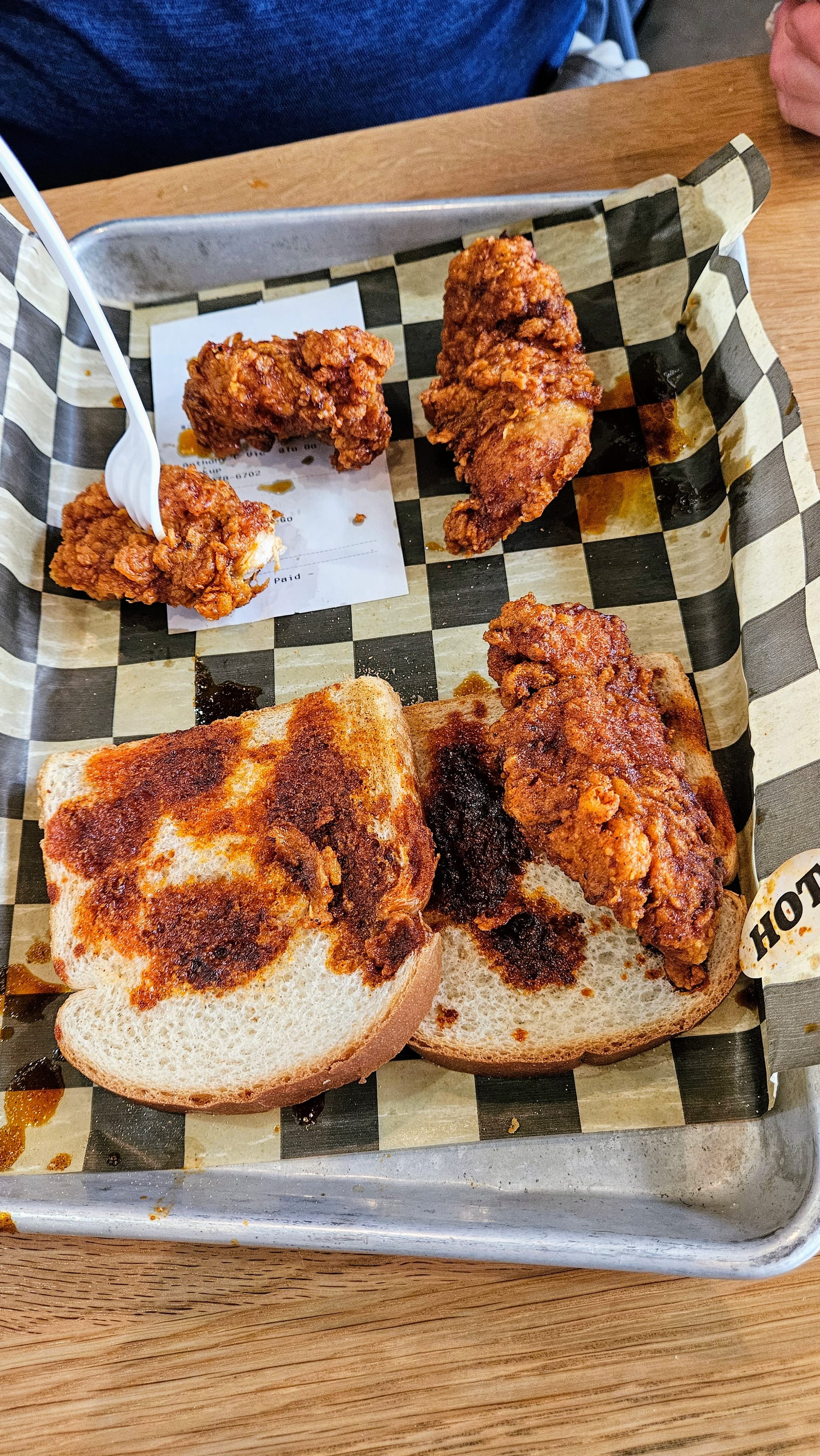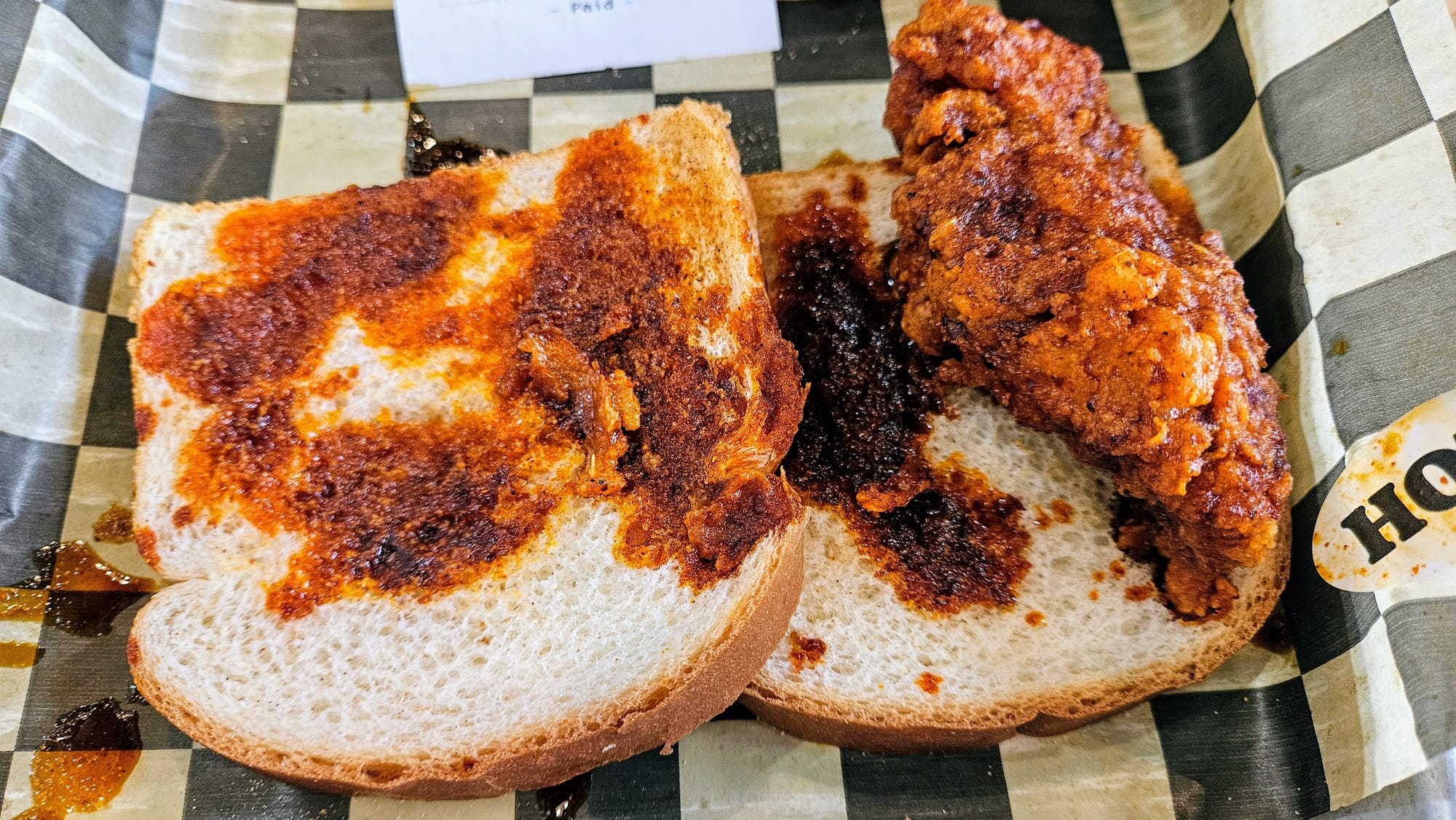 We had an inkling that this would be our least favorite, and we were right. Even the look of the chicken wasn't as appealing as the last two places. It was greasier and less plump. One bite and we were immediately smacked with a weird vinegary taste. The greasiness made the bread underneath extra soggy. As expected, the spice was far too mild for a "hot rating," but it lingered more once it did hit.