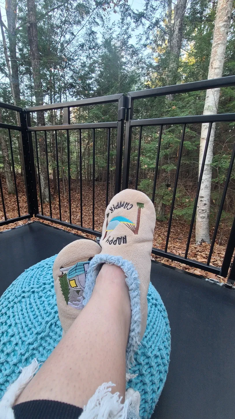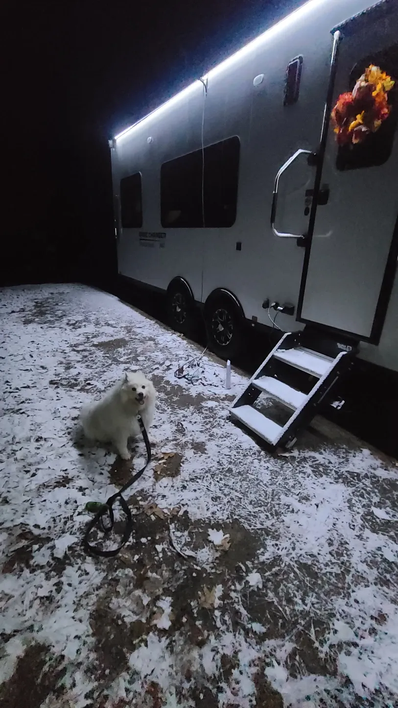 We took advantage of this November heat wave with some patio time, and what a campsite to put down the ramp! The woods was so quiet and peaceful, and again in distinct juxtaposition to the surrounding air, we soaked in the view that looked like winter. The daylight temperatures reached the 70s and nighttime temps dropped to the 50s, which for us was still patio-range...just with a little more bundling up. For a few nights, the pets got to enjoy the fresh air into nightfall.