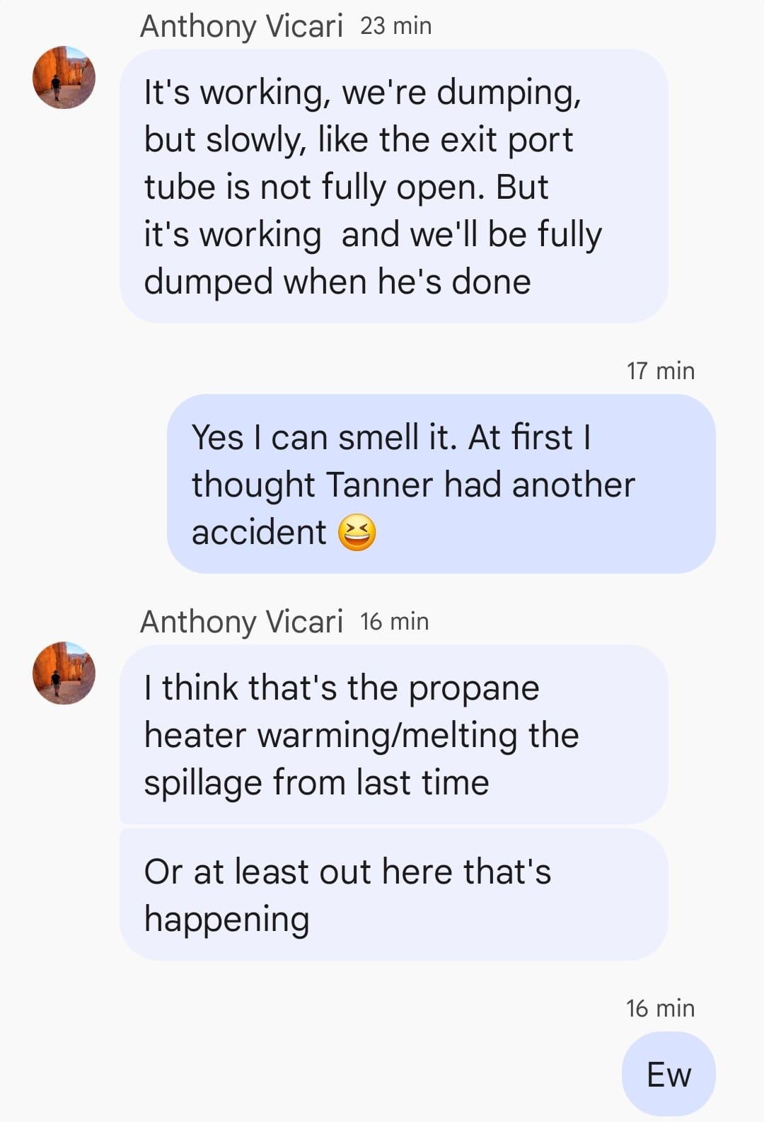 Without agitation, the tank treatment wouldn't work to its full potential, but we figured adding some was better than nothing. Then, until James came back, we committed to using the house bathroom as much as possible, and keeping our RV bathroom breaks to liquid-only. The good news was, we weren't completely clogged, and we still had some ability to flush thinner liquids. We could make do, as long as we didn't make doo-doo. In fact, using the toilet for number one was part of the solution! More liquids were good, no matter what they were.