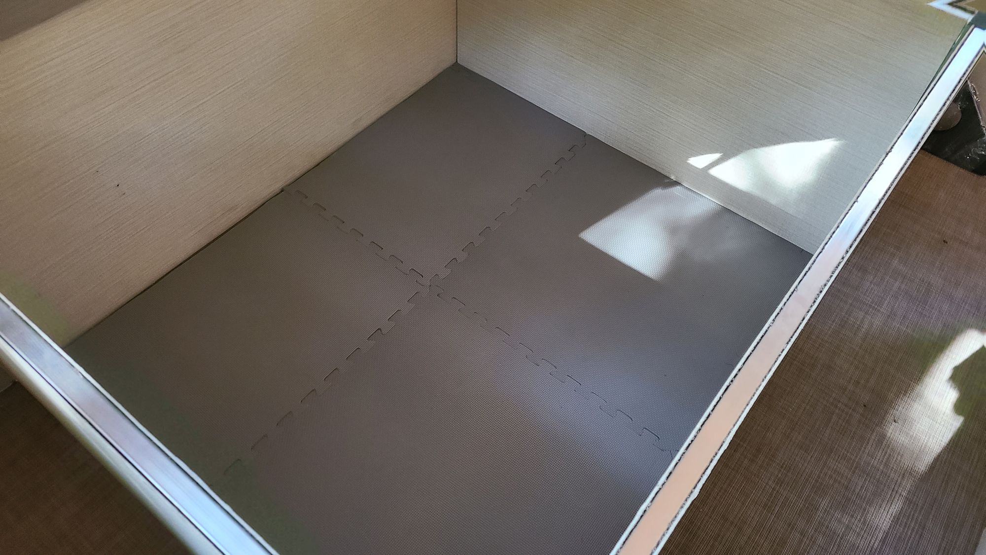 While Anthony got to work, my first task was to also add some extra insulating materials. I started by putting foam tiles in the storage space under the bed.