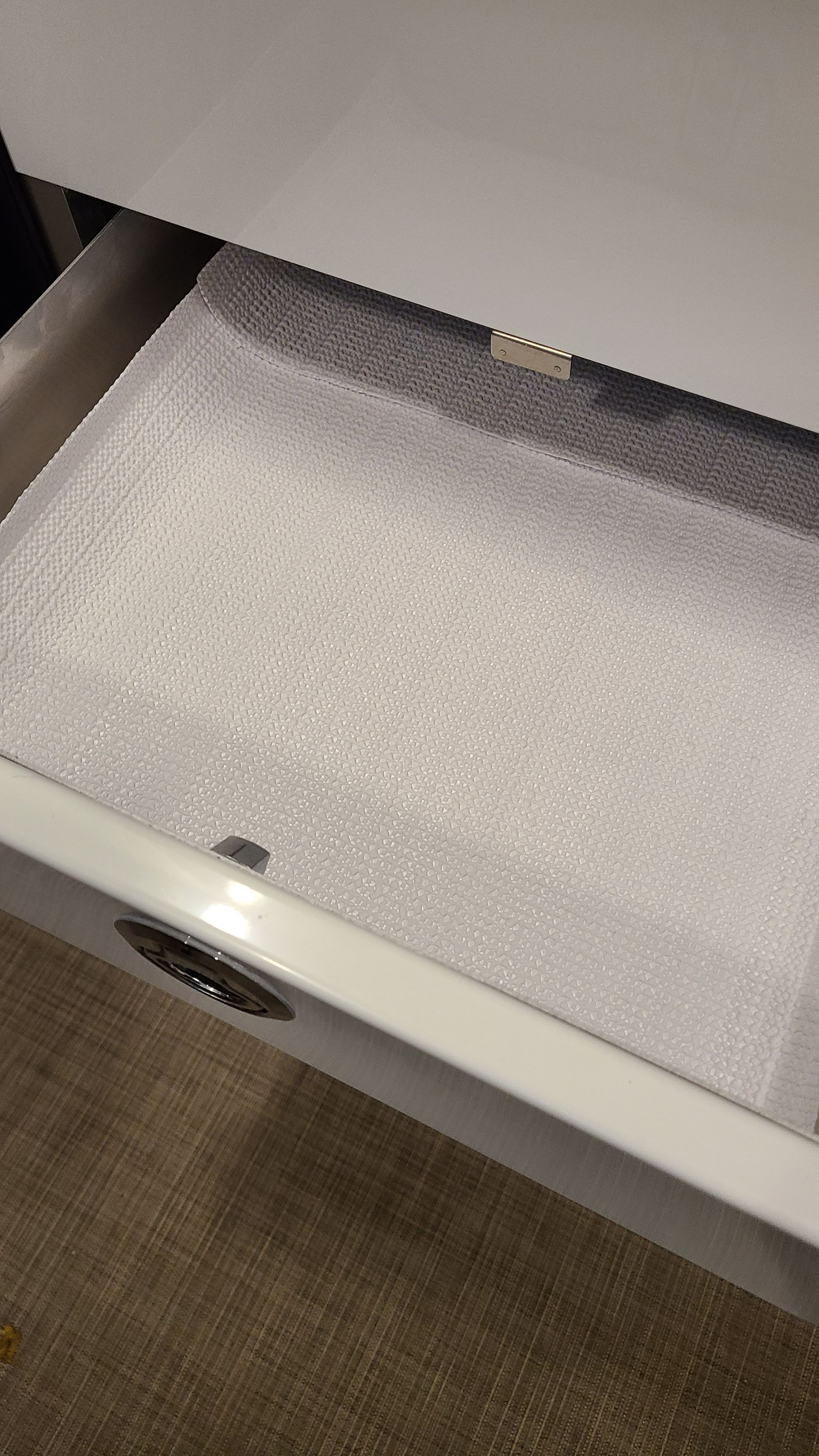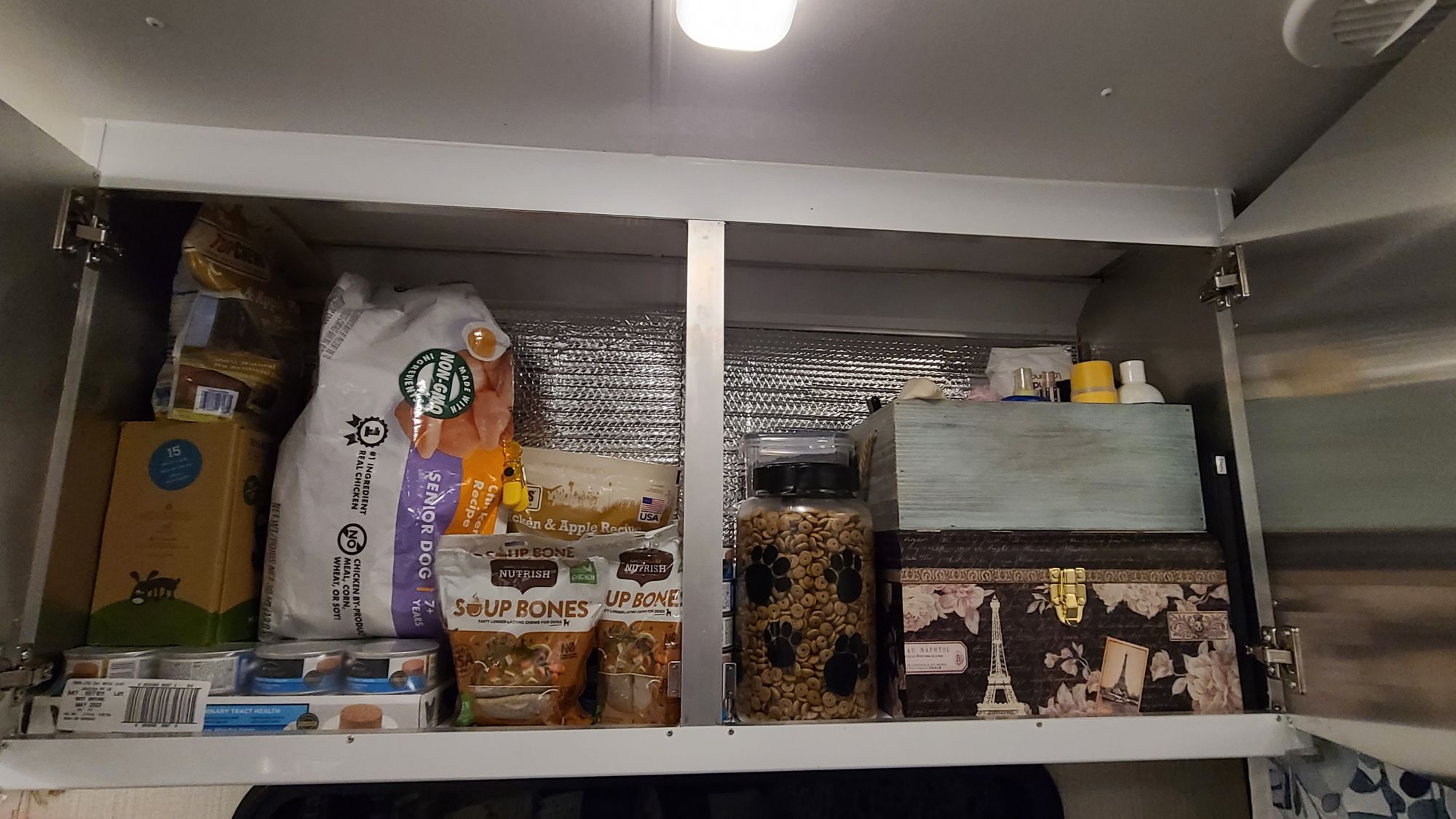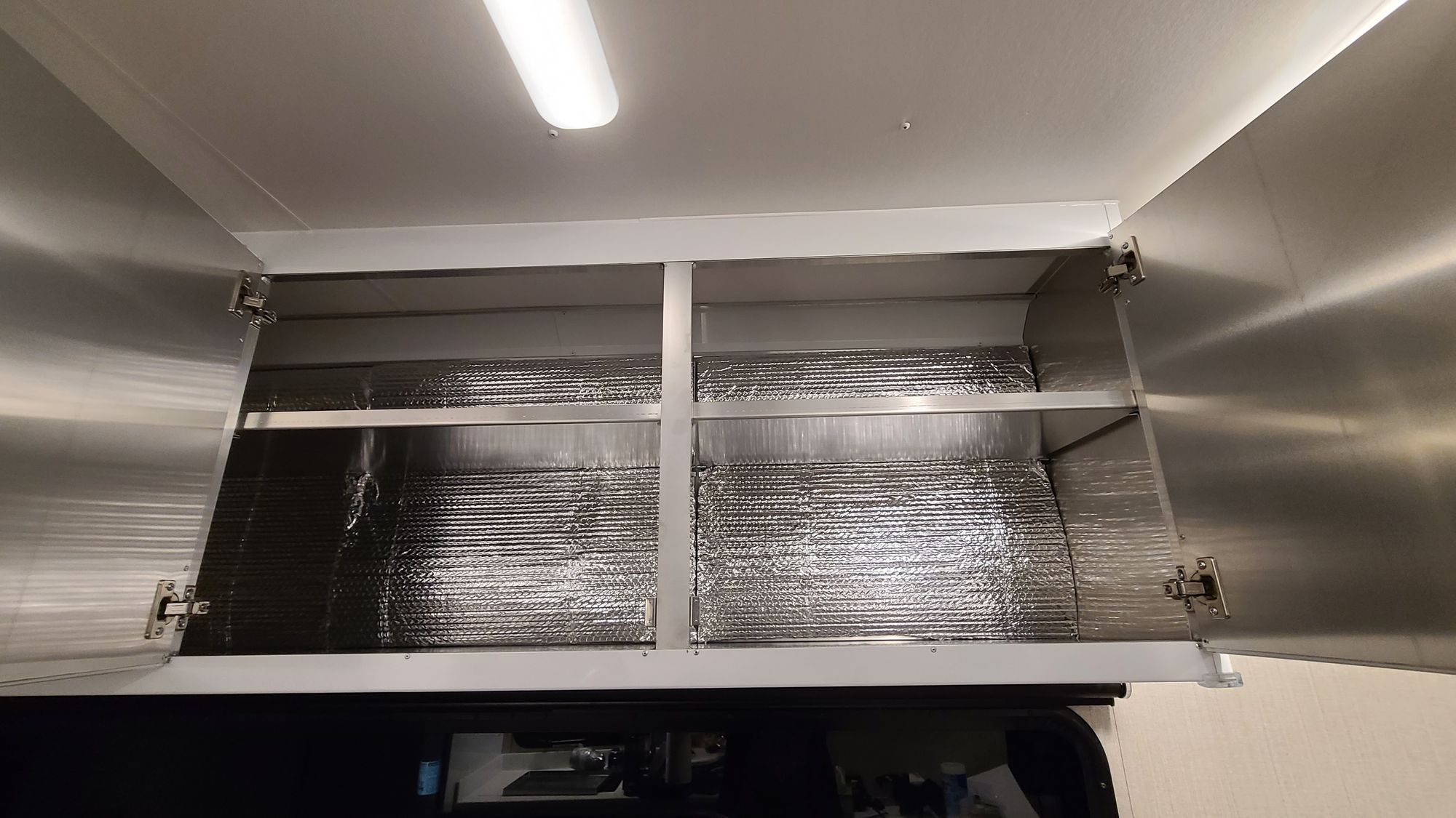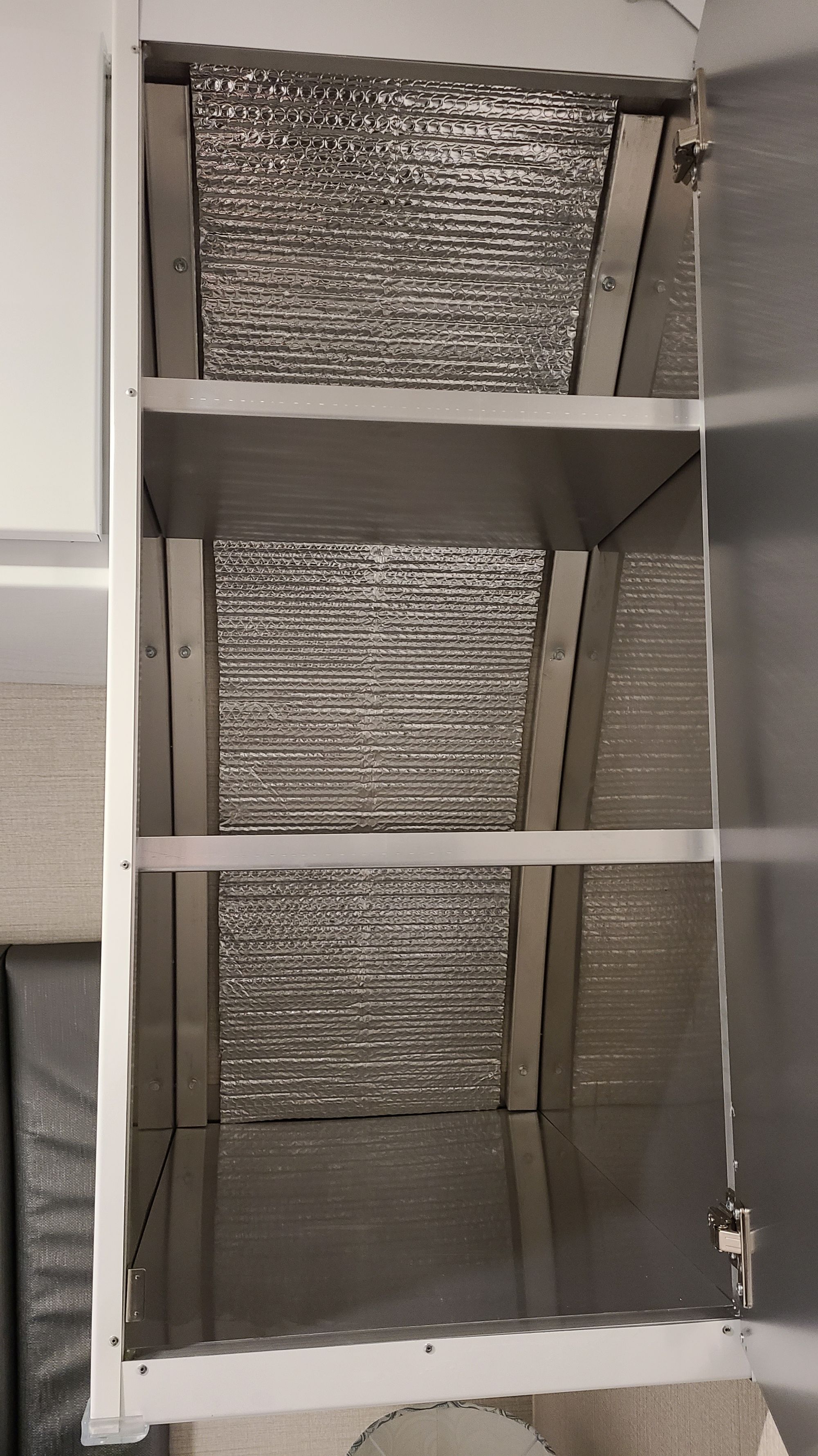 The next step was to add Reflectix to the backs of all the cabinets. Reflectix is a foil insulating material that regulates temperature by reflecting radiant heat. It's often used on windows for this purpose, but it can also be handy to use as an extra barrier against a wall, for added insulation. Since I was going through all the cabinets already, I also took this time to cut rubber drawer liners to line each cabinet and drawer. This is mainly so items will slide less in transport, but the extra rubber layer certainly can't hurt when it comes to temperature control.