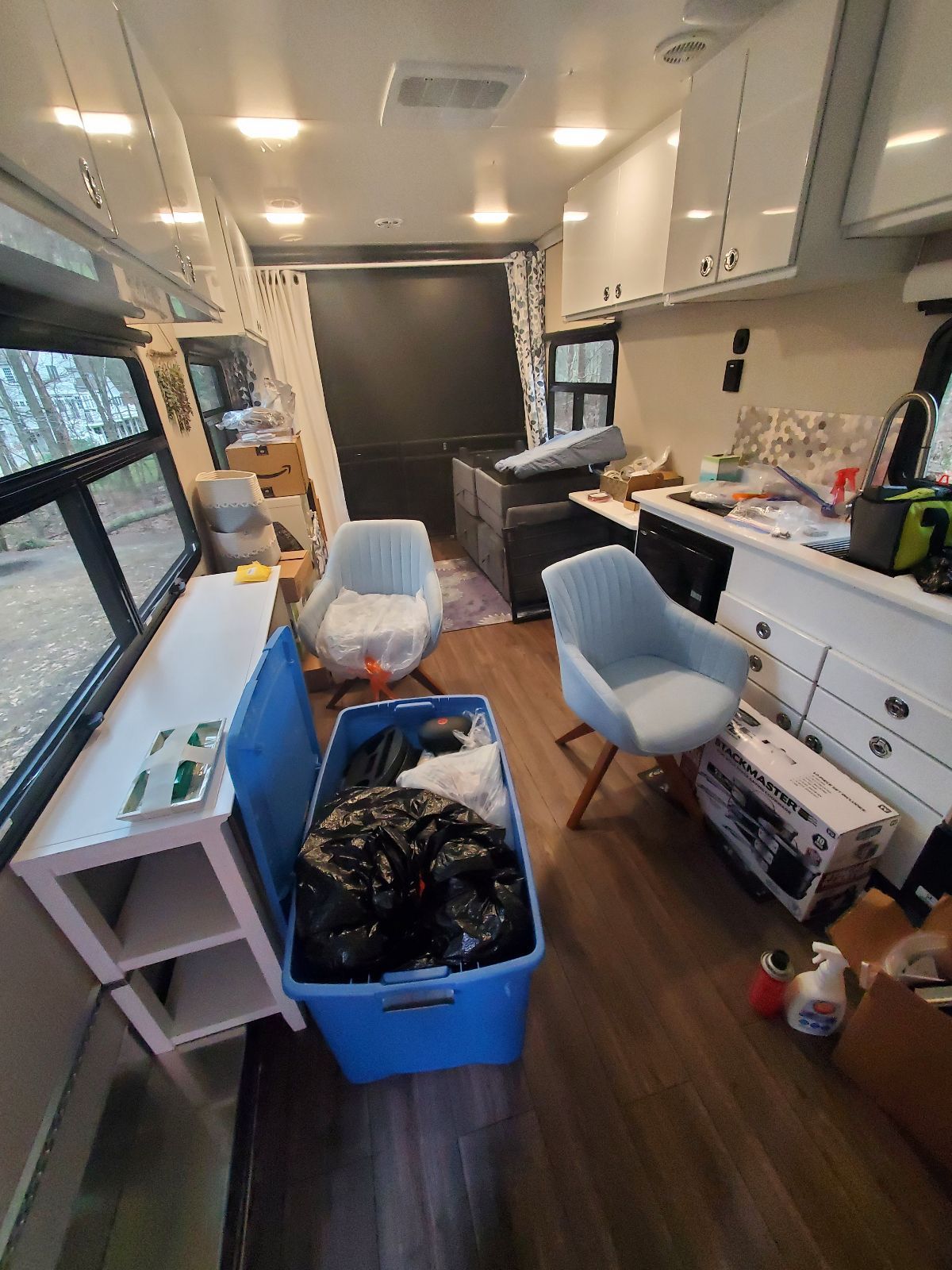 We weren't sure how this would work at first. Once we got everything out of our house, we were overwhelmed by how many boxes and bins we had, filled with stuff we thought would fit in the RV. This is only half of it, as the other half spent a few days taking up space in my parents' garage: