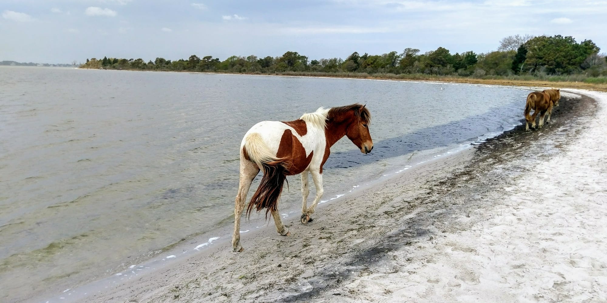 The coast of MD is exquisite. A quarter of the state is covered in water, and much of that water includes bays and rivers that run right between the landmasses. Fun fact: MD is the only state without any manmade lakes. Who needs them when you've got the country's largest estuary, the Chesapeake Bay? Assateague Island is the northern part of a long, skinny coastal island, connected to the southern portion, Chincoteague Island, which is in Virginia. The scenery is beautiful, with the ocean, marshes, and inlets. But these islands boast a unique feature: wild horses. Well, they're wild now. Once upon a time, their ancestors probably were owned by humans, but now these horses call the islands their home, and on Assateague, they are treated just like the other wildlife you might see: birds, deer, rabbits, squirrels, and turkeys.
