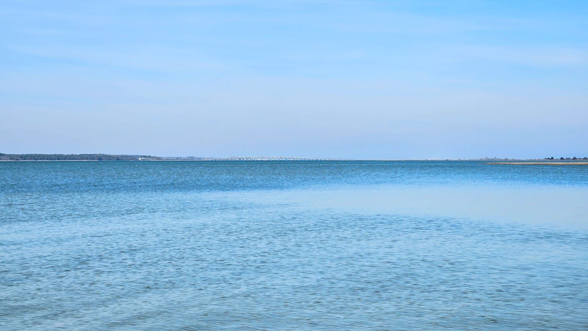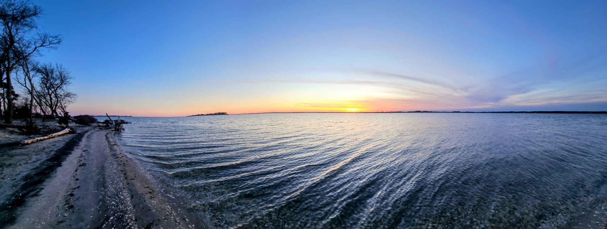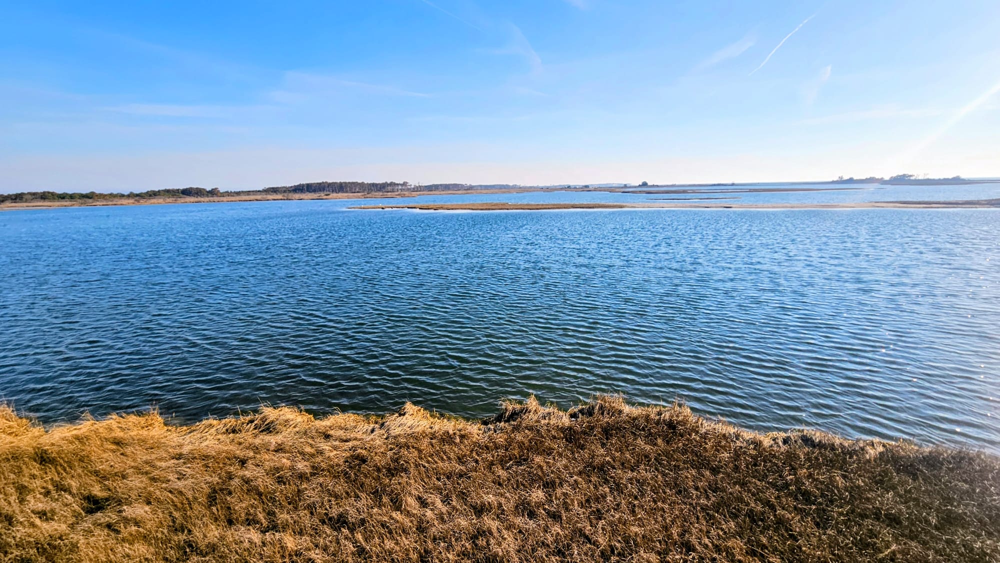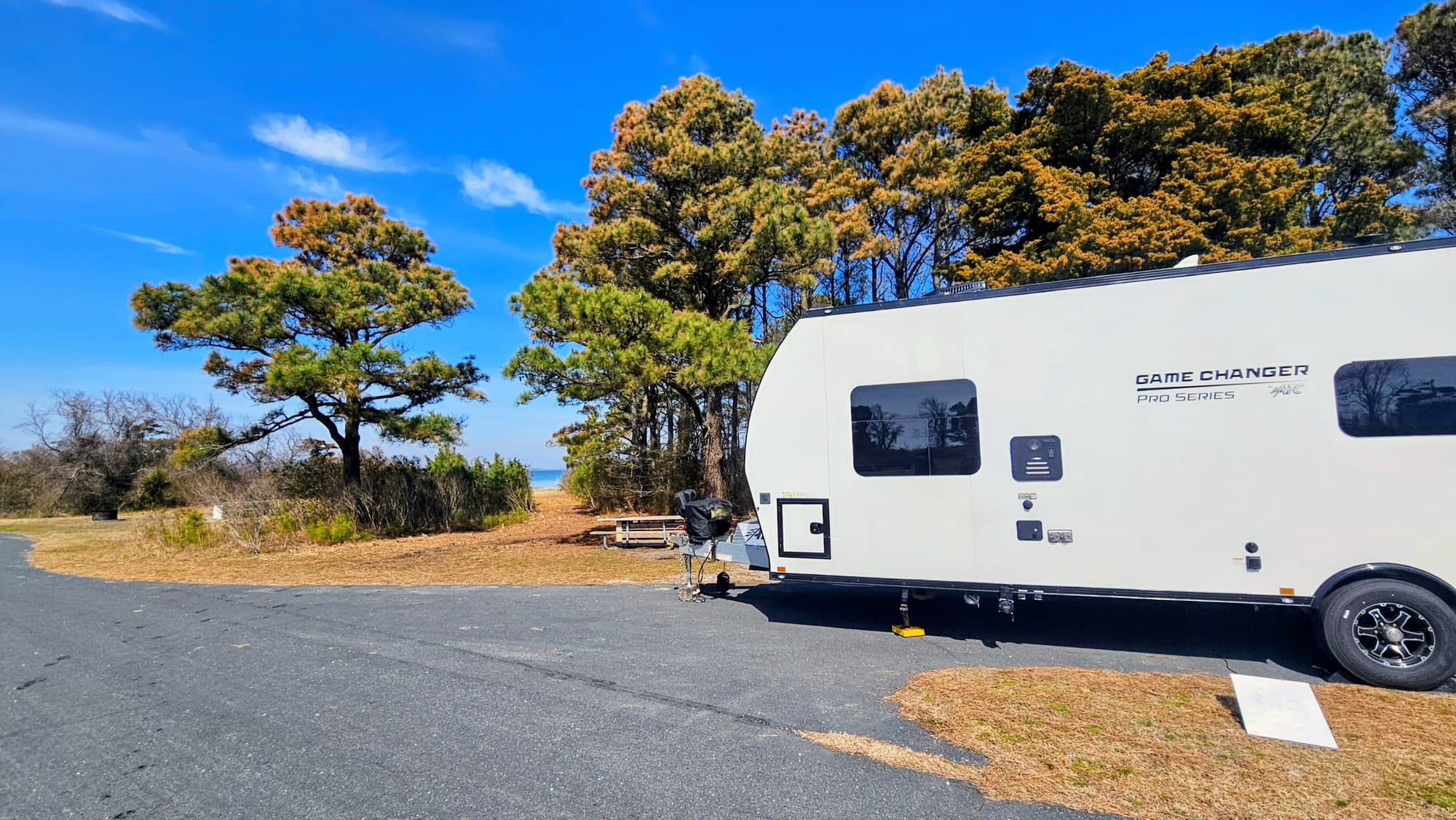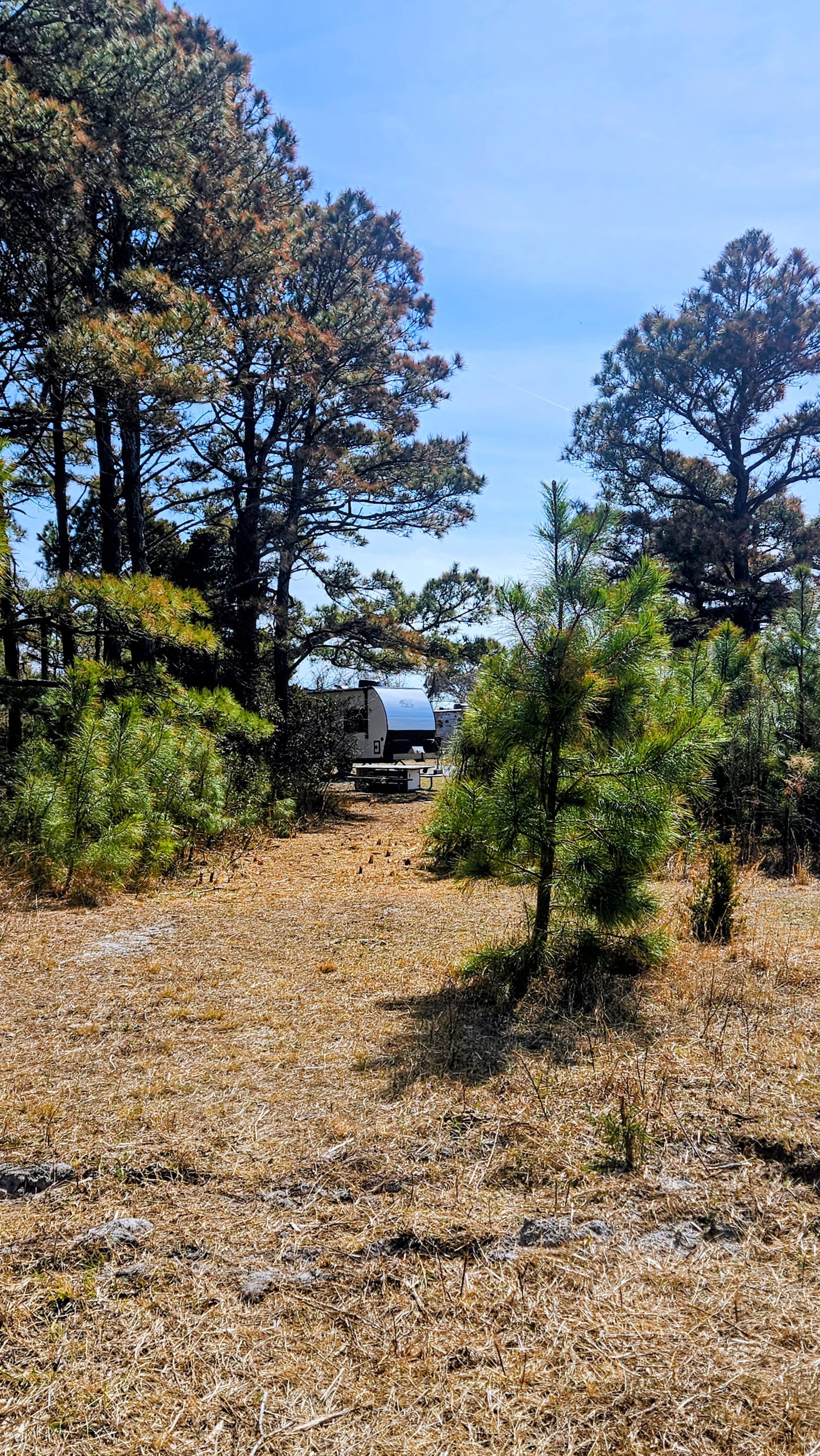 The Bayside campsites are tucked away on their own side road and have lots more space. Many have beautiful bay and marsh views. After intense due diligence while scouting sites online, I found a campsite that even had water access. Site C45 β a large pull-thru with a pleasure-side yard nestled under the trees, and a short path straight to the bay, with distant views of the bridge to the island. Situated right across from the bathrooms and dumpster, and only a few minutes' walk to the Life of the Marsh Trail and Heart Beach.