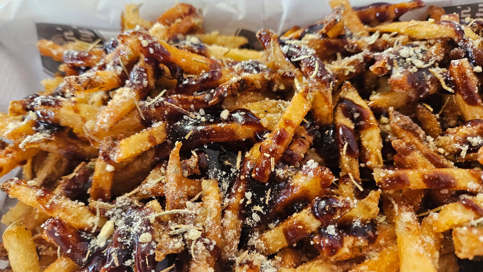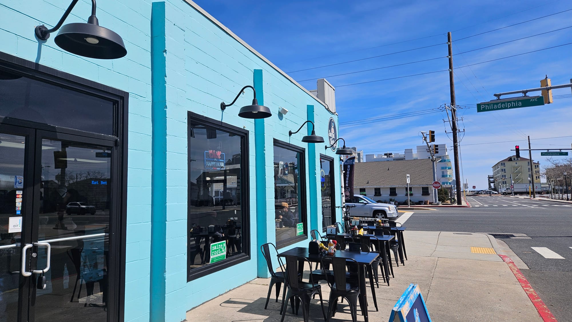 We grabbed lunch off the boardwalk where there were more options for open restaurants β and warm, indoor seating. We chose Surfin Betty's Burger Bar after Anthony successfully convinced me that he didn't want seafood yet and was waiting for Florida. Alrighty then. American food it is! Except this wasn't your typical American food. Everything was freshly made, high quality, and had a unique spin to its flavoring. Vinegar fries are big in this region of the country, and they take it a step further with their goombah fries, hand-cut and topped with rosemary, parmesan, garlic, and balsamic vinegar.