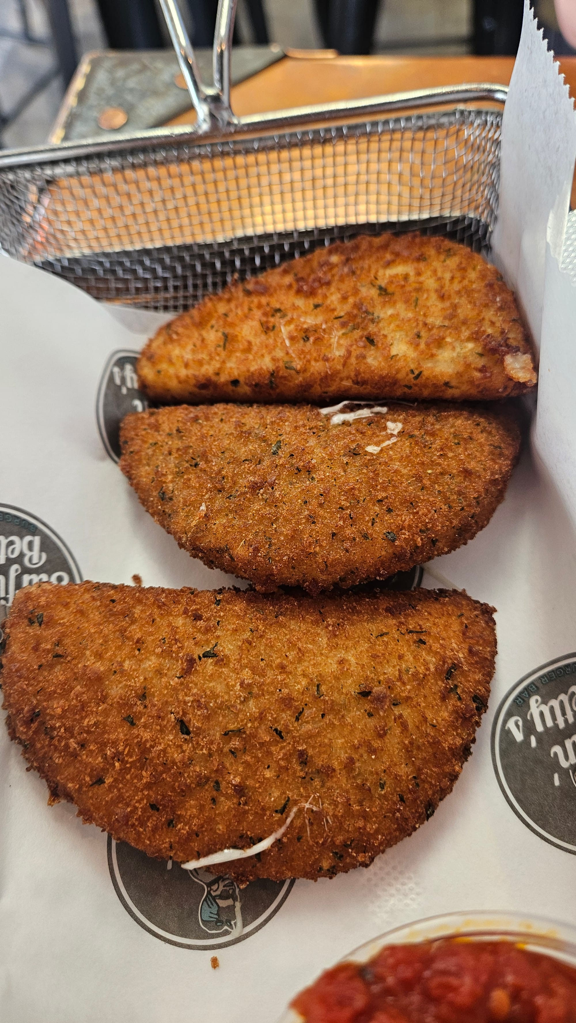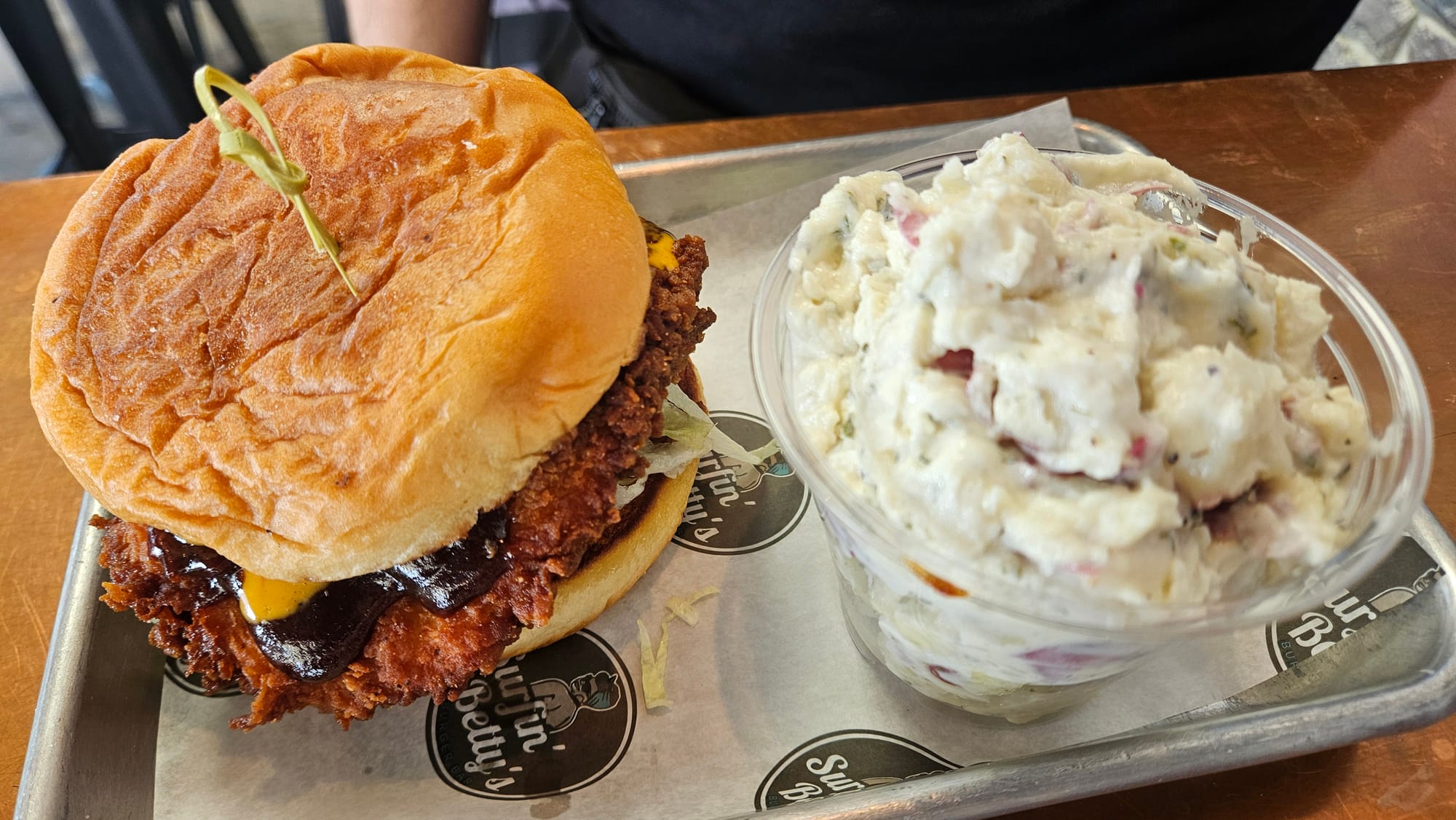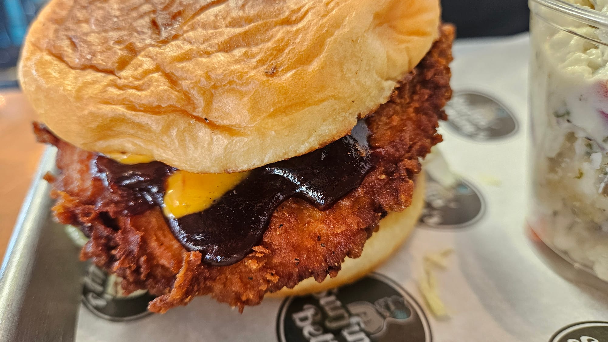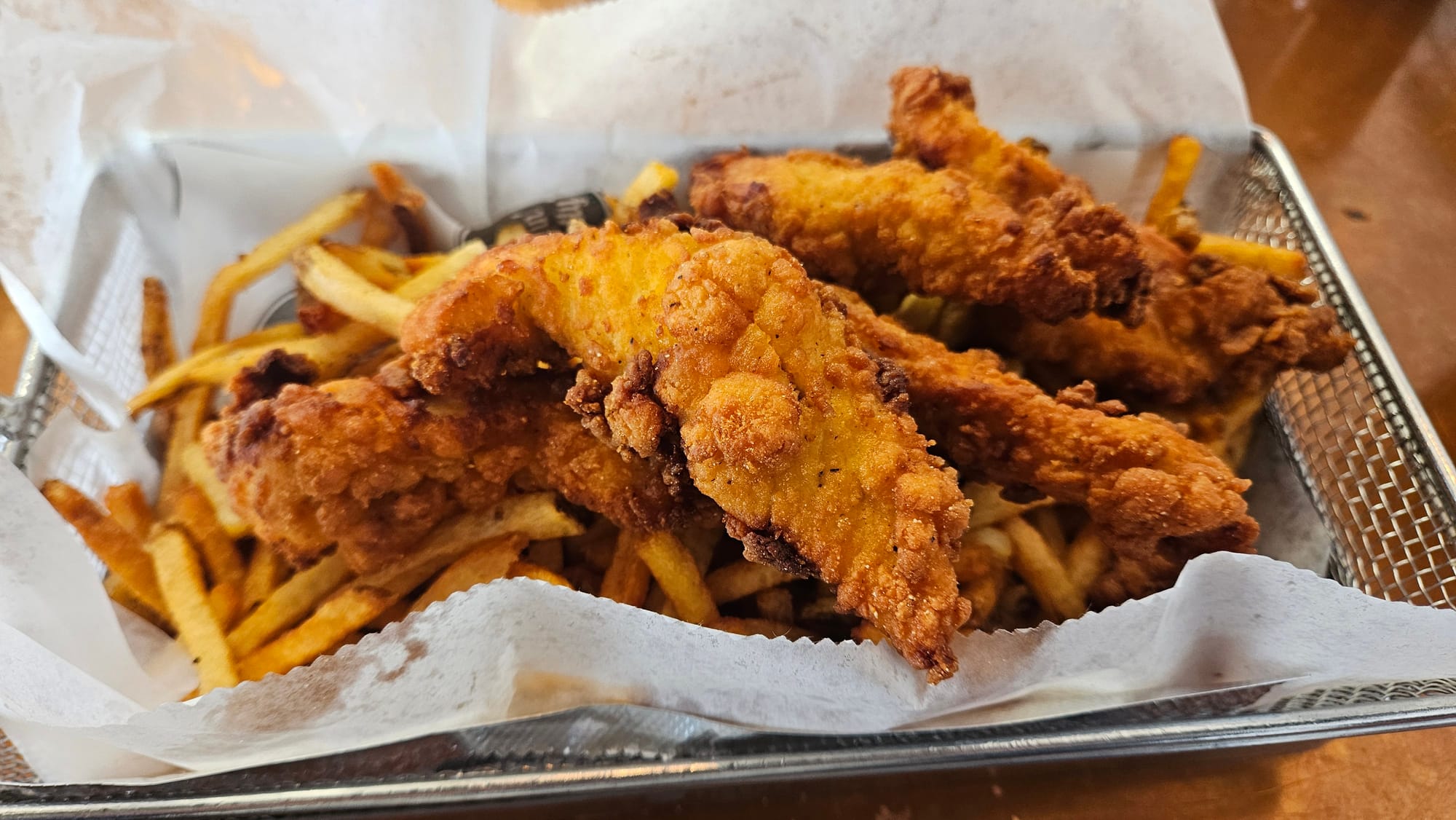 We also ordered the boom boom chicken sandwich with potato salad, chicken tenders (and were surprised that they came with more fries!), and mozzarella moons. All really well-cooked, especially the fried items, but we get the feeling that the specific flavorings won't be to everyone's taste. The mozzarella moons were very herby, and the chicken tender batter was a bit salty. Overall, though, we enjoyed our meal.
