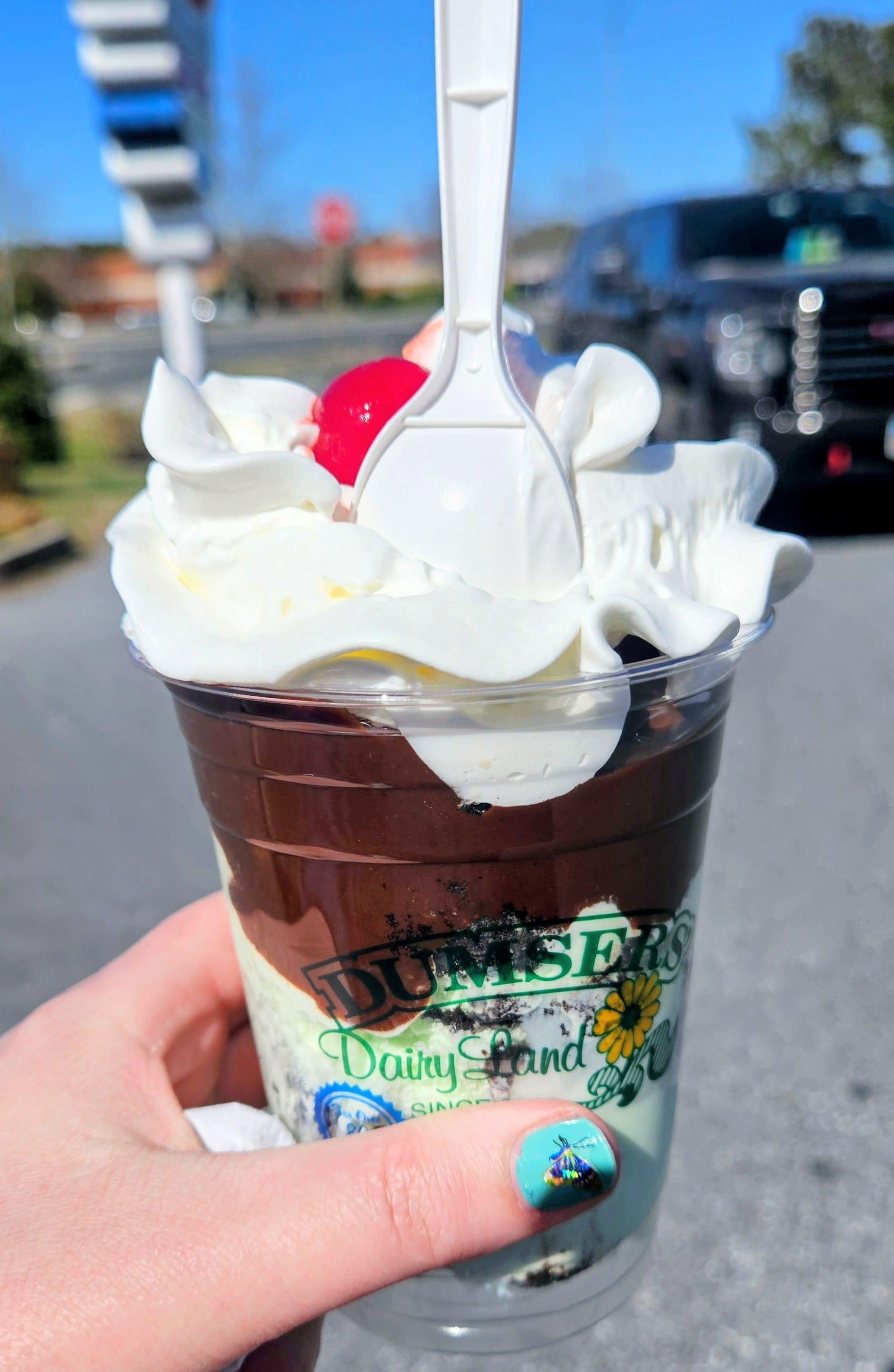 On our way out of Ocean City, we stopped for ice cream at Dumsers Dairyland. They have a location right on the boardwalk, but it was closed for the season. This location is west of the shore and is on the main strip of shops and restaurants β very Suburbia. Anthony got a soft serve twist waffle cone (not pictured because it was about to fall off the cone and required immediate plundering). I got a small hot fudge sundae with Mint Oreo ice cream. It was all fine, but we've had much better ice cream in other places. If we could do it again, we'd pay more patronage to Betty's Burger Bar and end our meal with milkshakes from there.