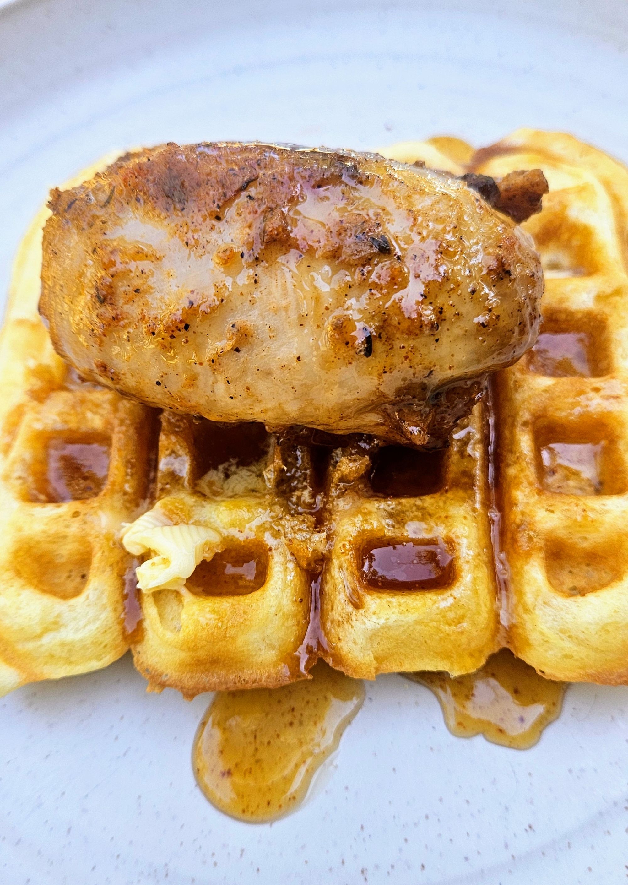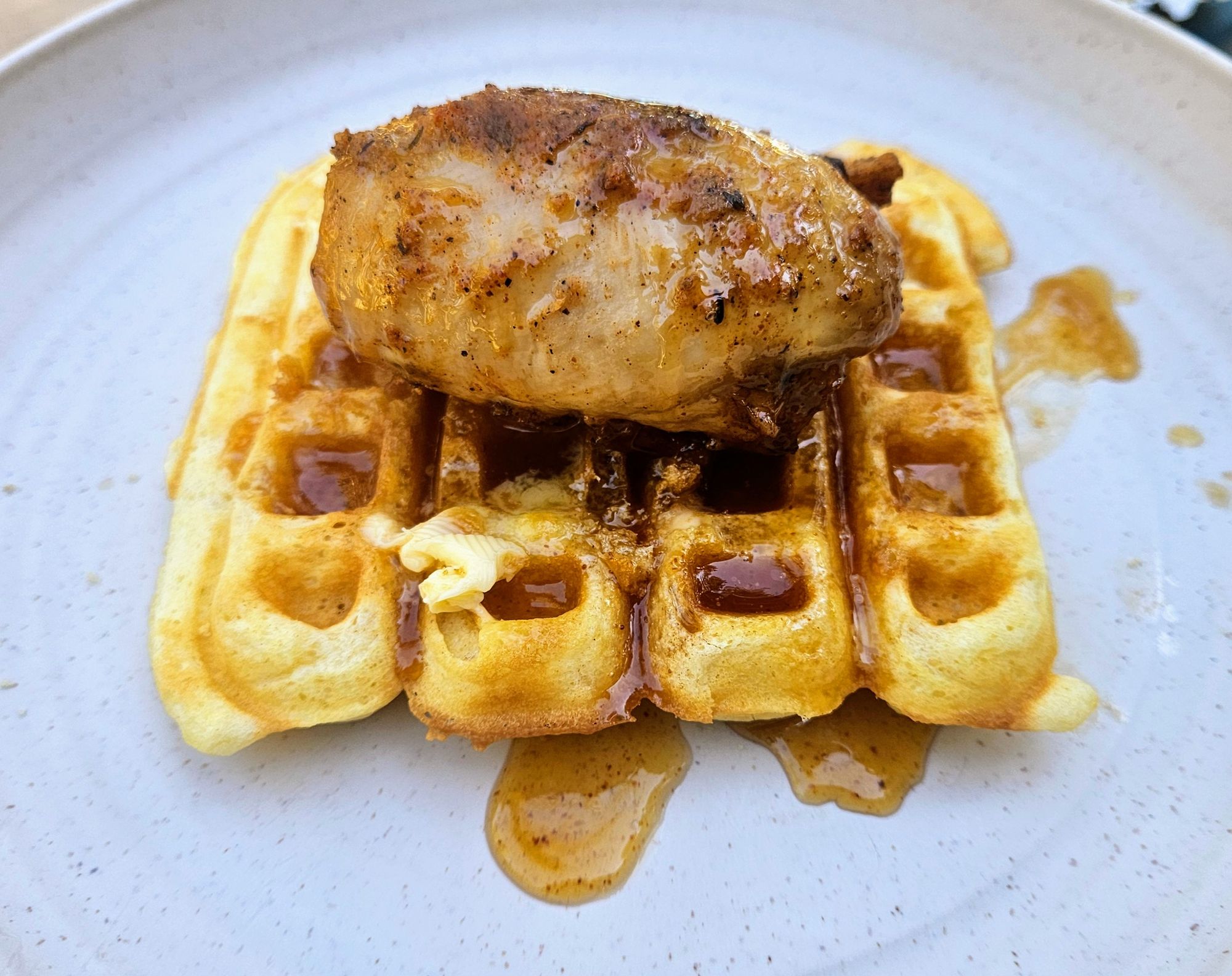 So there we were, in the 11th hour, with all other goals completed, wondering if we should brave the heat and put down the patio. We opted to cook breakfast instead, because at least then it would only be in the 80s and not 90s like it would be at dinnertime. We had some leftover air-fried chicken thighs and decided to make a Sunday brunch of chicken and waffles with hot honey drizzle. Pro tip: If you're eating outside and there are bees, don't eat anything with honey. That said, it turned out great, and finally having the patio down again was wonderfully relaxing...at least when the sun wasn't beating down on us.