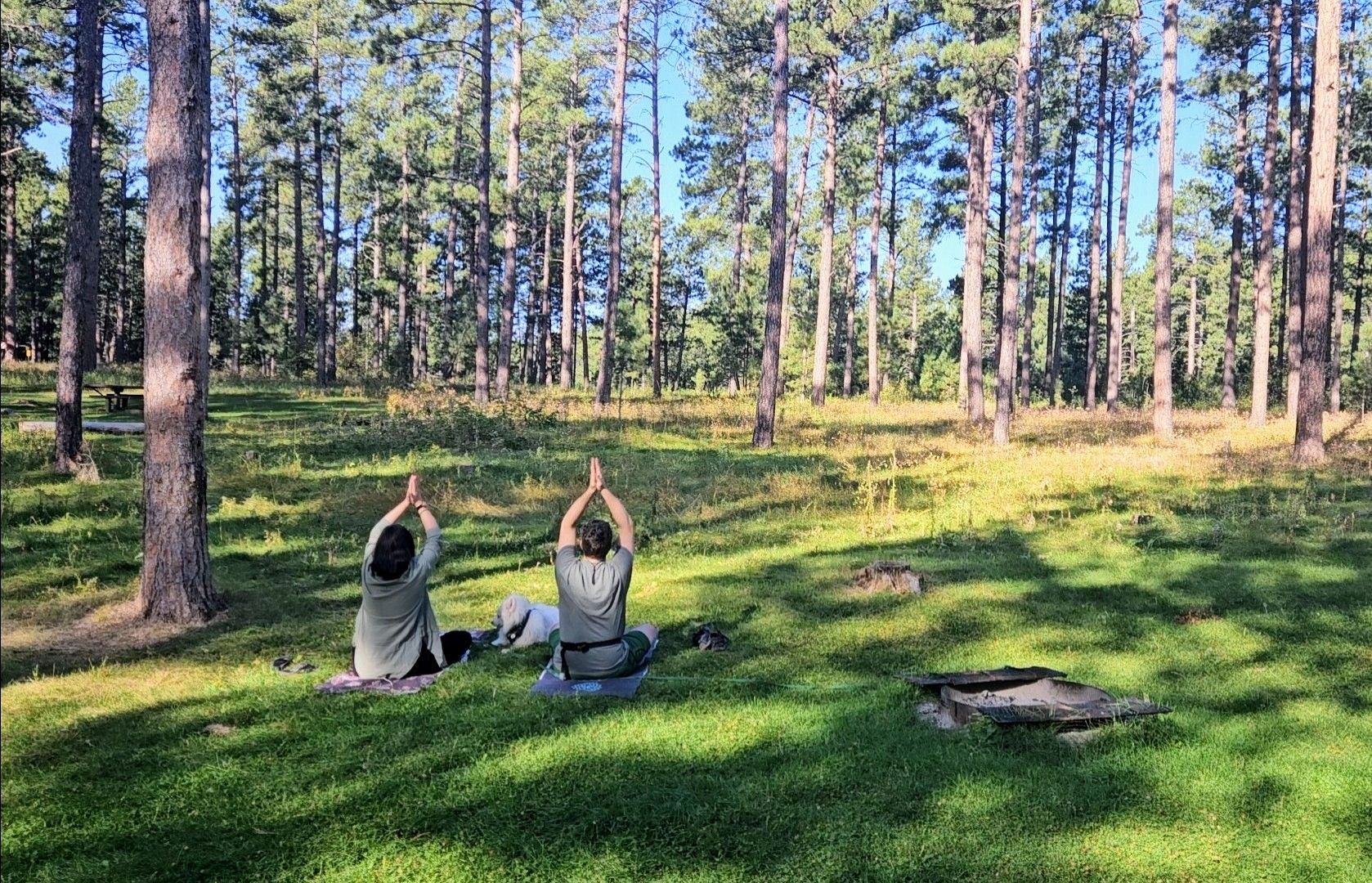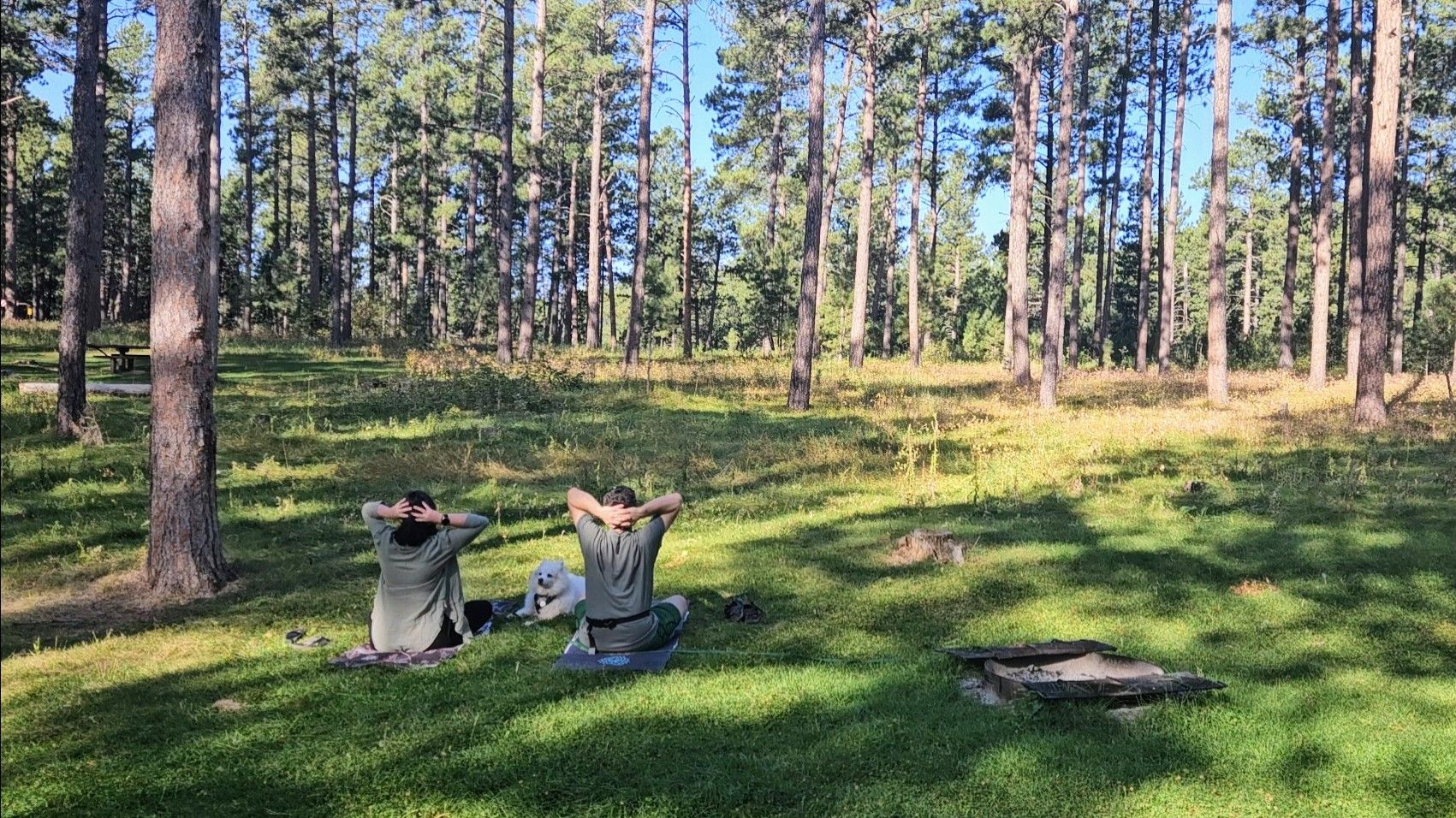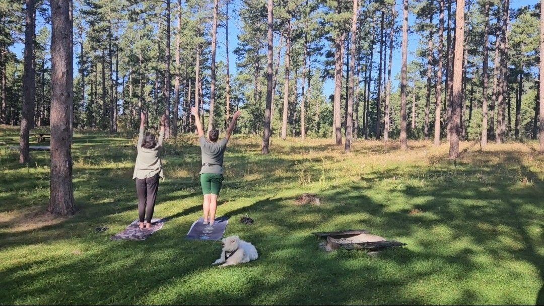 Another seemingly easy check mark to achieve, and yet, we didn't even get our mats out the door until our final week of summer. Any day that was nice weather, we opted for hikes instead. After all, we were trying to accumulate 100 miles in 3 months. I try to do at least a little yoga every morning, and boy, when I can bring my mat outdoors in a scenic campsite, it's so wonderfully peaceful, but this summer just wasn't working in my favor. It's unfortunate because, as you will soon see, we had our fair share of campsites with a view - like, some of our best views ever - but we settled for less scenic and more serene. Nothing wrong with that! Our last site of summer was in Black Hills National Forest in South Dakota, and we had a spacious site in the woods, surrounded by tall ponderosa pines. What a beautiful setting to finally enjoy some asanas. Tanner was happy with the cool morning, too.