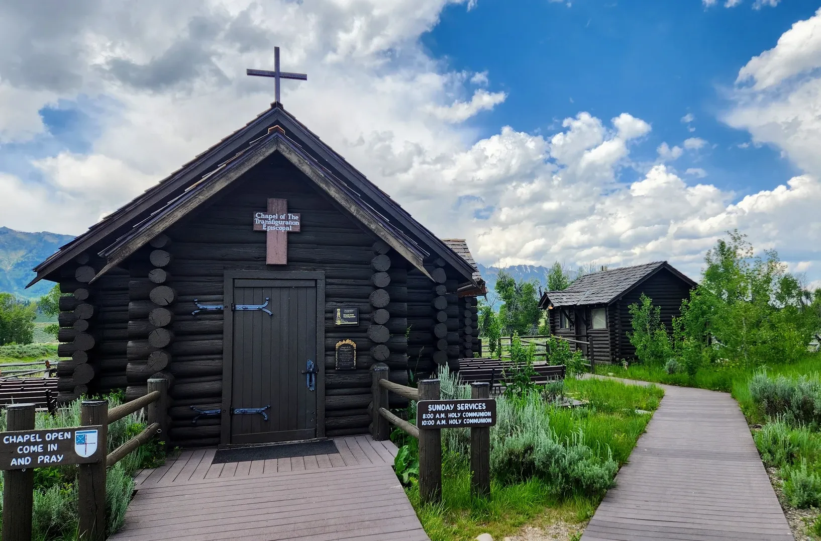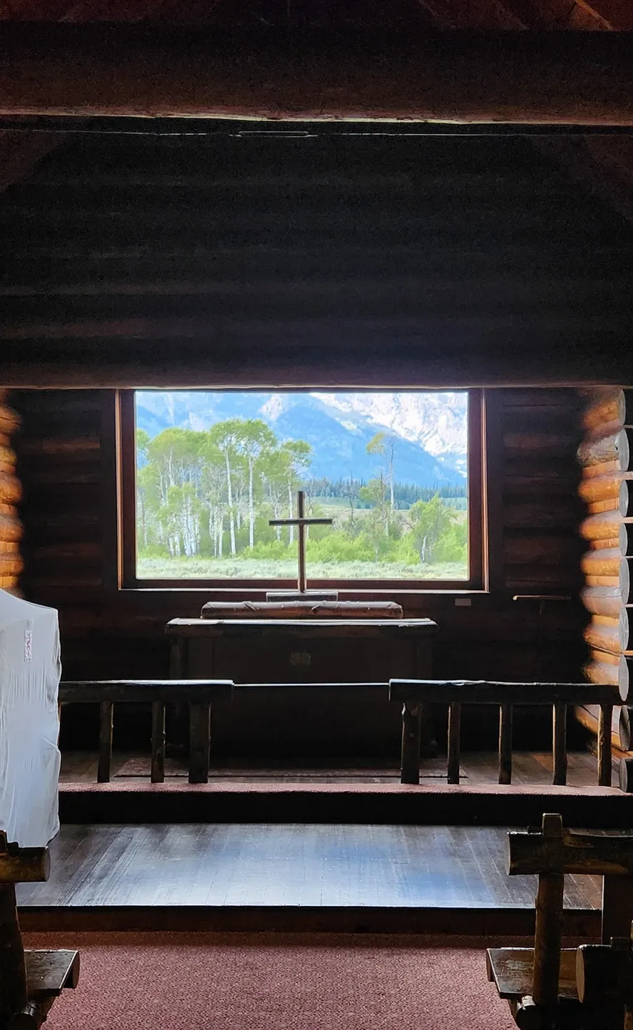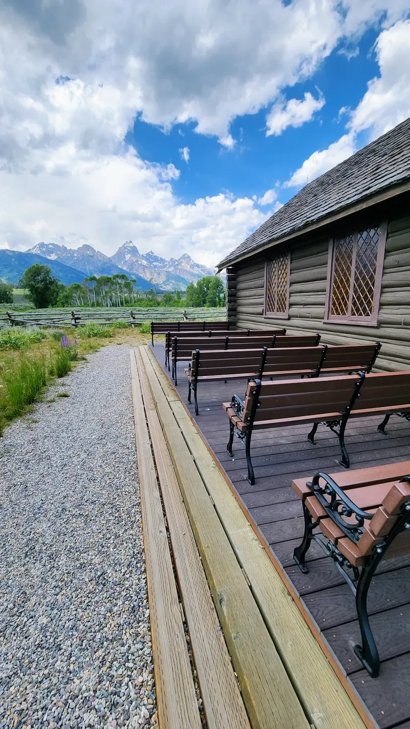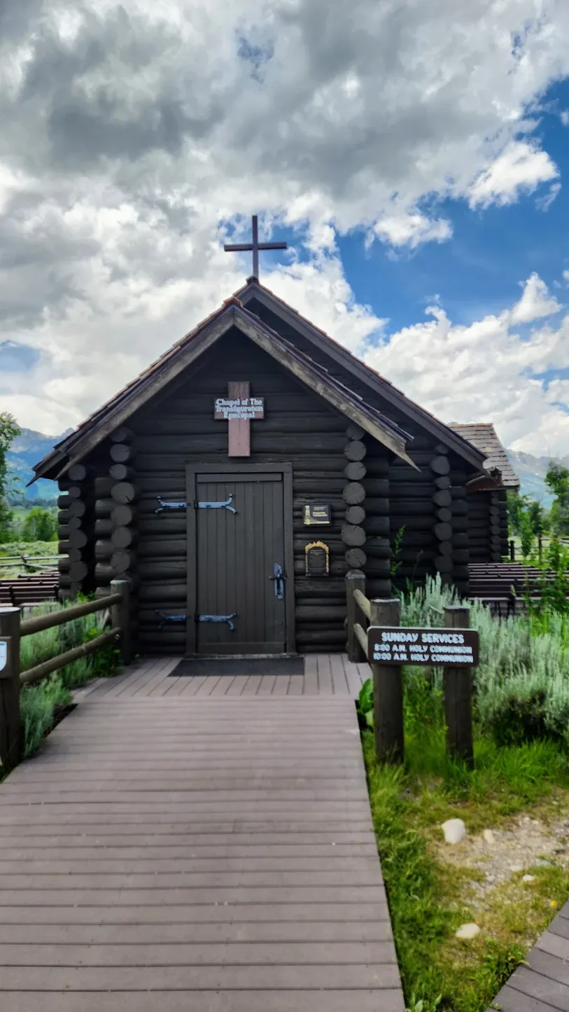 Thankfully, once we got on our new route and were no longer retracing our steps, things started looking up. We were able to venture up Route 191 over to Teton Park Road and stop at the park's visitor center to grab our 17th National Park pin. The tour took us past the Moose entrance that was closed, and before we knew it, we were back on our originally planned route. We listened to the couple of stops we missed and then started following the guidance. We were led down a side road to the Chapel of the Transfiguration, an Episcopal church that was built so the settlers in the area could worship without needing to go all the way to Jackson. Right away, we were thankful for the audio tour, because this was a place we probably never would have stopped on our own, and it was gorgeous. The church was built specifically to highlight the view of Teton Range. Instead of a pulpit with stained glass and ornamental designs behind it, there is a large window, so the mountains become the art. Brilliant. Visitors are allowed to walk the grounds and enter inside the chapel, and we even saw a sign that they still hold Sunday communions there. We imagine it gets fairly crowded, because in addition to the pews inside, there are also rows lining each side of the outside of the chapel.