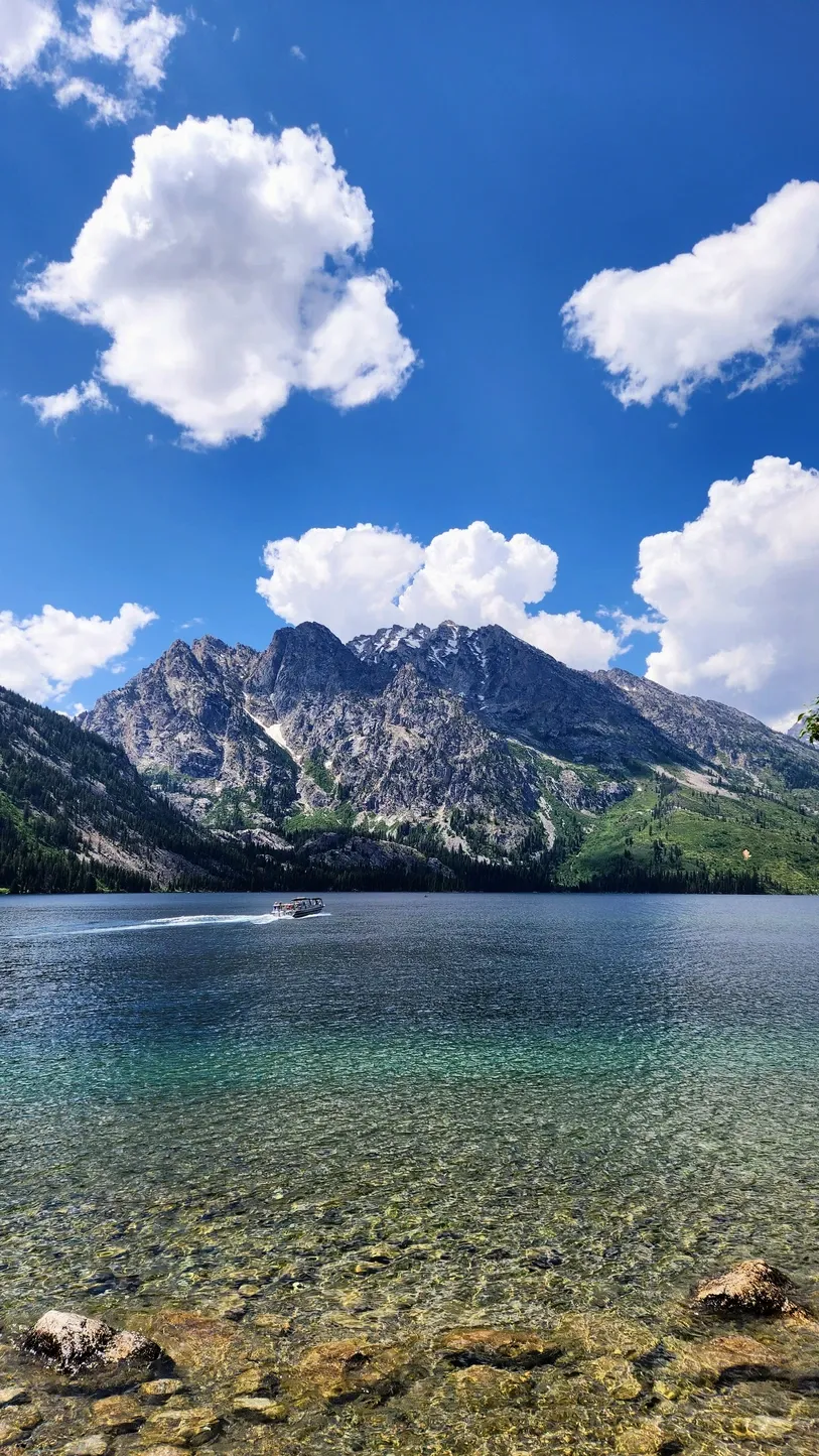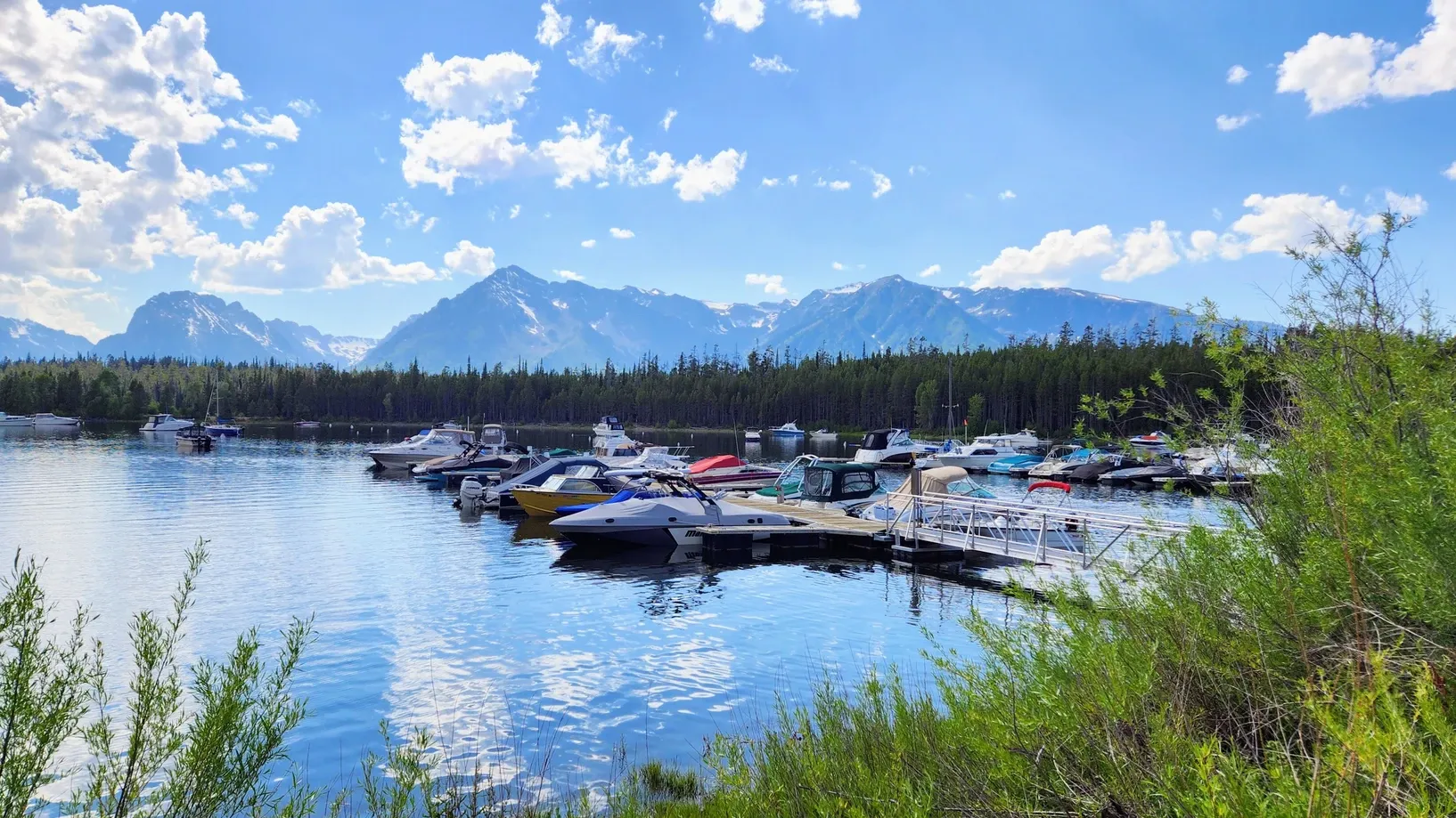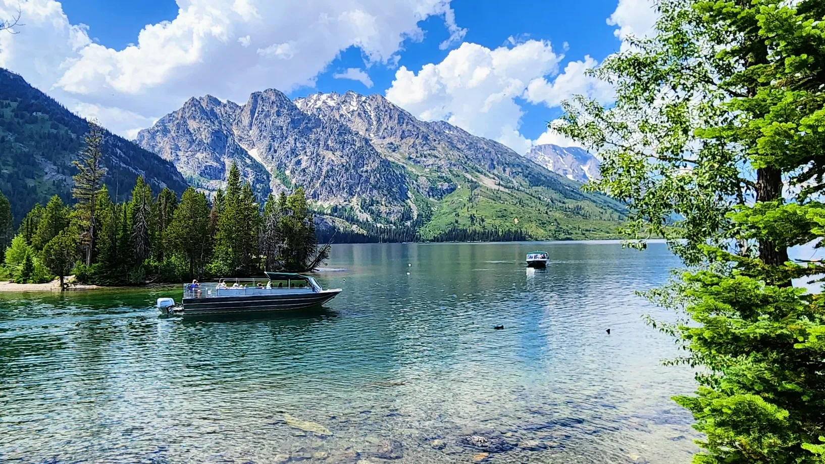 The tour took us past several overlooks, where we learned the names of all the peaks in the range, with of course, the highest being Grand Teton itself. Then we approached lines of cars and realized that we were entering the territory of what is arguably Teton's most popular attraction, Jenny Lake. We learned that the lake was named after a Native American guide. We lucked out by finding an open parking spot near the visitor's center and took the short walk to the lakeside, which was hopping with boaters, swimmers, and loungers. We walked about a mile along the shoreline trail before heading back to the truck. Our little adventures in fresh air were most welcome, so we could break up the drive time.