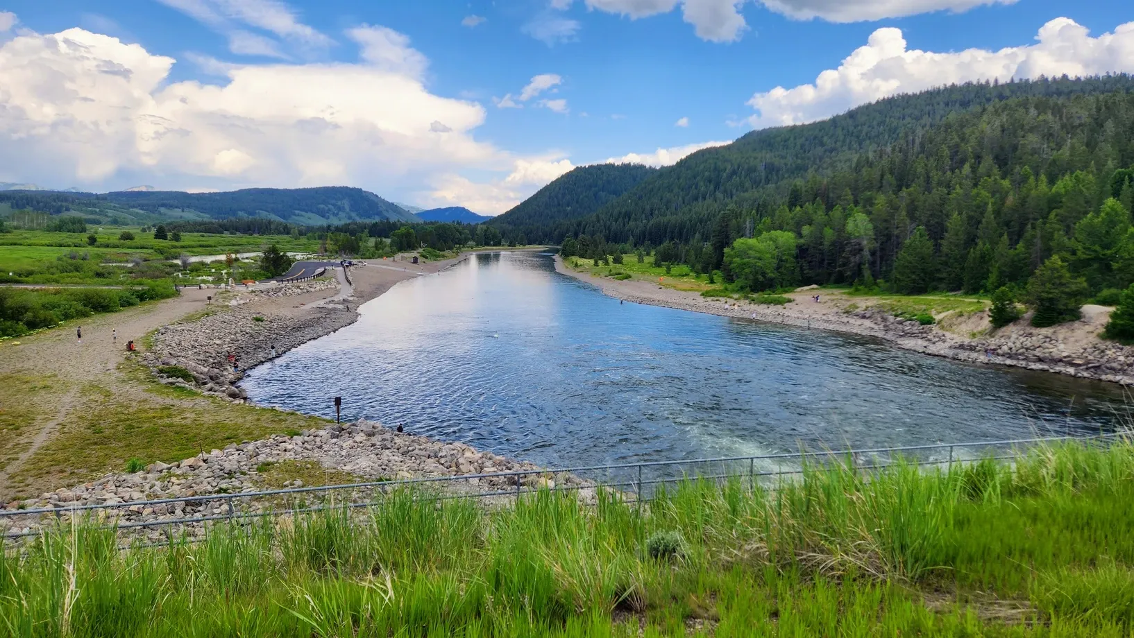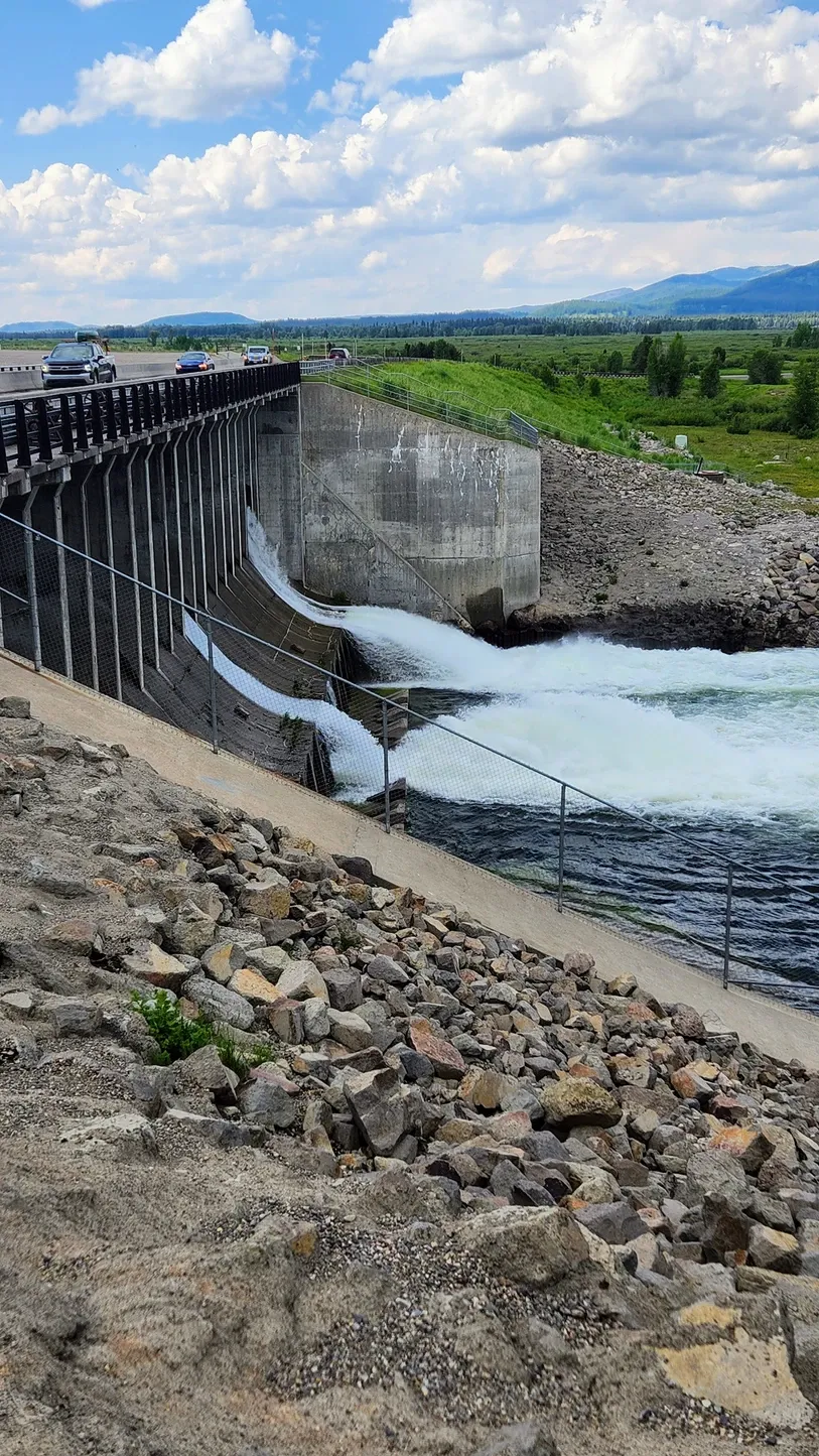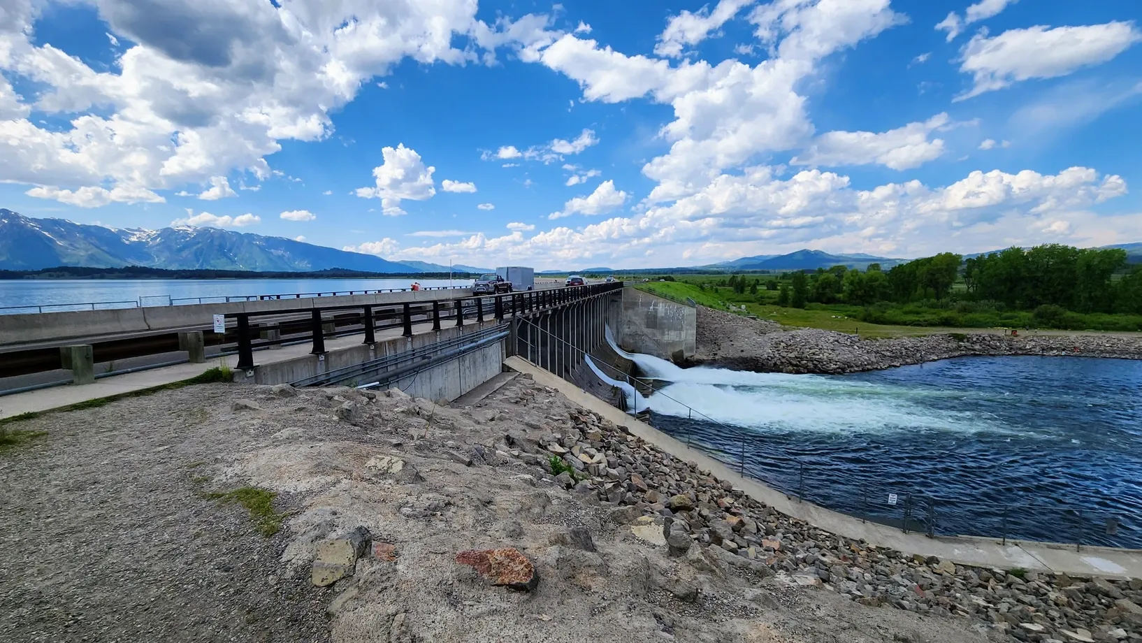 Continuing north, we went past Mount Moran and Jackson Lake. Still trying to figure out when the audio for these tours was made, we were told that Jackson Lake was dismally low. We all know that this past winter was a gift to water levels, so when we drove by, the lake was sparkling with plenty of blue water. We also saw lots of water in the Jackson Dam spillway.